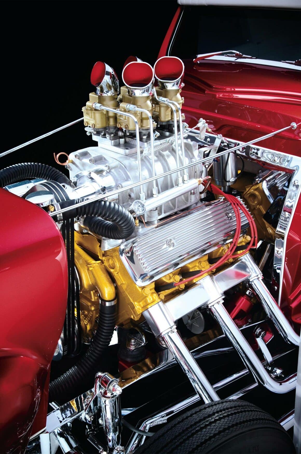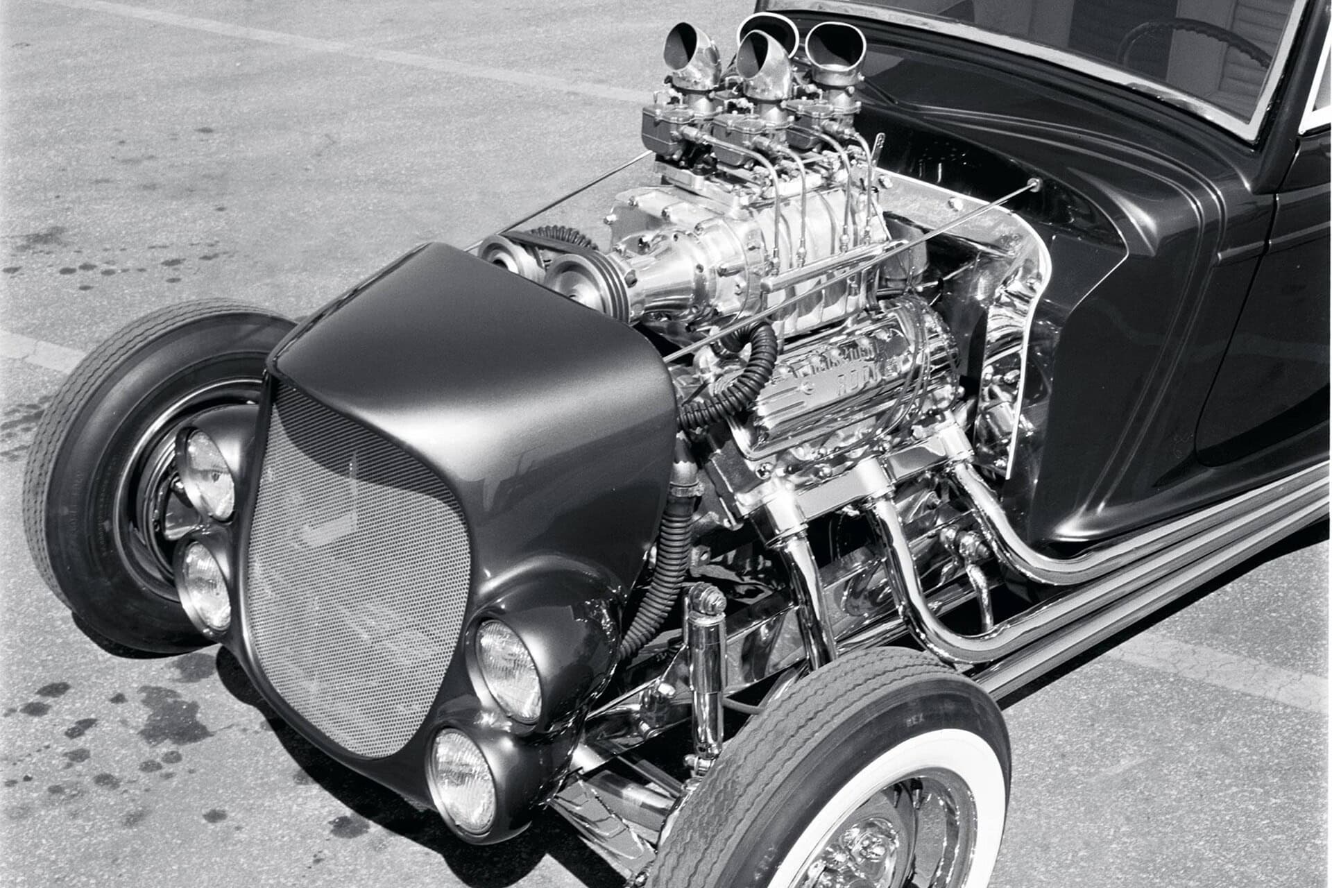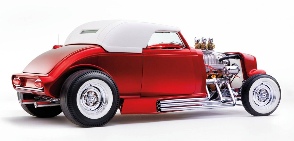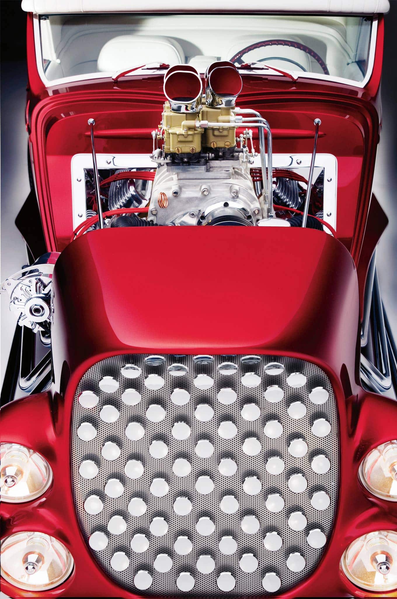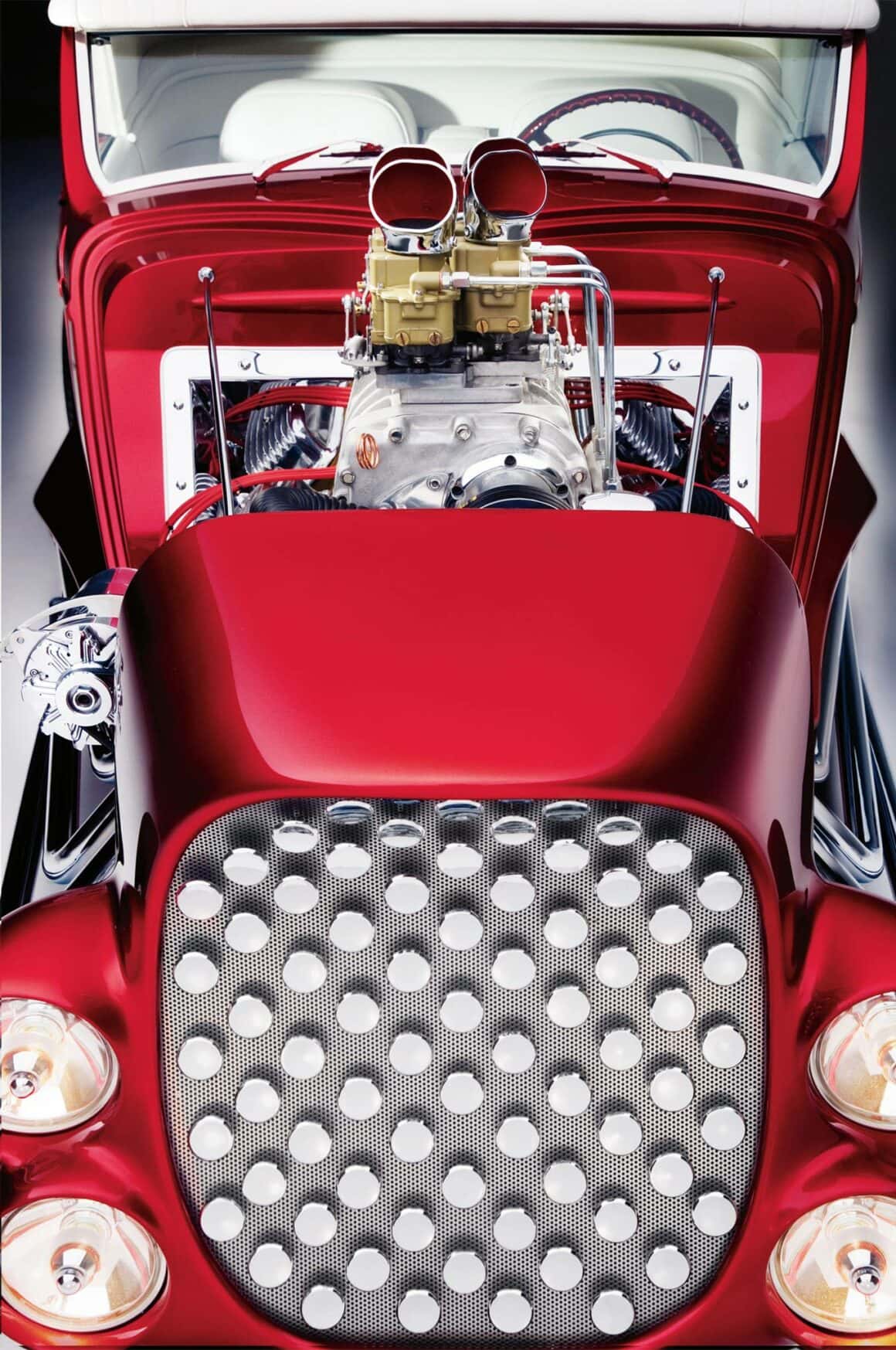 Vinnie Pezzino, Danny Braun et Steve Simons ont préparé la voiture en interne. Barry Rice a appliqué la Sherwin-Williams Planet Color ; Il se compose d’une base dorée avec une superposition rouge translucide. “Les seules couleurs que nous avions étaient celles de la couverture d’un magazine”, explique Borneman… La couleur exacte de la peinture utilise le système “wag”… Mad Scientist Header Coating à Union Springs, New York, a recouvert les collecteurs, les tuyaux d’échappement et les silencieux. Placage chromé personnalisé avancé à Erie et Frankford Plating à Philadelphie a tout poli et plaqué, y compris les tuyaux latéraux. La voiture est remontée avec un harnais American Autowire Highway. Don a fait démonter, plaquer et remonter un ensemble de roues Mercury de 1948 avec les jantes d’origine de 5 pouces inversées pour l’avant et avec des jantes Buick de 7 pouces inversées à l’arrière. Les pneus sont des5,90-15 BFGoodrich Silvertown. Les pneus avant mesurent maintenant 5,60-15… Une fois terminé, l’équipe de Borneman a couronné le Hot Rod recréé en installant la maille en acier inoxydable perforée dans l’ouverture de la grille avec 72 boutons.