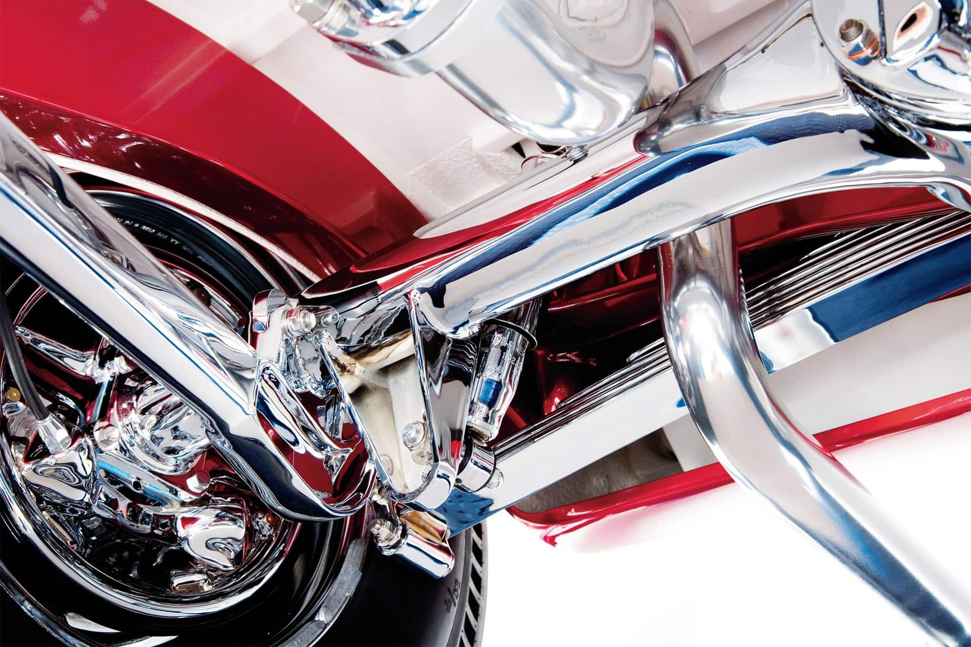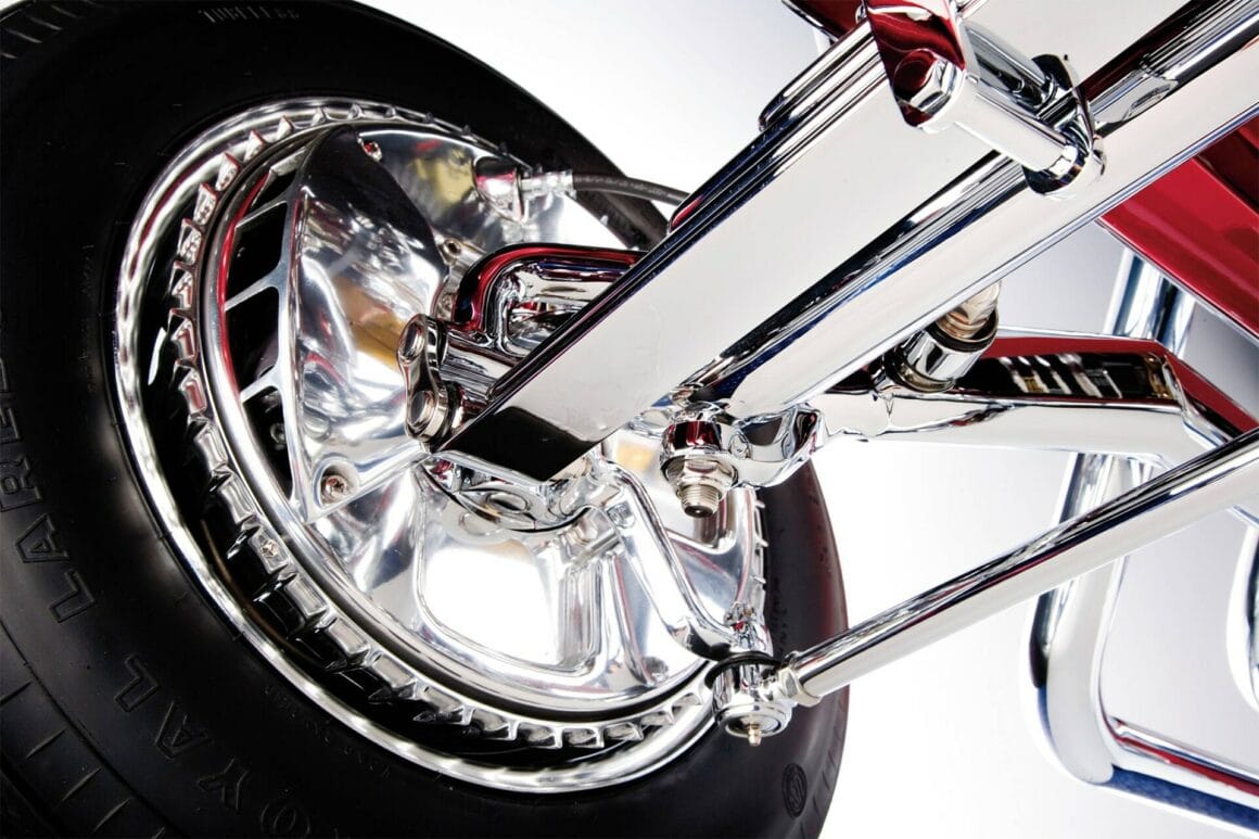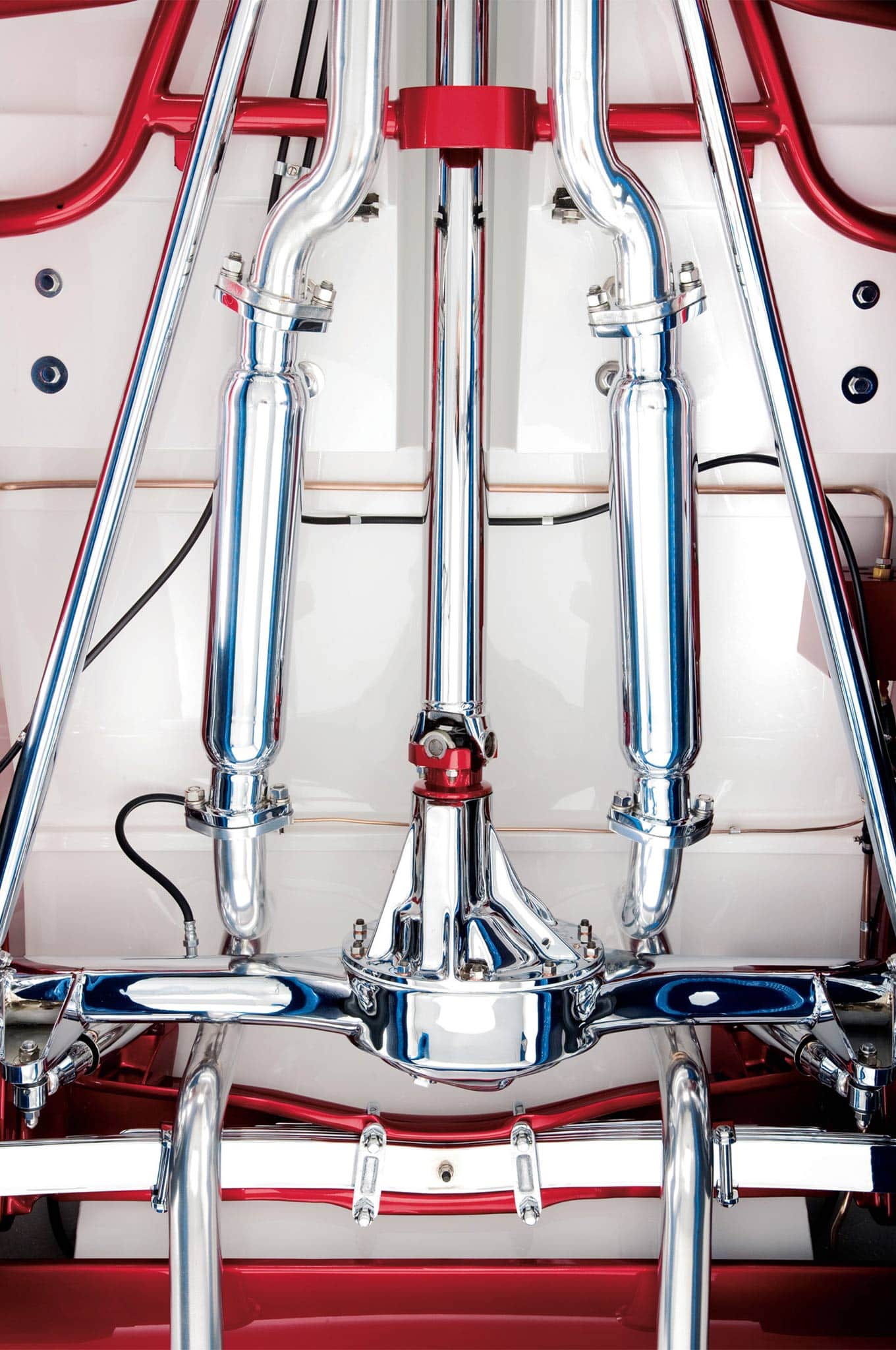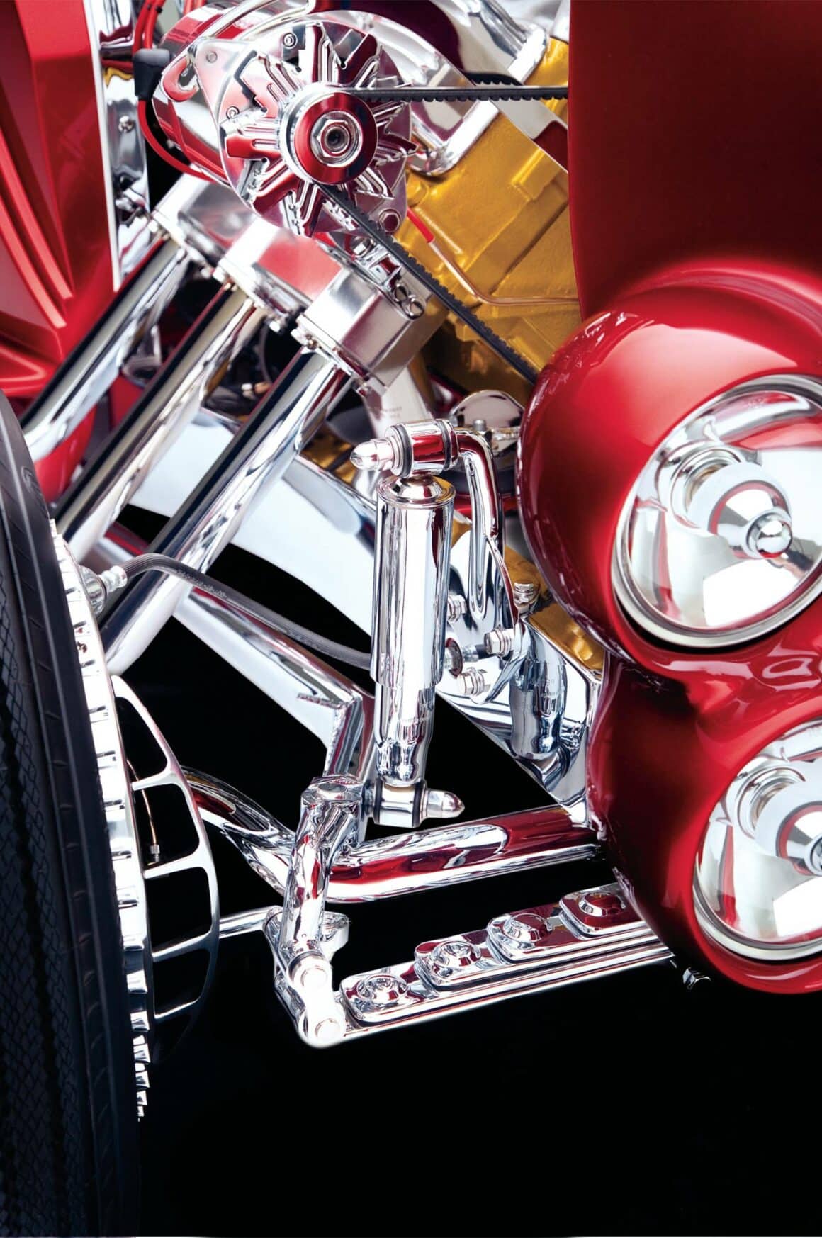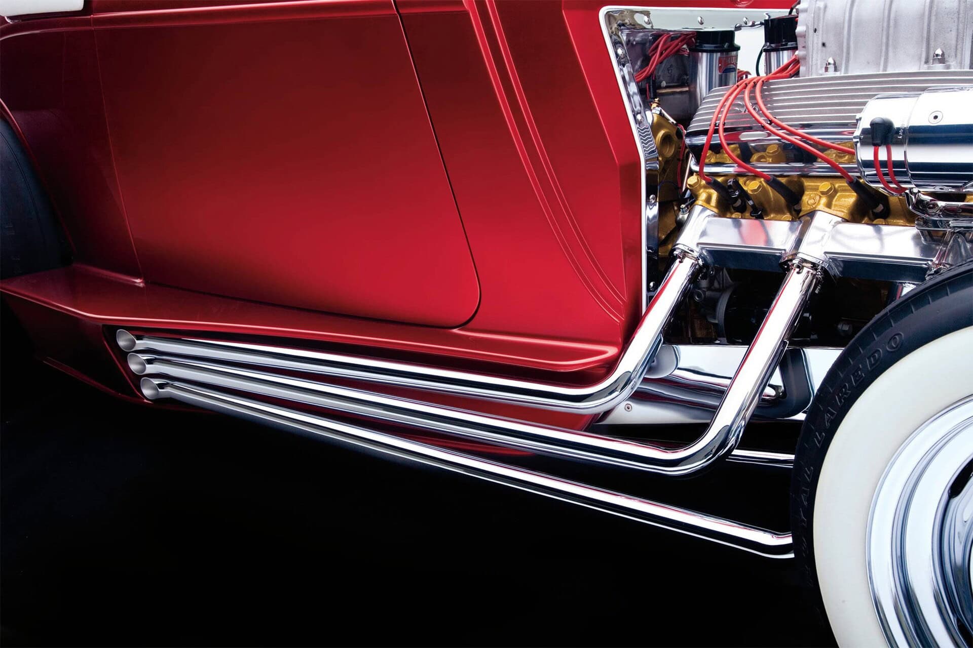 Vinnie Pezzino, Danny Braun et Steve Simons ont préparé la voiture en interne. Barry Rice a appliqué la Sherwin-Williams Planet Color ; Il se compose d’une base dorée avec une superposition rouge translucide. “Les seules couleurs que nous avions étaient celles de la couverture d’un magazine”, explique Borneman… La couleur exacte de la peinture utilise le système “wag”… Mad Scientist Header Coating à Union Springs, New York, a recouvert les collecteurs, les tuyaux d’échappement et les silencieux. Placage chromé personnalisé avancé à Erie et Frankford Plating à Philadelphie a tout poli et plaqué, y compris les tuyaux latéraux. La voiture est remontée avec un harnais American Autowire Highway. Don a fait démonter, plaquer et remonter un ensemble de roues Mercury de 1948 avec les jantes d’origine de 5 pouces inversées pour l’avant et avec des jantes Buick de 7 pouces inversées à l’arrière. Les pneus sont des5,90-15 BFGoodrich Silvertown. Les pneus avant mesurent maintenant 5,60-15… Une fois terminé, l’équipe de Borneman a couronné le Hot Rod recréé en installant la maille en acier inoxydable perforée dans l’ouverture de la grille avec 72 boutons.