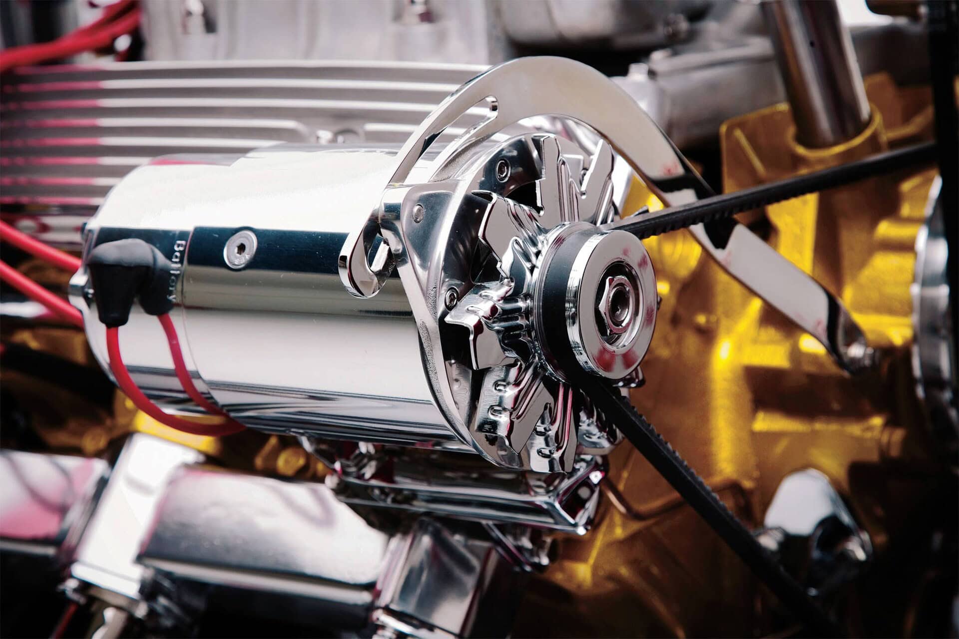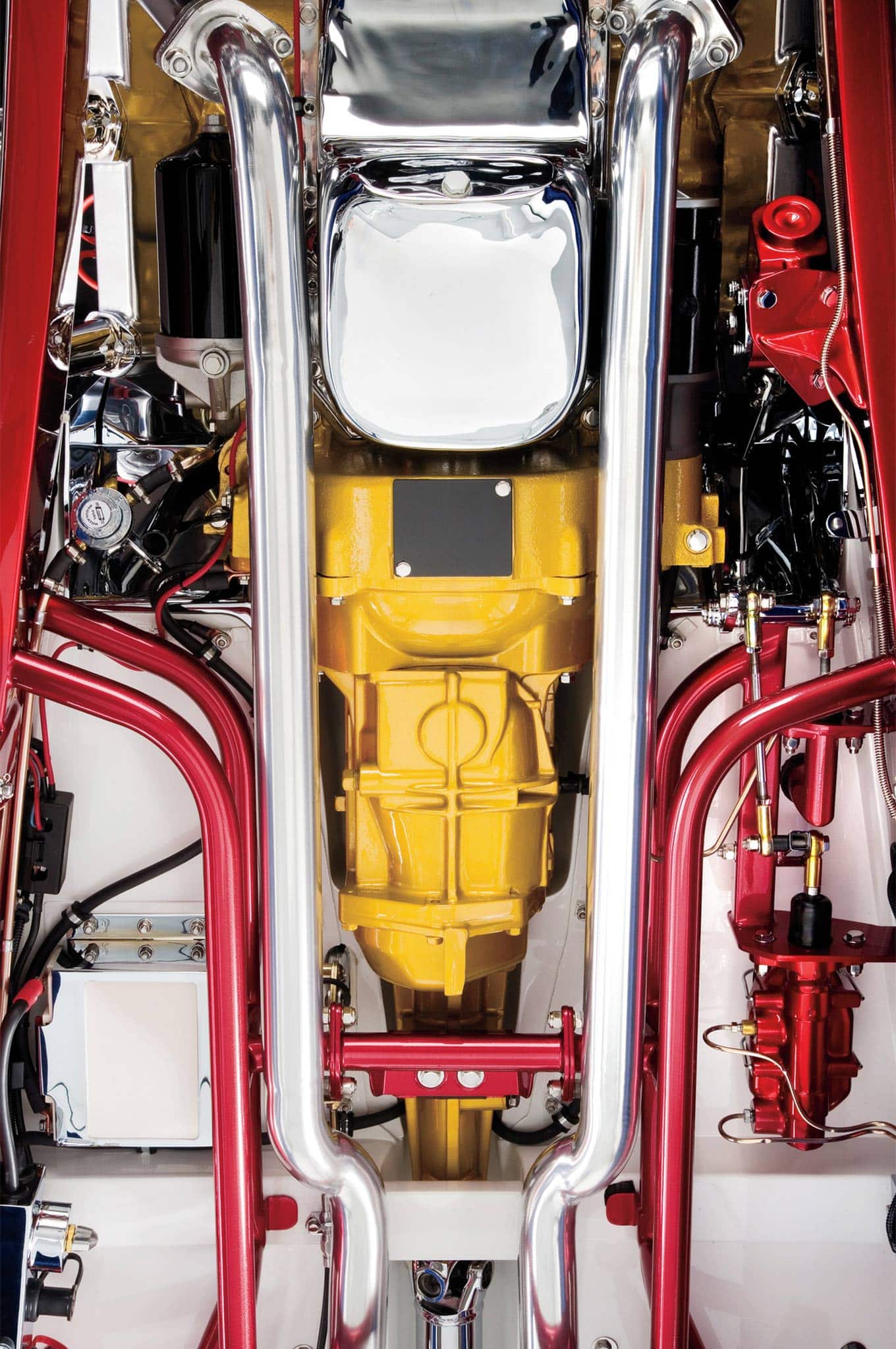 Weiand a fabriqué la plaque que Bill Wanders a utilisée pour adapter quatre carburateurs à deux pistons au ventilateur. Ils ne sont plus vraiment courants. Farkaly a construit celui-ci, une tâche rendue difficile par les angles extrêmes entre les ports étendus et l’entrée étroite du ventilateur. Il a utilisé des Holley 94 pour leurs qualités d’accordage. Il a fait quelques autres concessions pour plus de commodité, comme l’utilisation d’un alternateur Powermaster Motorsports PowerGen de type générateur et de l’allumage conventionnel de style magnéto de Taylor-Vertex. Comme le reste de la voiture, les collecteurs d’échappement ne ressemblent à aucun autre. Tout comme les originaux, ils canalisent les gaz d’échappement vers des sorties cachées et montent des tuyaux latéraux factices. “Nous avons un client qui a une entreprise d’oxycoupage”, explique Borneman. “Je lui ai apporté un joint central et un joint extérieur et je lui ai dit que j’avais besoin que ces formes soient réalisées dans une plaque d’acier de 3 pouces d’épaisseur. Il les a donnés à Gene Fitch, le gars qui a fait les feux arrière pour l’usinage des bâbords. Seuls ces ports ne ressemblent pas à ce à quoi vous vous attendez”…