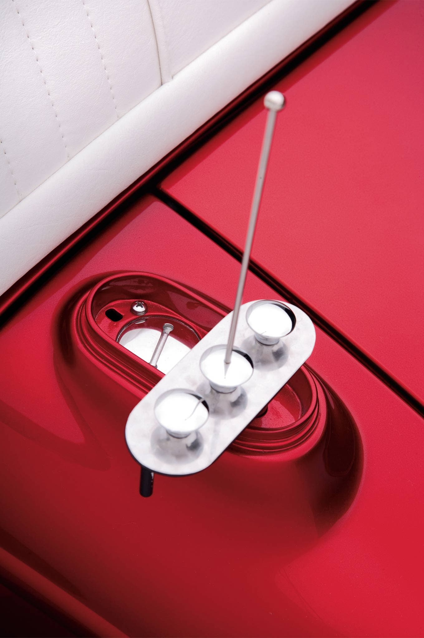 “De cette façon, on peut montrer la voiture avec le toit Carson et la conduire avec le toit décapotable “, explique Borneman. Martinez a également dupliqué le centre de commande en haut du panneau de custode côté conducteur. “Ils ont peut-être utilisé le boîtier du feu arrière, mais nous avons fabriqué cette pièce”, explique Borneman. “Il n’y avait aucune description nulle part de quoi il était fait, alors nous l’avons juste fabriqué à partir d’acier brut”… Le boîtier accueillait deux boutons et un interrupteur orné d’une antenne non fonctionnelle. “Je ne sais pas d’où venaient les deux boutons et ni Mike ni Don ne s’en souviennent”, admet Borneman. “Celui du centre, cependant, était un interrupteur à quatre voies d’une Thunderbird, probablement un interrupteur de siège”. Bien qu’il s’agisse d’une recréation, cette voiture a quelque chose qu’aucune autre voiture ne pourrait jamais revendiquer : le nez d’origine. Le frère et la mère de Charlie Martinez vivent à San Juan, à Porto Rico. Bien que Martinez se soit rendu sur place environ un mois après le début des travaux sur la voiture, il n’a pas pu trouver les restes. Il a laissé l’information à son frère.