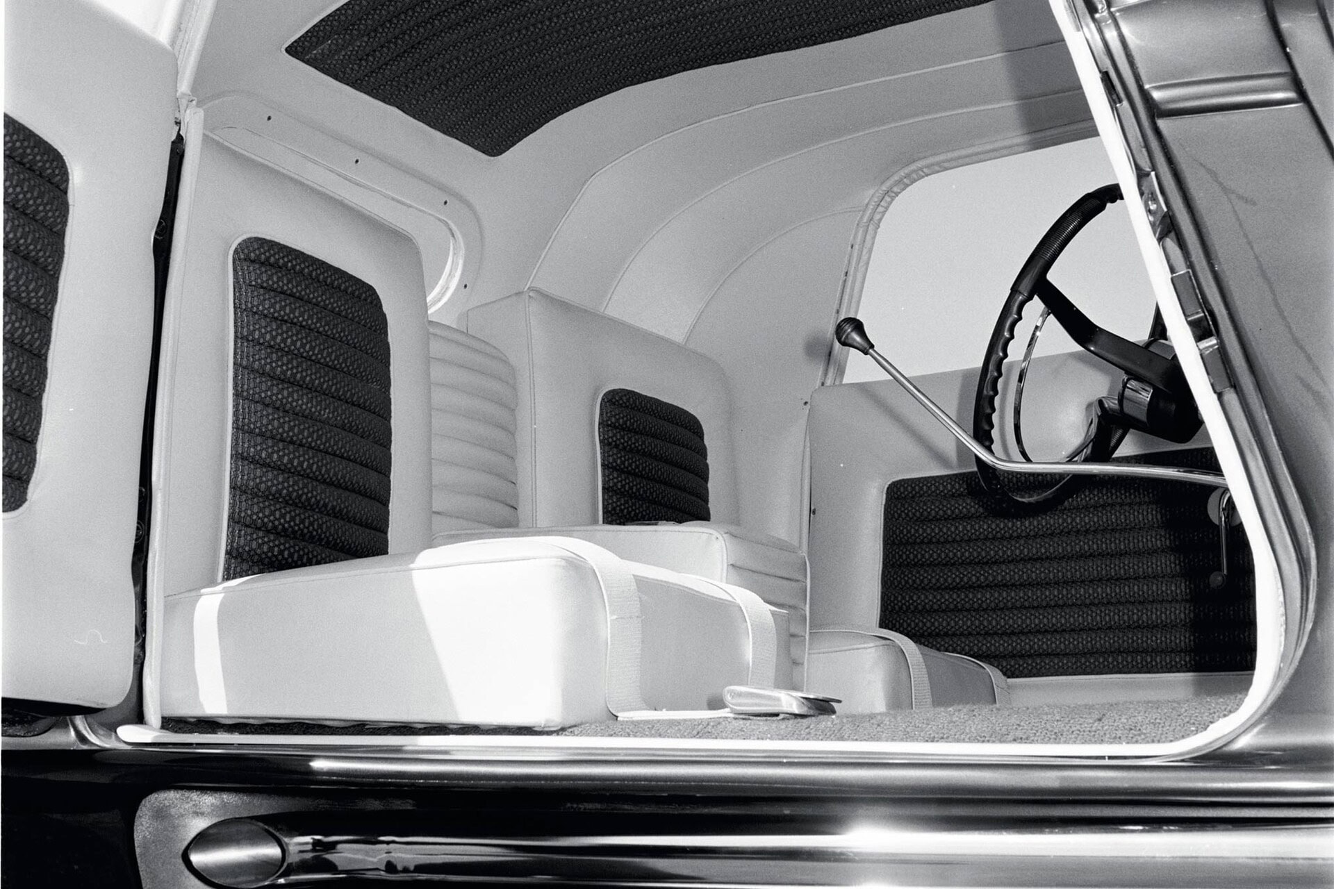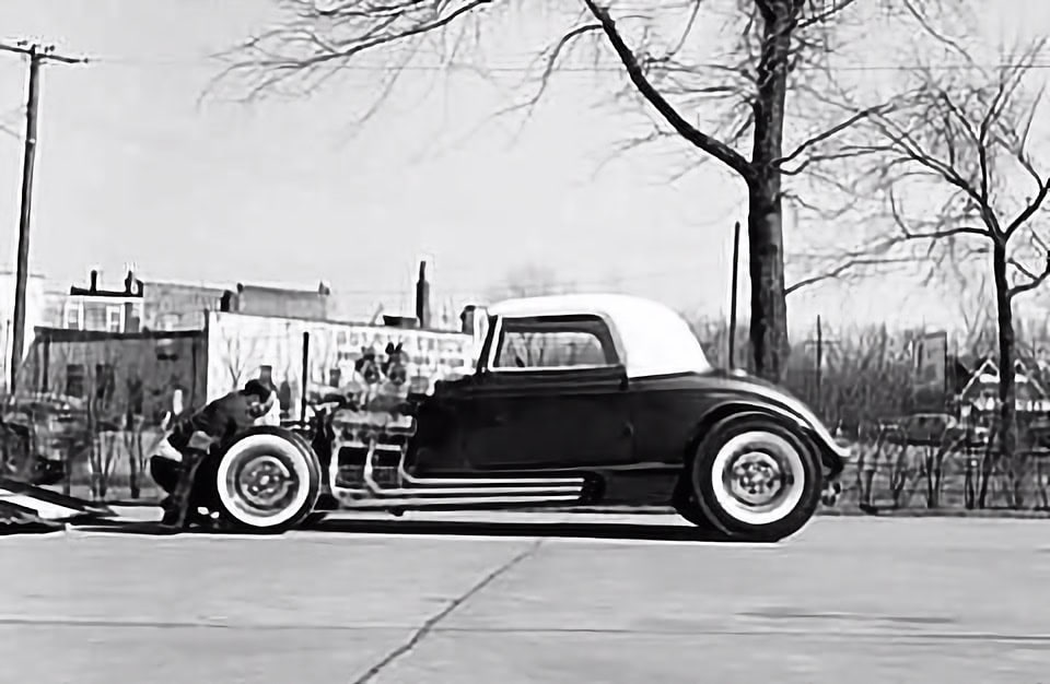Une fois terminée, les frères ont livré la voiture, mais la place était alors occupée par le célèbre Ray Kulakowski. Il a fabriqué les sièges et les panneaux, les dépouillant finalement ainsi que le dessus en similicuir blanc perle. Les sièges et les panneaux latéraux ont bénéficié de panneaux en tissu plissé surpiqués…. “J’ai fait la plupart des travaux mécaniques, l’installation du moteur et la transmission. Il avait un moteur Olds à l’époque, j’ai demandé à Bill Wanders, un gentleman de Detroit qui était un grand amateur de moteurs Oldsmobile dans les années ’50, d’en construire un… il a aussi construit le moteur de Clarence”. Bien qu’elle ne soit pas essentielle, l’histoire de Bill Wanders est intéressante. Il a travaillé chez Ethyl Corporation, le fabricant de l’additif antidétonant pour essence à base de plomb qui porte le nom de l’entreprise. On peut supposer que les moteurs de Don et Catallo ont été utilisés comme mules : “lls mettaient ces moteurs sur le banc et les faisaient fonctionner aussi longtemps qu’ils en avaient besoin”, ajoute Don. Quoi qu’il en soit, “Bill pourrait acheter ces moteurs vraiment bon marché” , conclut-il. Bien que l’on sache peu de choses sur le moteur lui-même, nous savons ce qui suit…