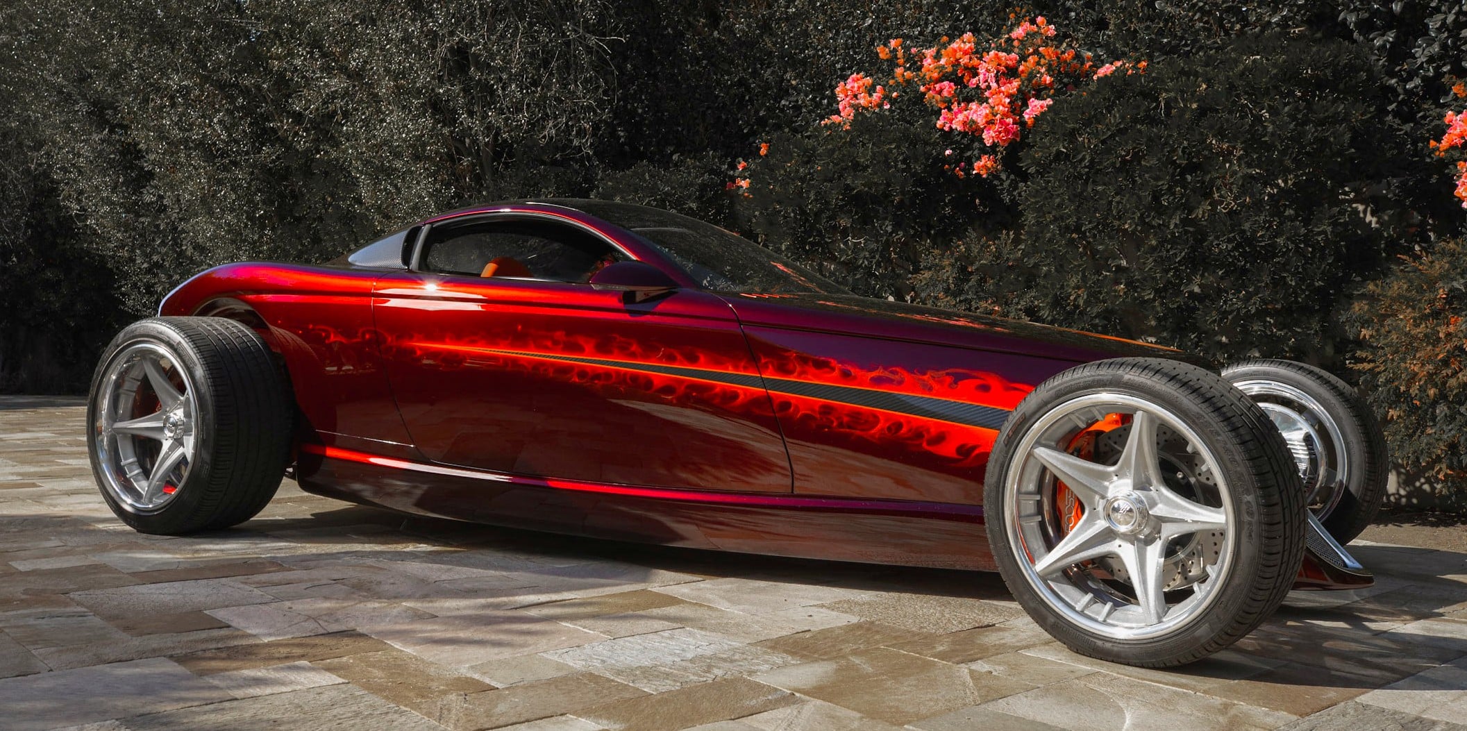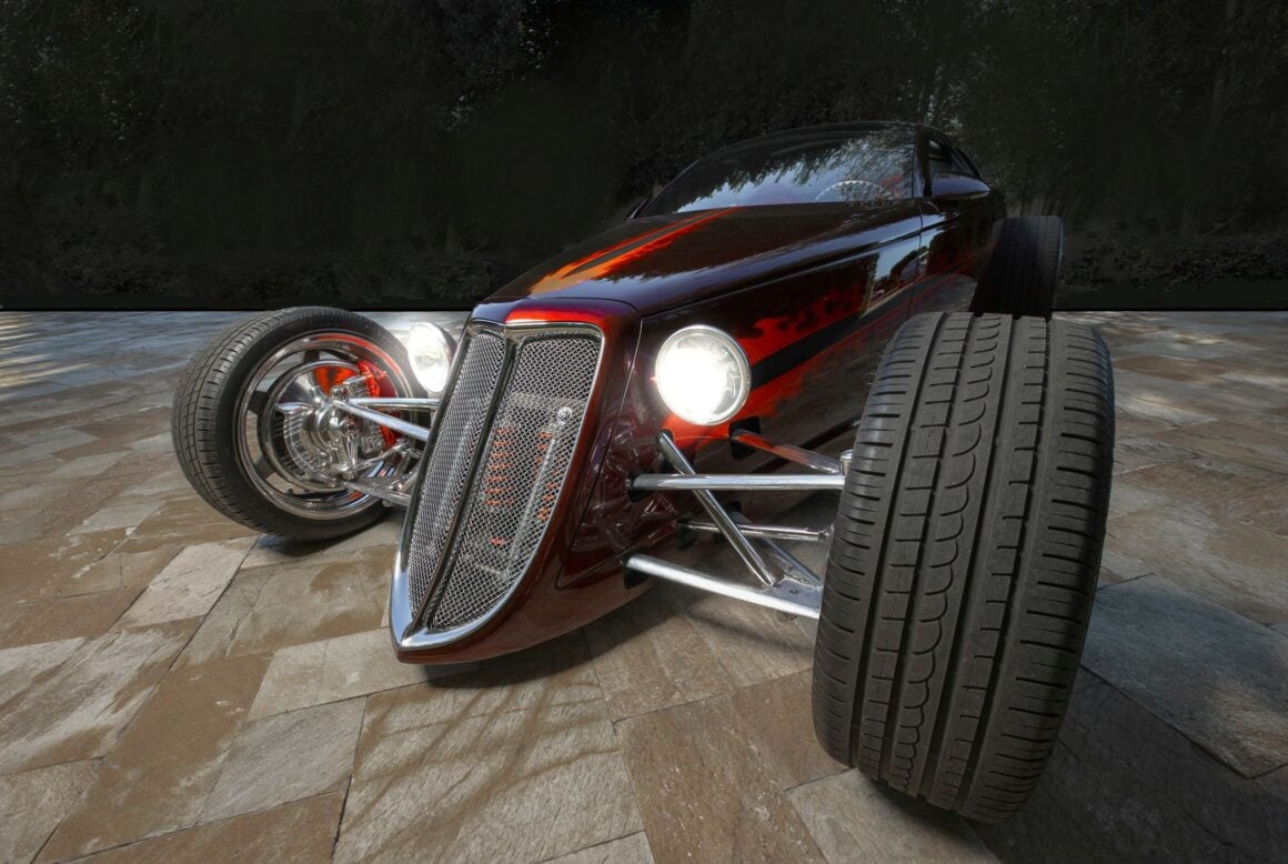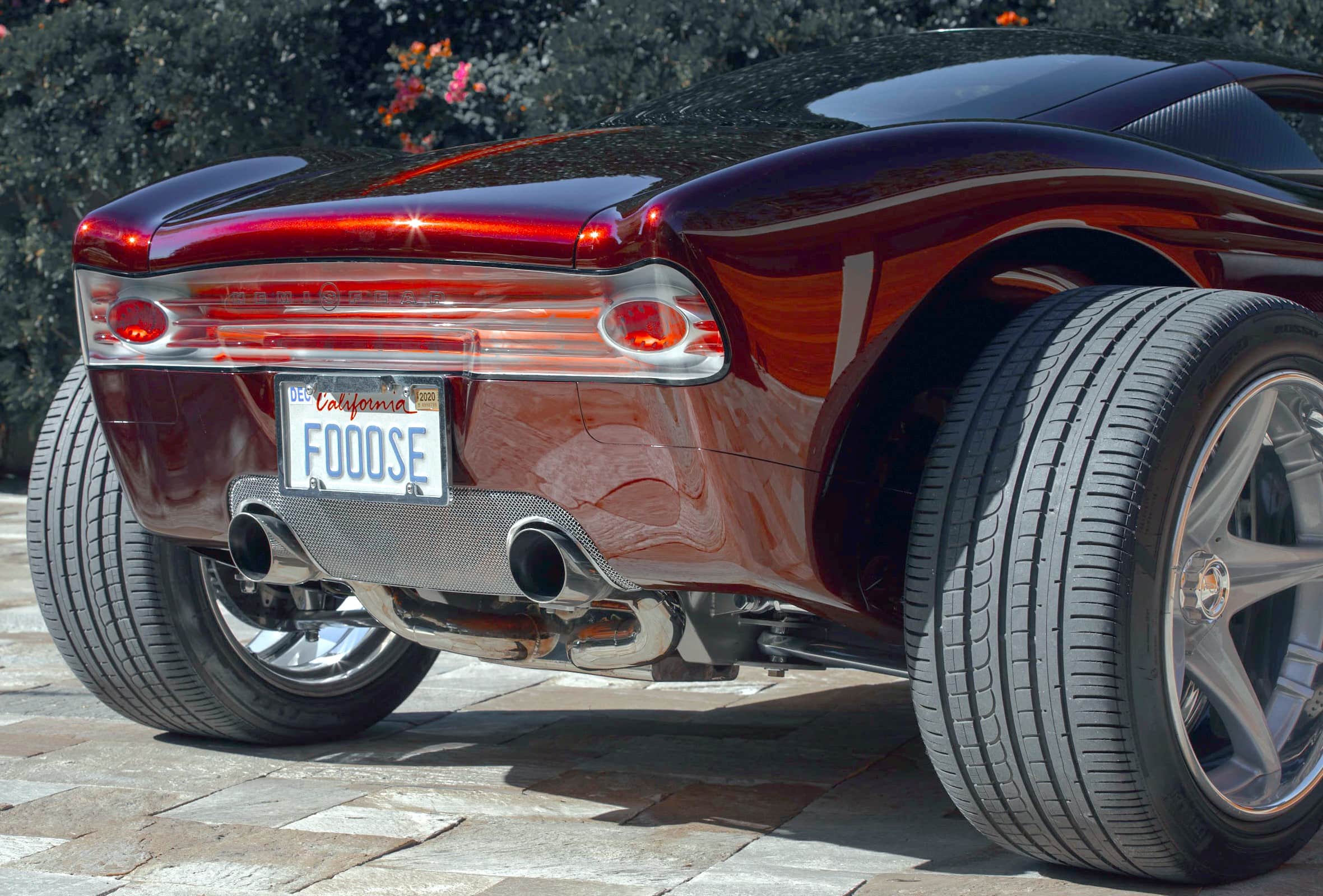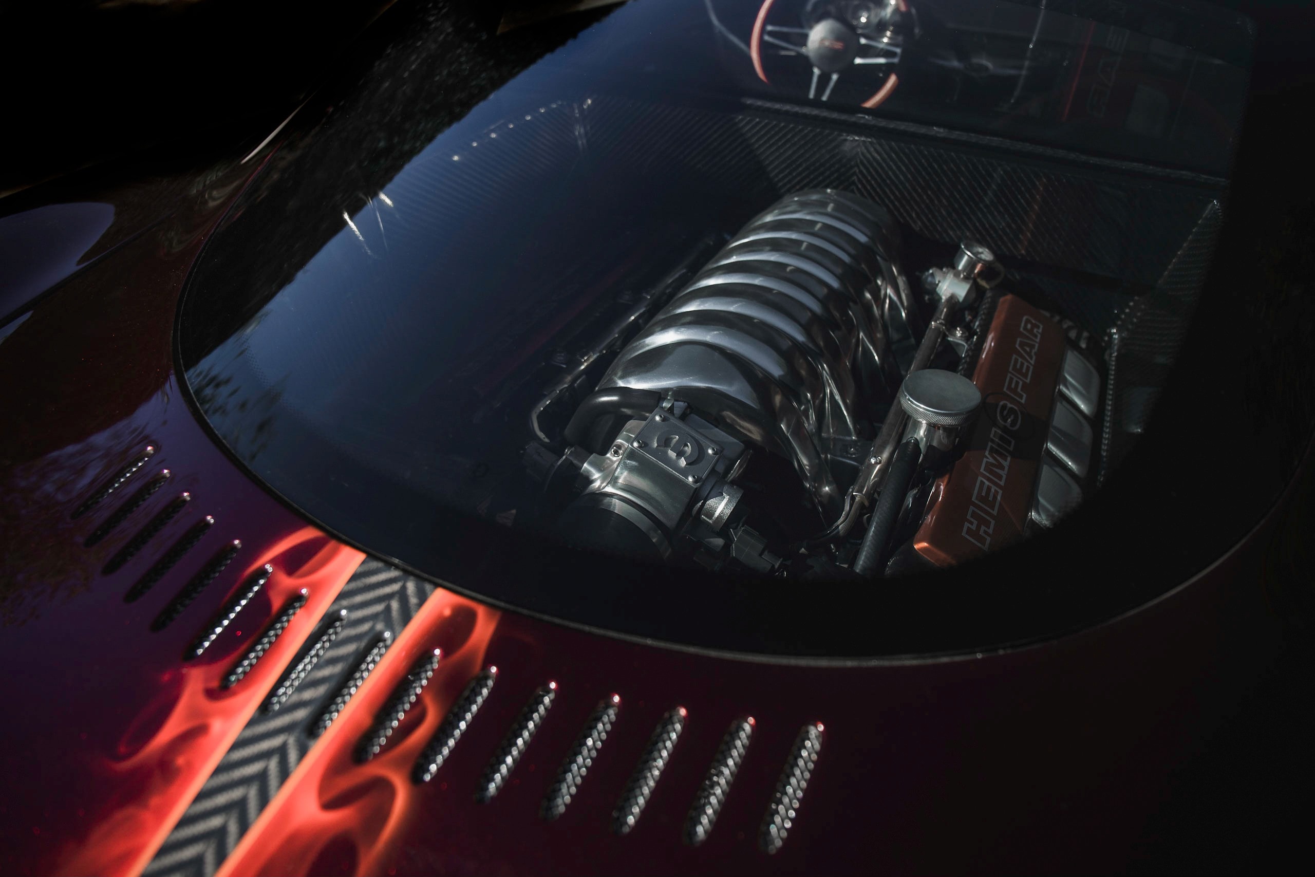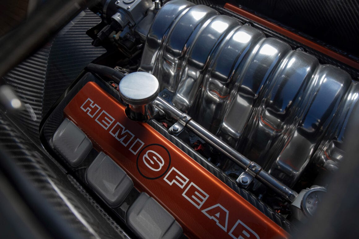 L’une est dans le moteur. La Hemisfear est propulsée par un Chrysler Hemi (duh), mais pas par le Landy Hemi que Chips Foose avait à l’origine pour la voiture. Ce sont les nouveaux moteurs Mopar Performance 392 Hemi. L’autre choix était un Ford 5.4L DACT , une option apportée par un charabia juridique avec MercedesDaimlerChrysler, qui était à l’époque propriétaire de Chrysler. Avant de passer la main ce conglomérat était devenu possessif sur le nom Hemi…