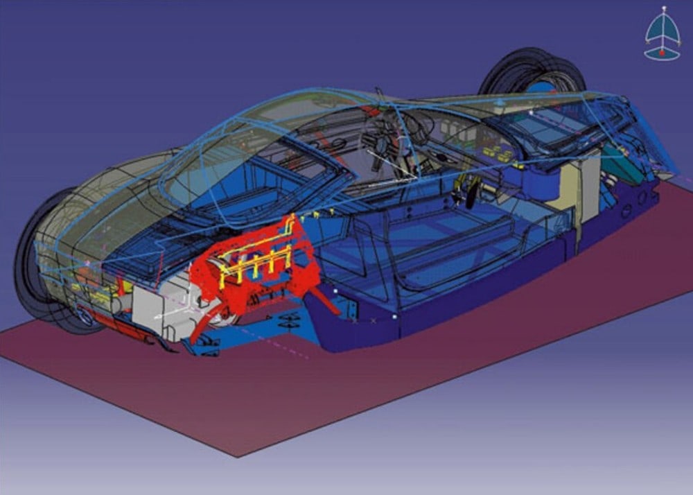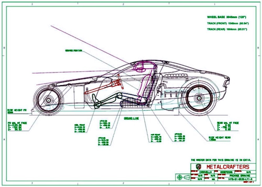 Y compris le verre incurvé du pare-brise. La voiture entière a d’abord été conçue sur ordinateur (comme vous pouvez le voir avec tous les dessins CAO), puis fabriquée et modifiée. À partir du modèle réduit de Chip, Metalcrafters a numérisé la forme et fraisé par ordinateur une version pleine grandeur en mousse, qui a ensuite été utilisée comme “mulet” (ils disent “Bouc” aux USA) pour former la coque de carrosserie en fibre de carbone.