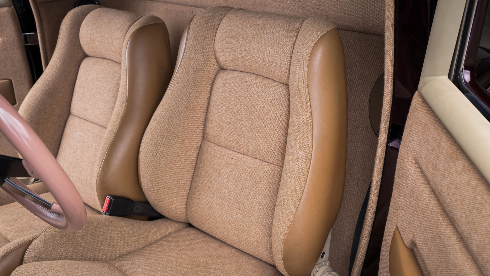 La cabine/habitacle dispose de sièges baquets en tissu beige ainsi que d’une garniture de toit assortie aux panneaux de porte et à la moquette. L’instrumentation VDO comprend un compteur de vitesse, un tachymètre et des lectures pour le niveau de carburant, la pression d’huile, la tension et la température du liquide de refroidissement. Le compteur kilométrique à six chiffres indique un peu plus de 17.000 miles.