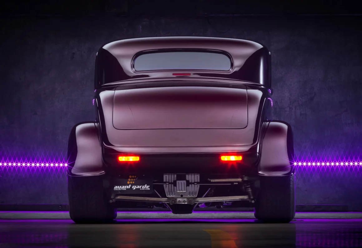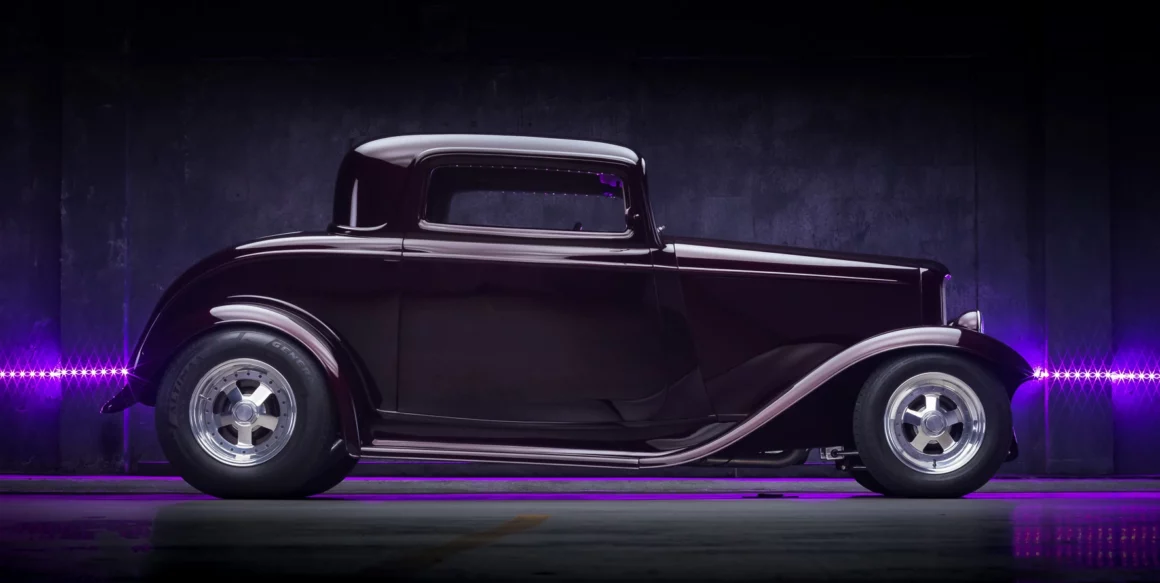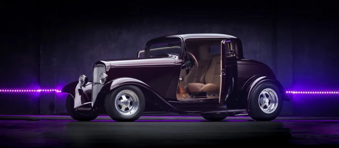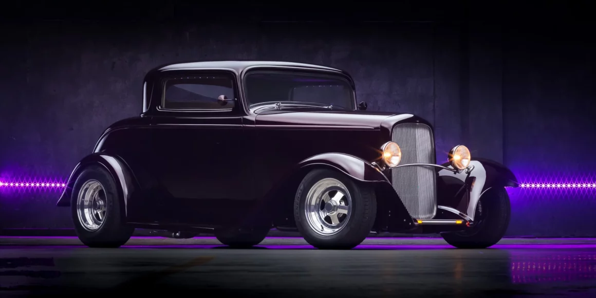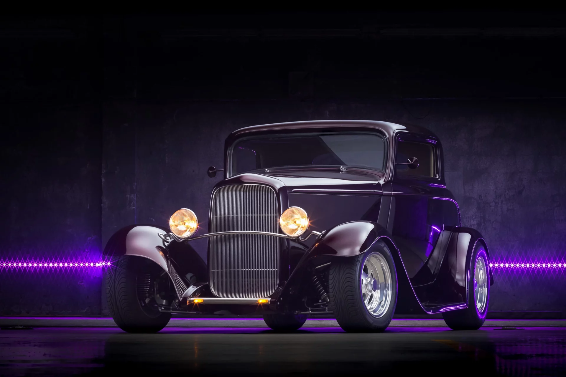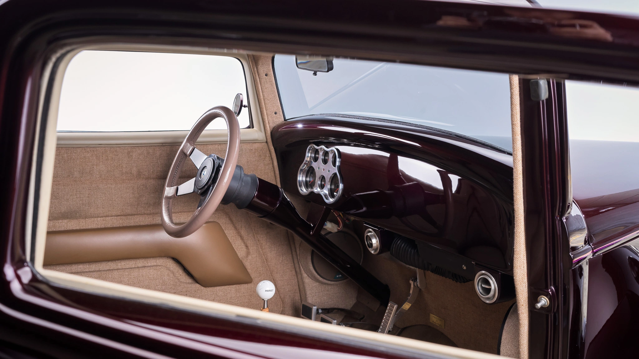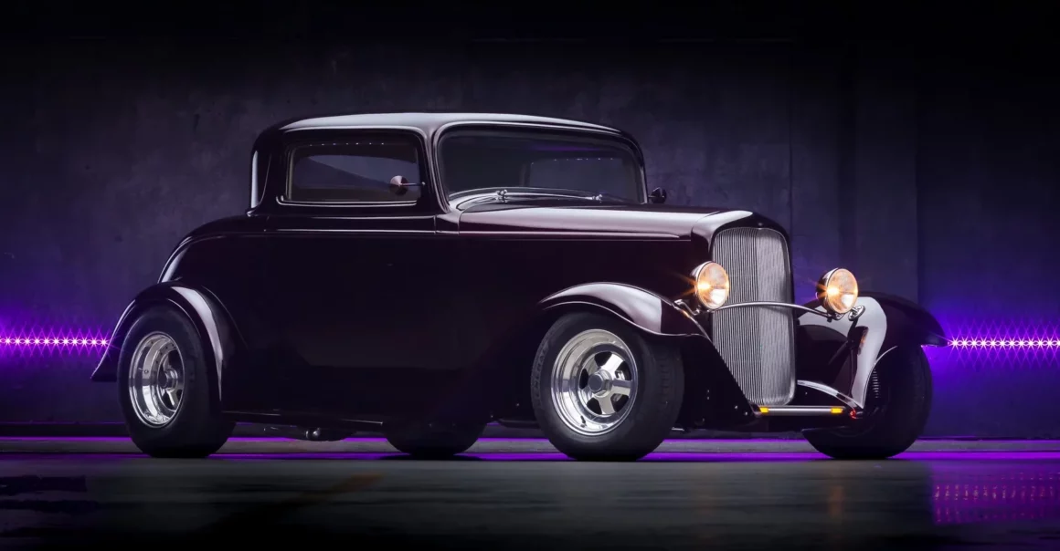 Ce Hot-Rod Coupé Ford’32 3 fenêtres a été construit par Boyd Coddington à la fin des années 1980. La voiture est peinte en Dark Cherry et est propulsée par un V8 Chevy-Corvette L98 injection de 5L7 jumelé à une transmission manuelle T10 à quatre rapports. Les jantes de 14’AV et 15″AR sont des “Billet’s Boyd Coddington” à verrouillage central, enveloppées de pneus General Altimax RT 185/70 à l’avant et 235/70 à l’arrière .