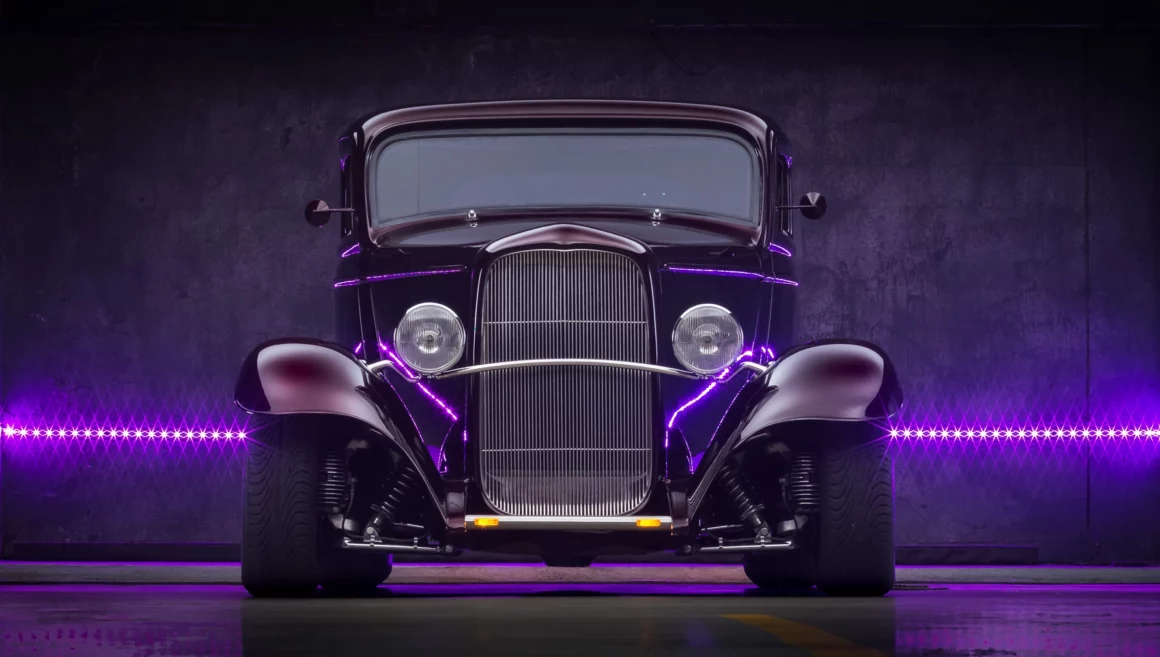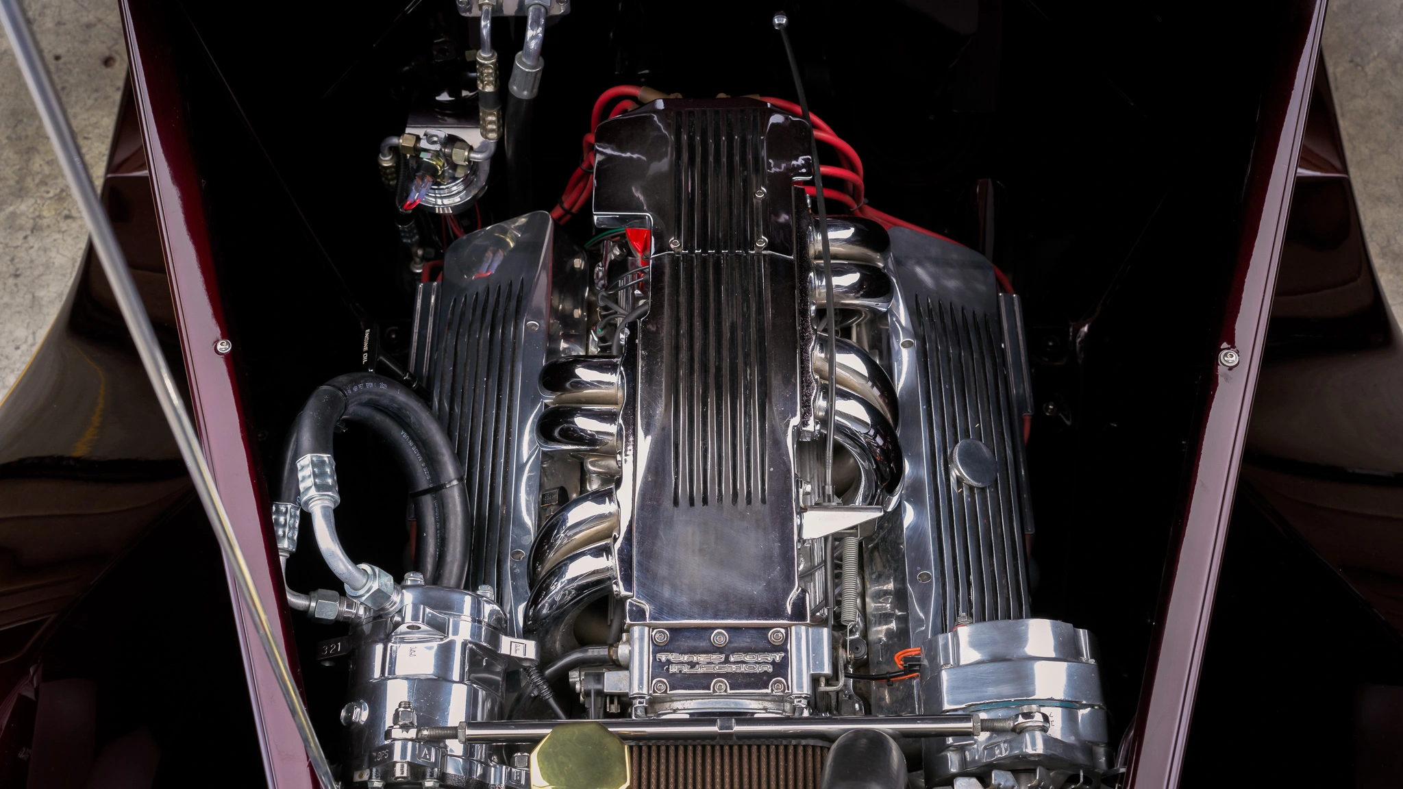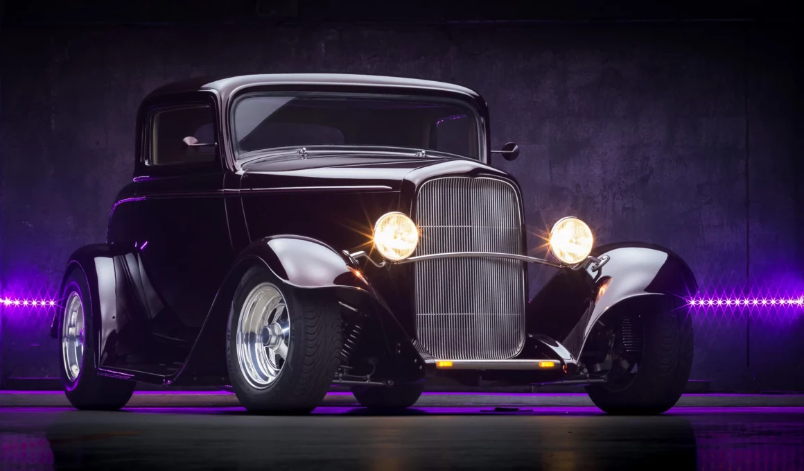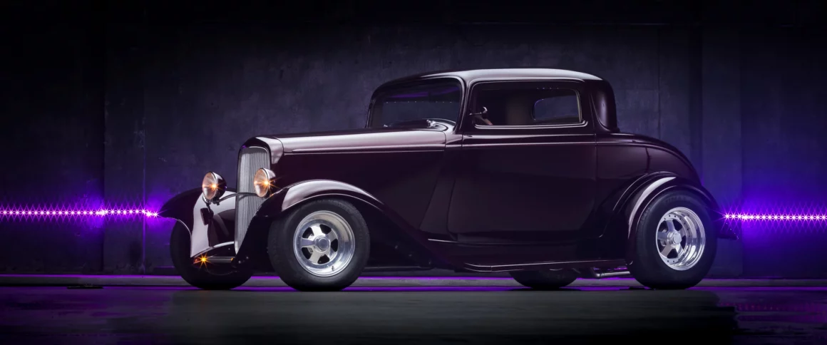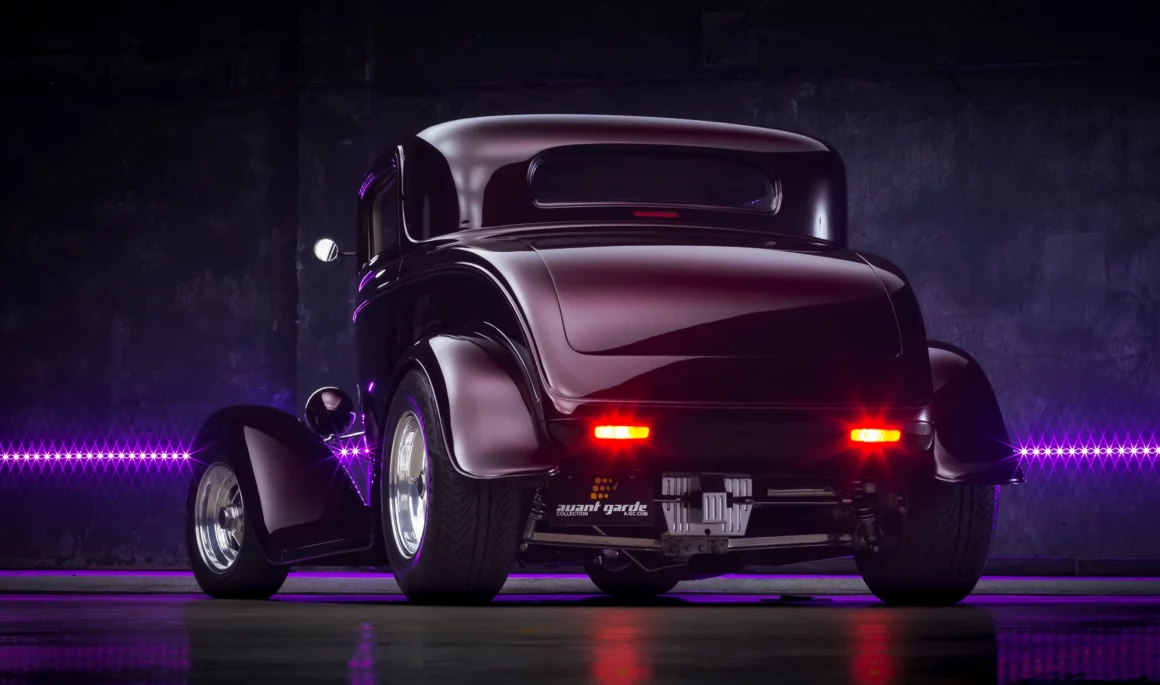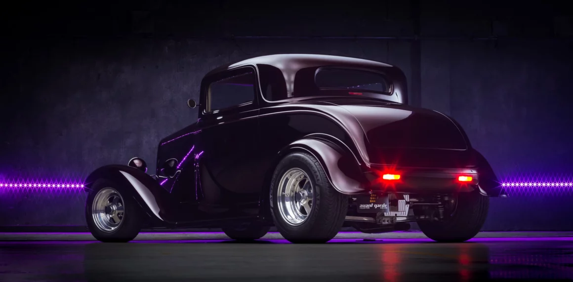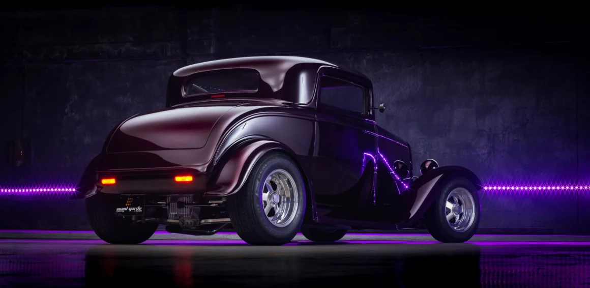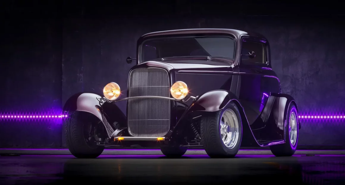 Ce Hot-Rod Coupé Ford’32 3 fenêtres a été construit par Boyd Coddington à la fin des années 1980. La voiture est peinte en Dark Cherry et est propulsée par un V8 Chevy-Corvette L98 injection de 5L7 jumelé à une transmission manuelle T10 à quatre rapports. Les jantes de 14’AV et 15″AR sont des “Billet’s Boyd Coddington” à verrouillage central, enveloppées de pneus General Altimax RT 185/70 à l’avant et 235/70 à l’arrière .