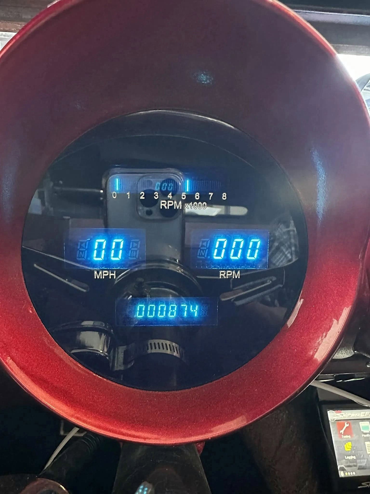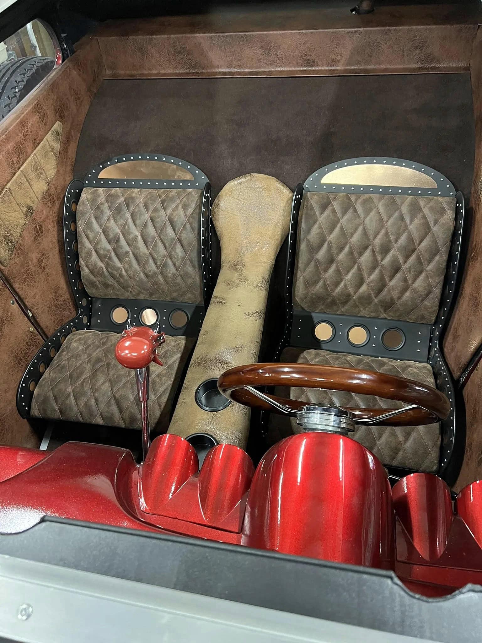 Une fresque personnalisée peinte à l’aérographe peut être vue sur la carrosserie arrière représentant le surnom de la voiture, “Diablo Rojo”. Les roues de 18 pouces sont destinées à imiter les roues de camion Divco et sont montées avec des pneus Coker Excelsior de 5,5 pouces à l’avant et de 7 pouces à l’arrière. La suspension intègre un essieu abaissé à l’avant et des amortisseurs coilover à l’arrière. Le freinage est assuré par des disques avant ventilés et des tambours arrière. Les sièges baquets de style bombardier proviennent de chez “BareMetal Custom” et sont garnis d’un revêtement matelassé. Les caractéristiques intérieures comprennent des vitres électriques, un levier de vitesses Lokar et des porte-gobelets sur le tunnel central. Le tableau de bord provient d’une Impala ’59 et a été sectionné et équipé de jauges Dakota Digital. Le compteur kilométrique affiche moins de 900 miles, indiquant la distance parcourue par la voiture depuis sa construction.