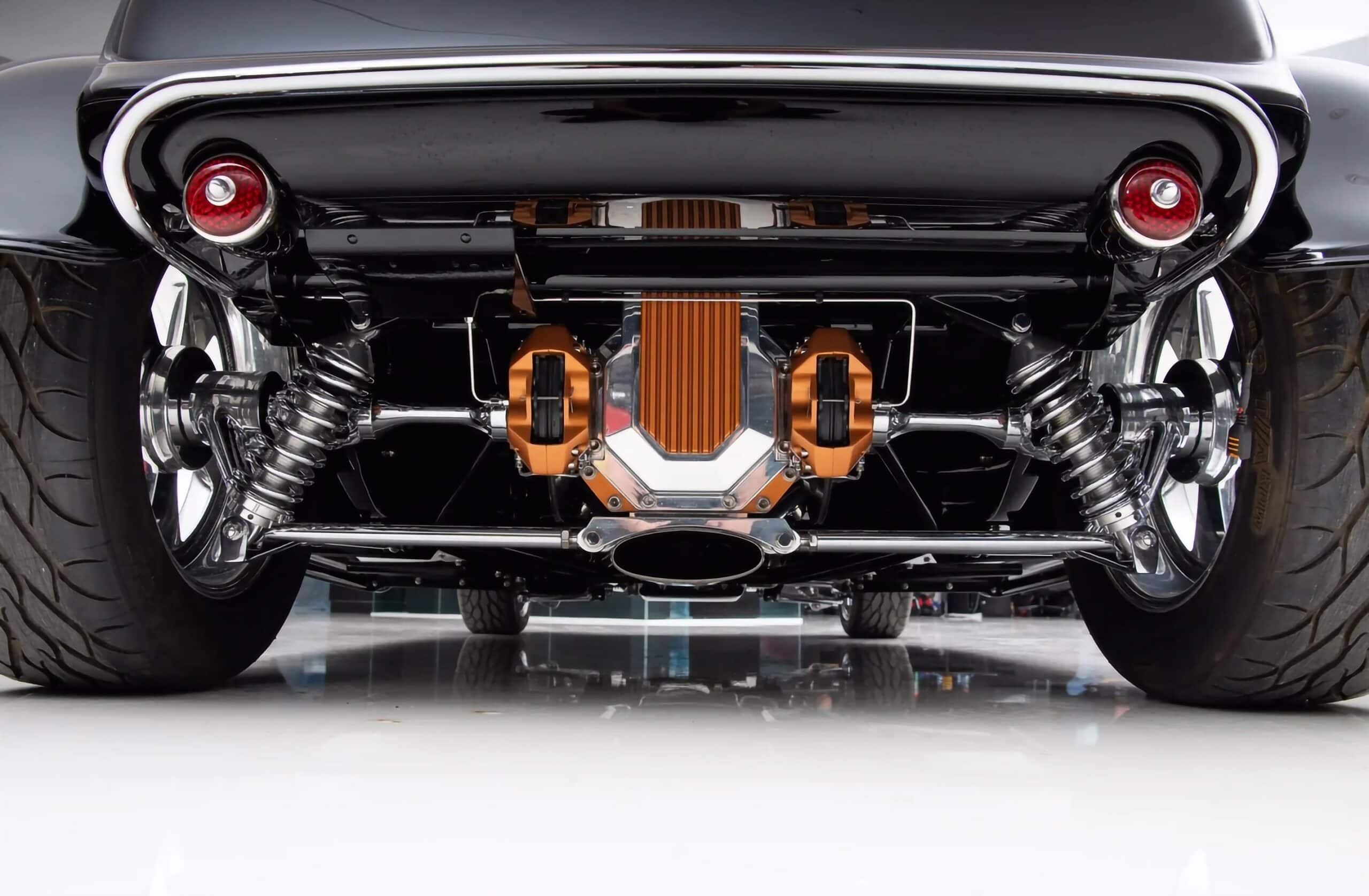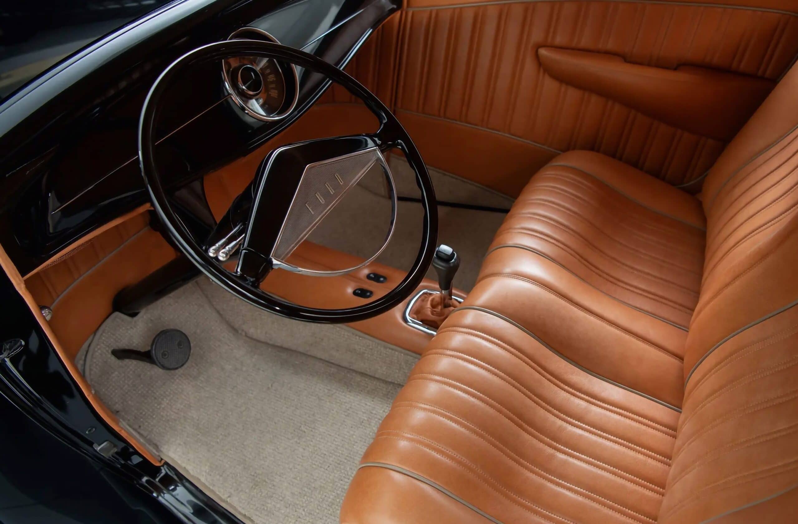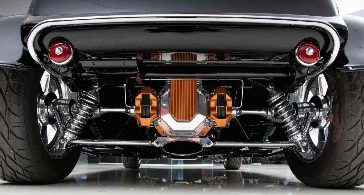 Le châssis arbore une suspension indépendante à ressorts hélicoïdaux, une direction à crémaillère et pignon et des freins à disque Wilwood aux quatre roues. L’intérieur, réalisé par Jim Griffin, est en cuir marron vieilli y compris le volant. Les instruments modernisés proviennent d’une Ford de 1951. Des vitres électriques et la climatisation complètent le confort.
