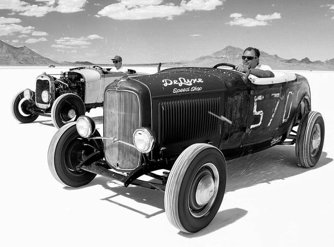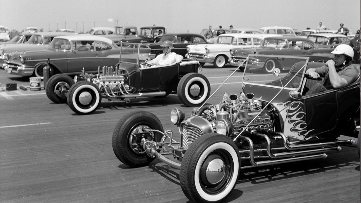 Elle va se nommer Hot-Rodding seulement en 1948, début d’après-guerre. Les “Hot Rodders” étaient généralement pauvres, mais chanceux s’ils avaient un emploi ou un travail à temps partiel. La plupart des gens vivaient avec leur famille élargie dans de petites maisons, l’argent était rare, leur budget serré ce qui encourageait la créativité et l’inventivité pour sortir des ornières de la vie. Ils parcouraient les décharges à la recherche de vieilles voitures et de pièces et construisaient leur propre version d’une voiture rapide. Ils s’amusaient entre-eux en courses brèves et rapides dans les rues, sur les lacs asséchés du désert de Mojave et partout où ils pouvaient trouver (acheter où voler) une occasion…