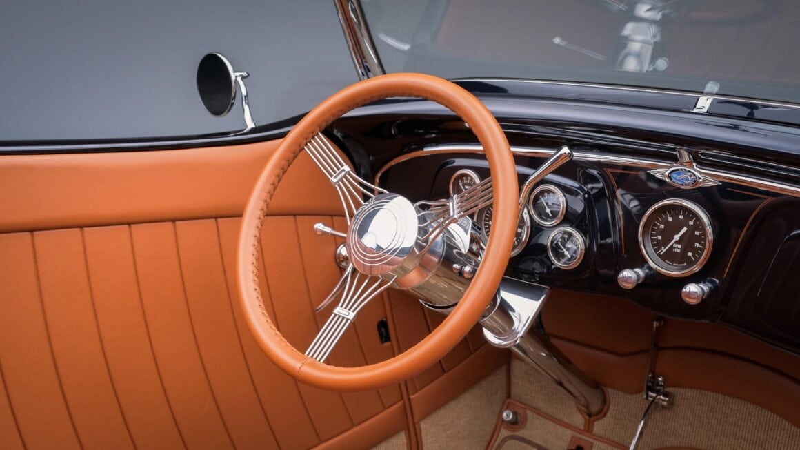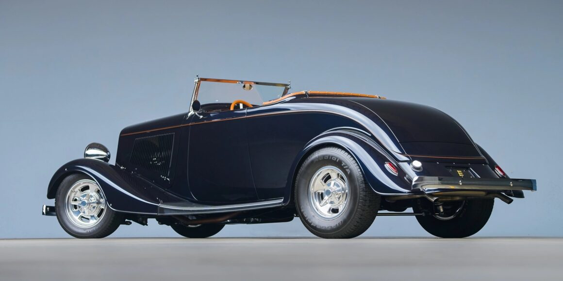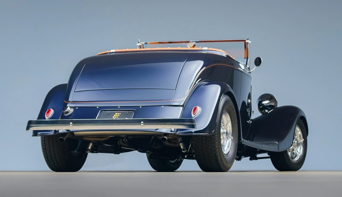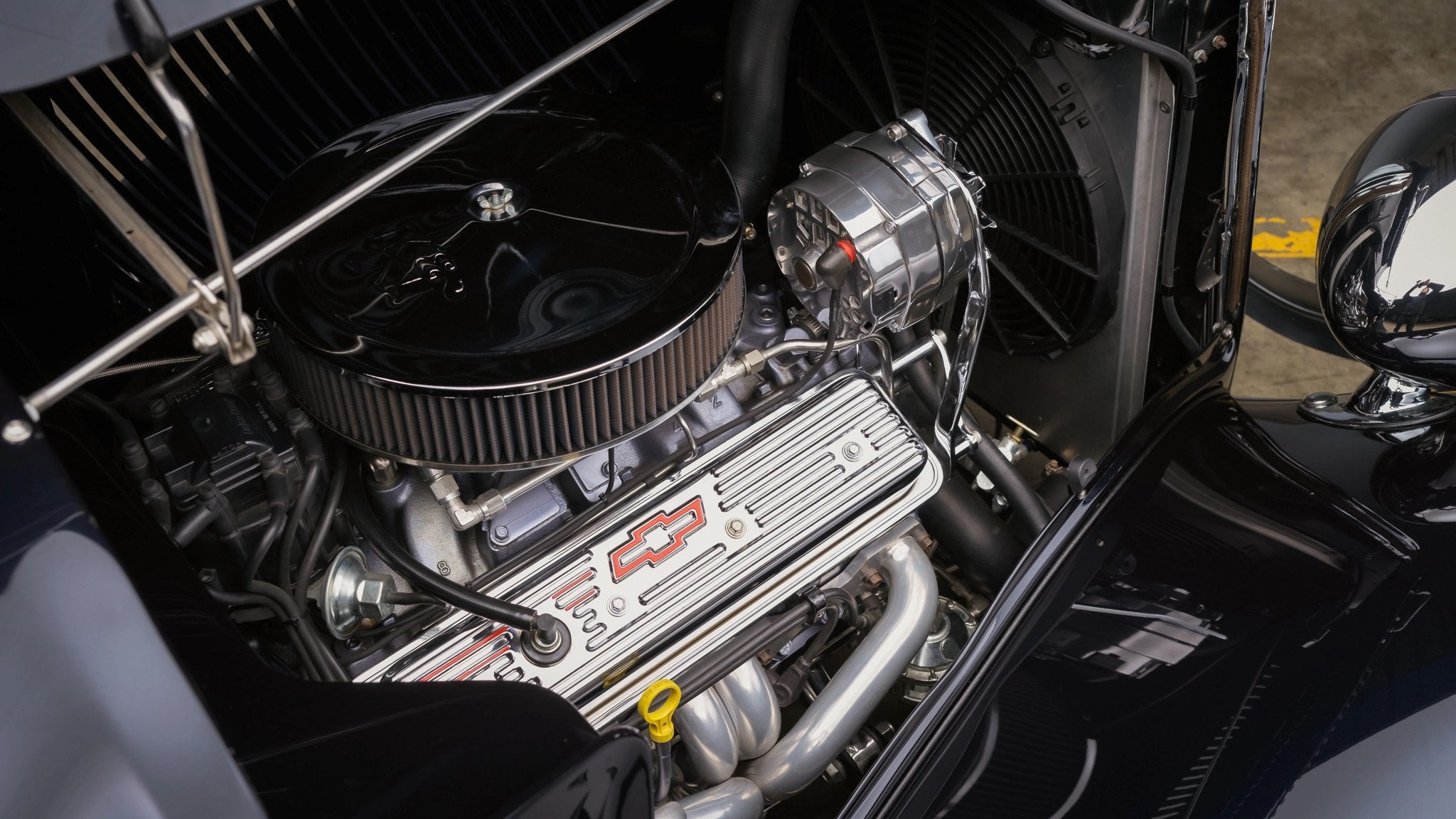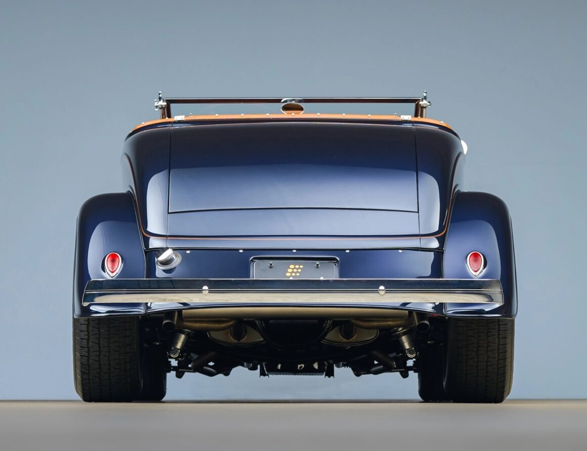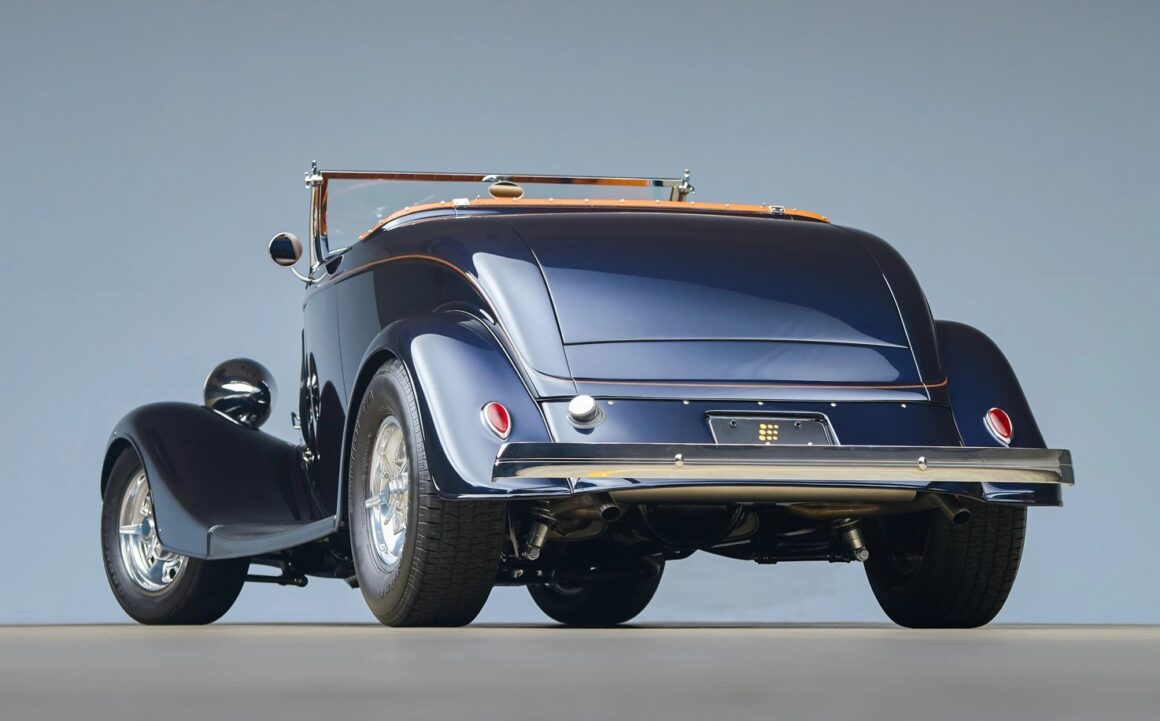 La carrosserie sar Street Rods en acier est finie en BMW Toledo Blue avec des personnalisations de Mitch Kim. Le cadre du pare-brise a été coupé de 2 pouces et l’équipement comprend une calandre de style 1933, un capot à persiennes-louvers, des marchepieds, des feux arrière Ford de style 1939, un support de plaque d’immatriculation arrière encastré et un accastillage de pièces en acier inoxydable chromées. Les jantes Halibrand Sprint polies de 15 pouces sont équipées de spinners et portent des pneus BFGoodrich Radial T/A 195/60 à l’avant et 255/70 à l’arrière.