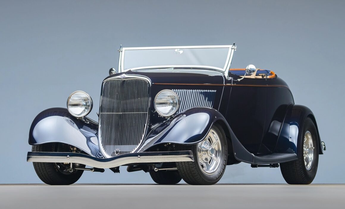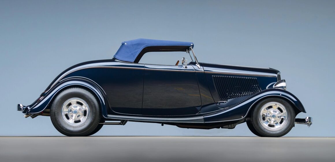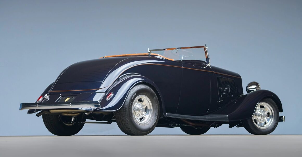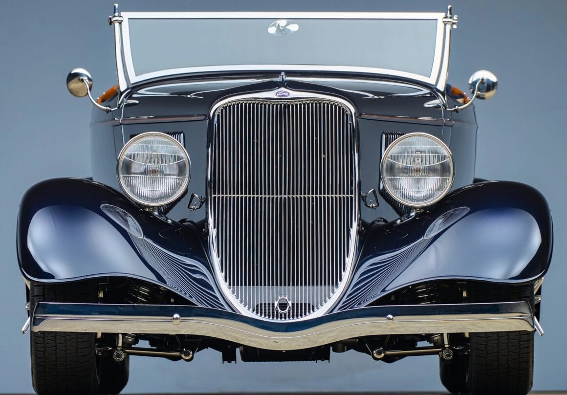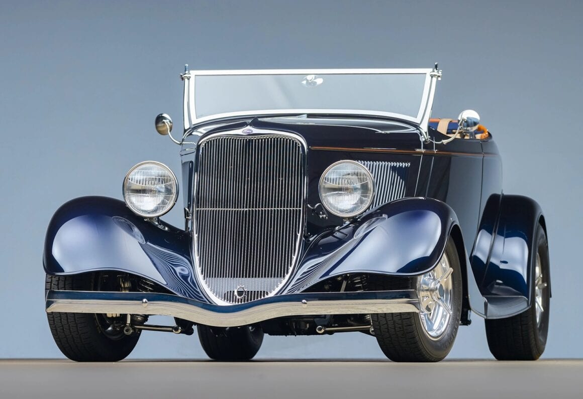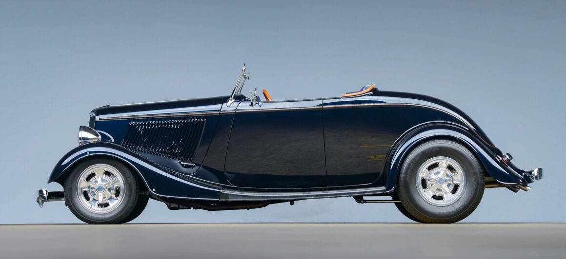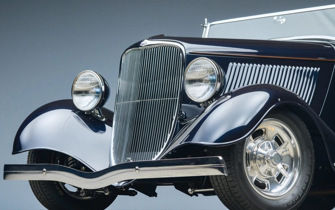 La carrosserie sar Street Rods en acier est finie en BMW Toledo Blue avec des personnalisations de Mitch Kim. Le cadre du pare-brise a été coupé de 2 pouces et l’équipement comprend une calandre de style 1933, un capot à persiennes-louvers, des marchepieds, des feux arrière Ford de style 1939, un support de plaque d’immatriculation arrière encastré et un accastillage de pièces en acier inoxydable chromées. Les jantes Halibrand Sprint polies de 15 pouces sont équipées de spinners et portent des pneus BFGoodrich Radial T/A 195/60 à l’avant et 255/70 à l’arrière.
