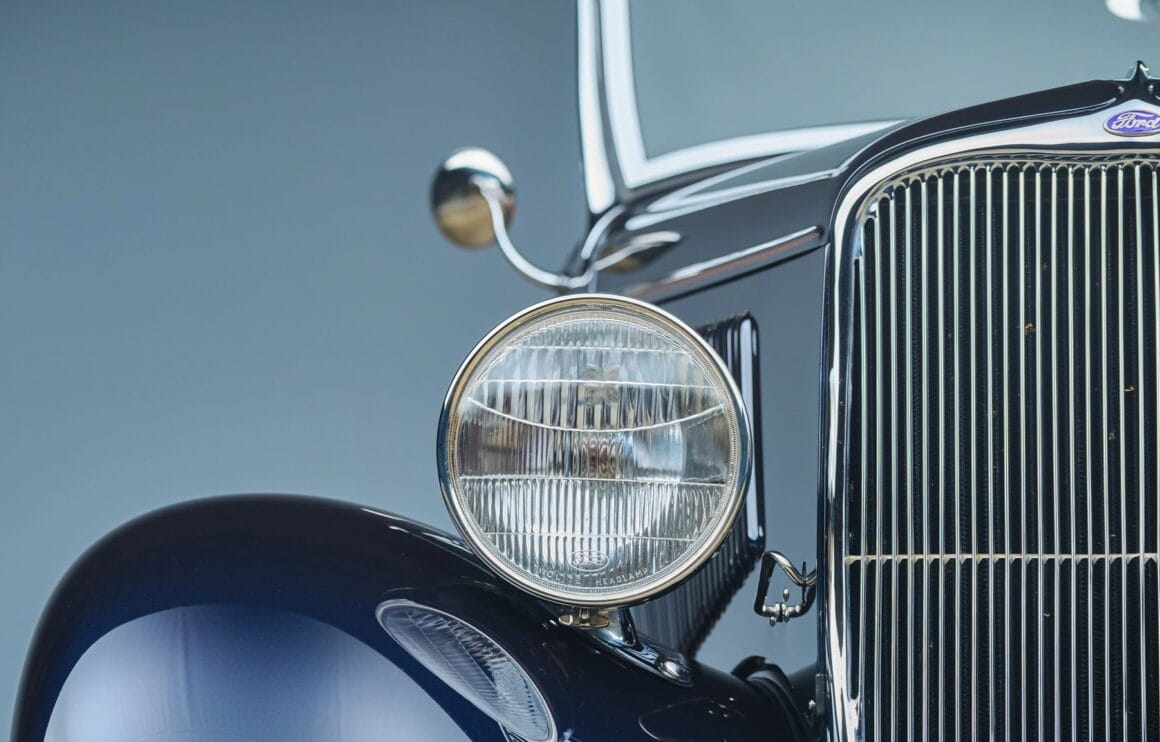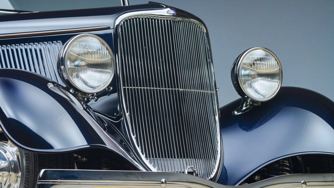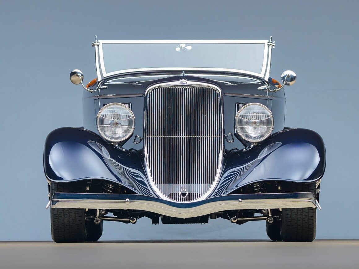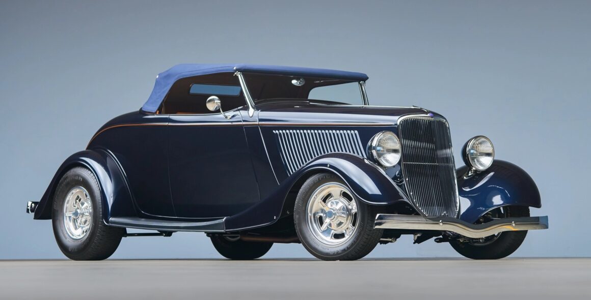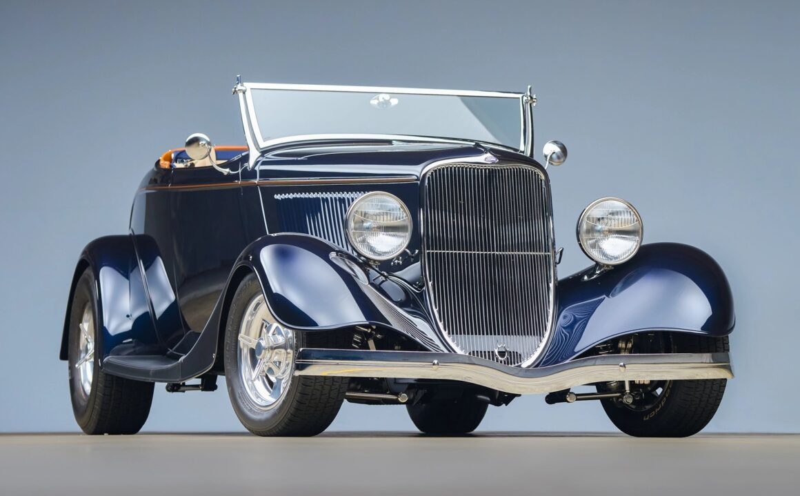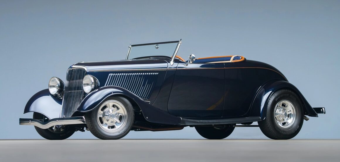 La carrosserie sar Street Rods en acier est finie en BMW Toledo Blue avec des personnalisations de Mitch Kim. Le cadre du pare-brise a été coupé de 2 pouces et l’équipement comprend une calandre de style 1933, un capot à persiennes-louvers, des marchepieds, des feux arrière Ford de style 1939, un support de plaque d’immatriculation arrière encastré et un accastillage de pièces en acier inoxydable chromées. Les jantes Halibrand Sprint polies de 15 pouces sont équipées de spinners et portent des pneus BFGoodrich Radial T/A 195/60 à l’avant et 255/70 à l’arrière.