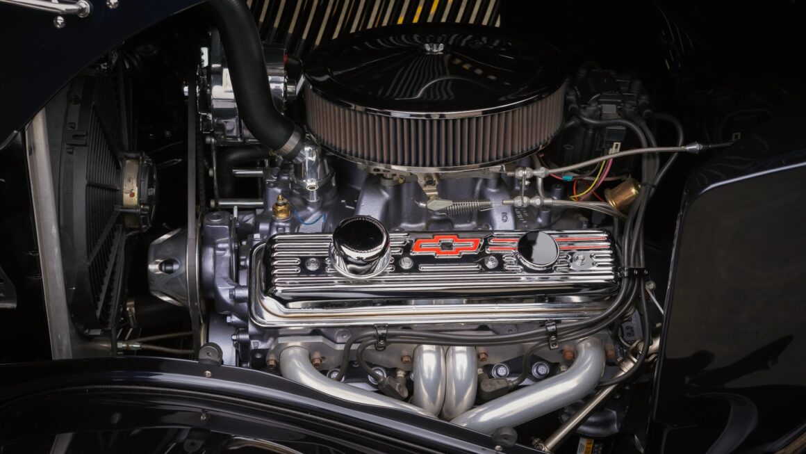 Le volant de style banjo gainé de cuir est monté sur une colonne inclinable. Les compteurs Classic Instruments comprennent un compteur de vitesse de 140 mph, un niveau de carburant, la tension, la pression d’huile et la température du liquide de refroidissement. Le compteur kilométrique à cinq chiffres indique 75 miles, bien que le kilométrage total du châssis soit inconnu. Le V8 350ci General Motors est surmonté d’un carburateur Barry Grant à quatre corps et d’un filtre à air chromé. L’équipement supplémentaire comprend des caches-soupapes à ailettes, un radiateur en aluminium, un ventilateur électrique et un système d’échappement en acier inoxydable de 2 pouces avec silencieux Dynamax. La puissance est envoyée aux roues arrière par le biais d’une transmission automatique à quatre vitesses 4L60-E vers un pont Ford 9pouces Dutchman.