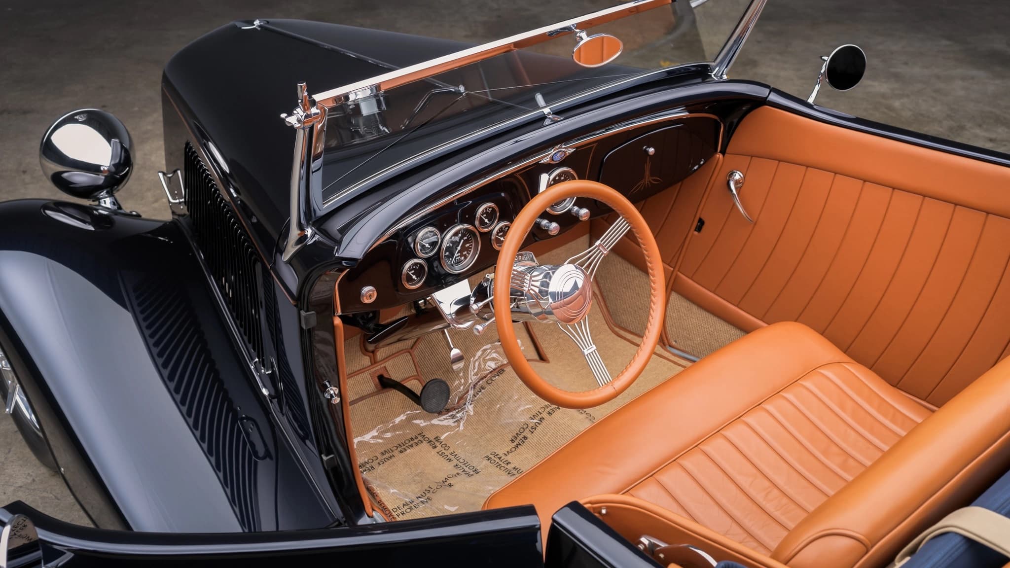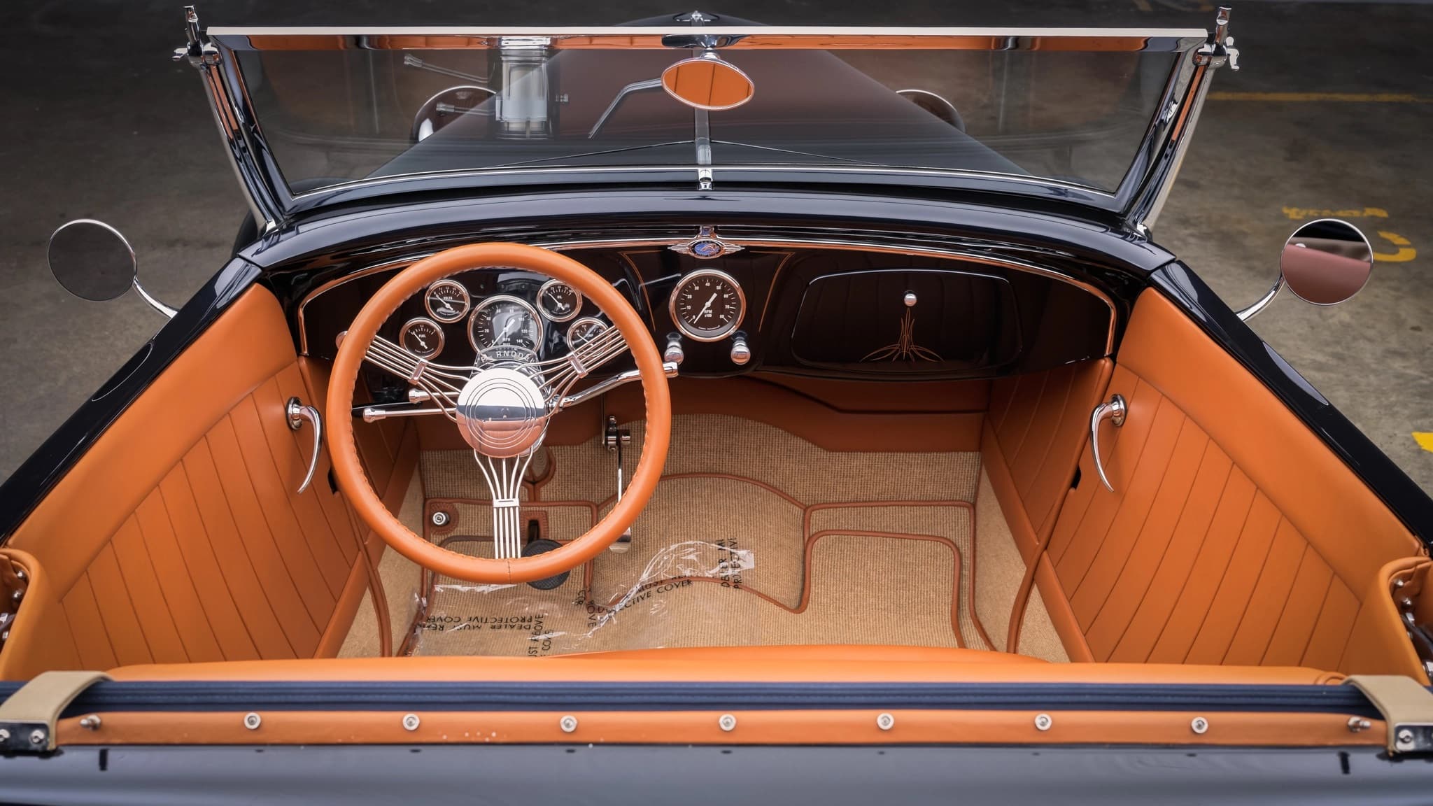 Le châssis en acier de style 1933 provient de Pete & Jake’s Hot Rod Parts et est équipé d’une suspension avant indépendante Heidt, d’un pont arrière Ford à quatre bras, de coilovers avant et arrière et de barres anti-roulis. Le freinage est assuré par des disques aux quatre roues. L’habitacle a été recouvert de cuir Spinneybeck “Velluto Pelle” par Paul Reichlin de Mt. Vernon, Washington, USA, et dispose d’une moquette, d’un chauffage et d’un tableau de bord personnalisé avec des inserts décoratifs réalisés “à la main”...