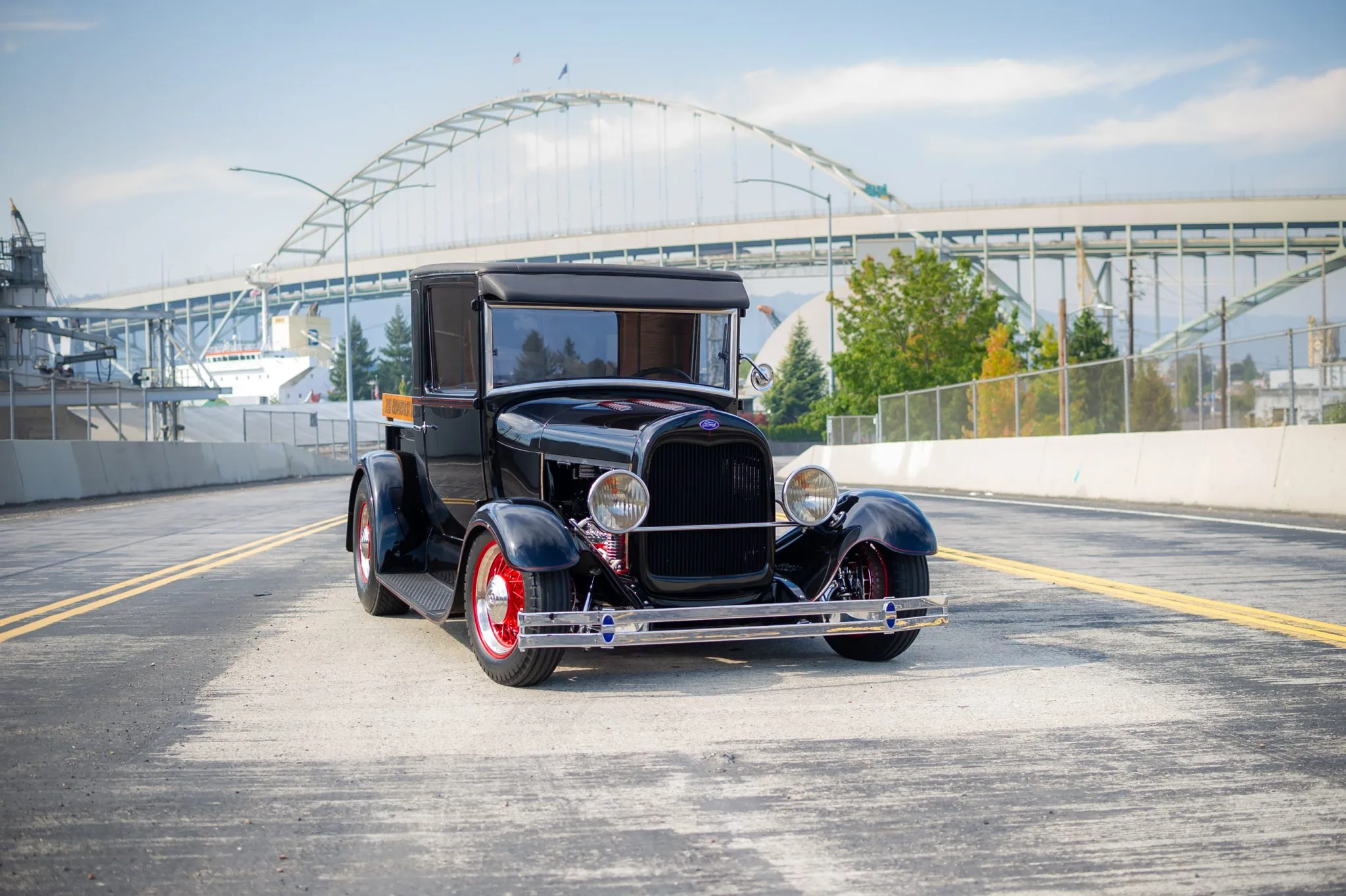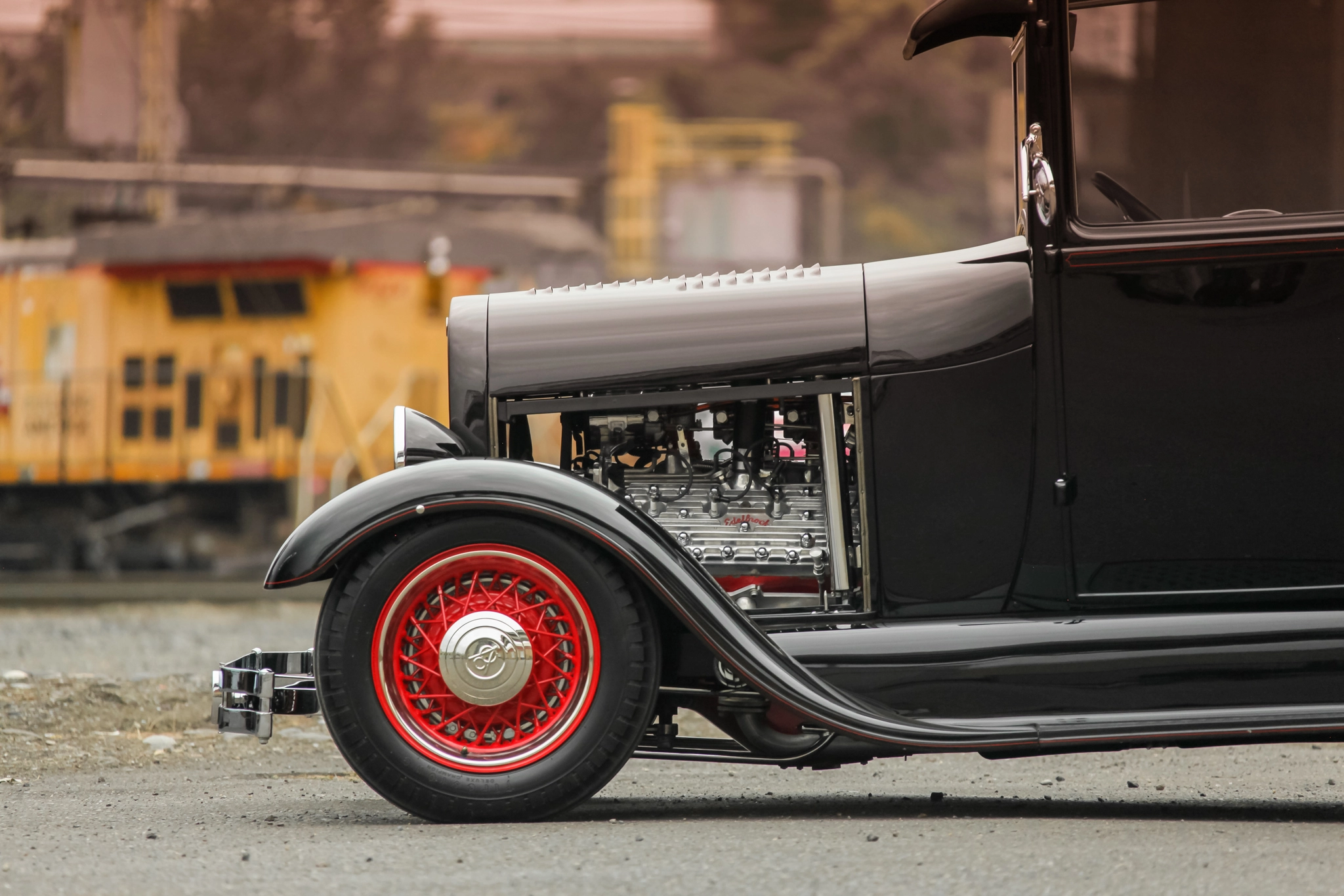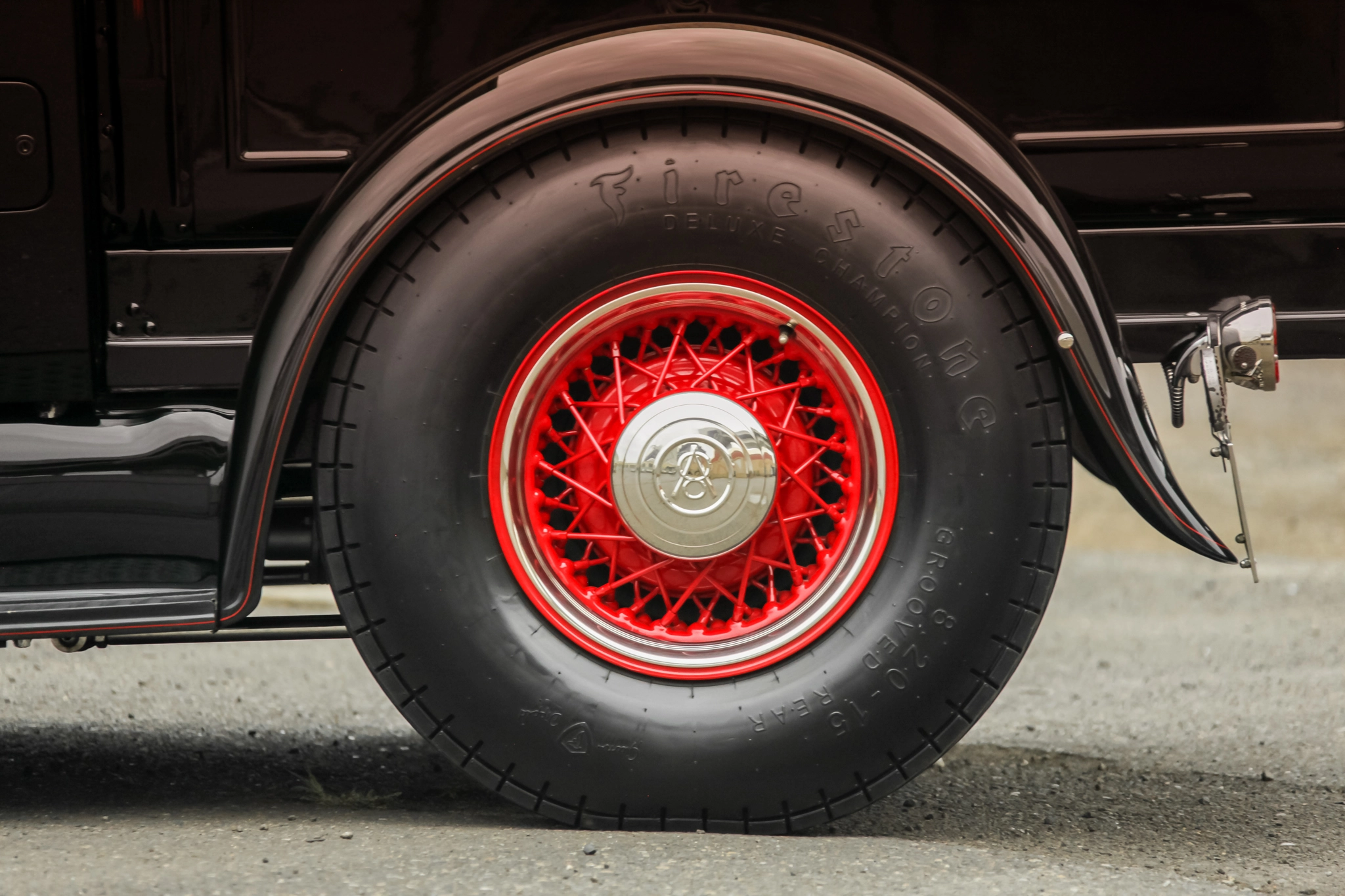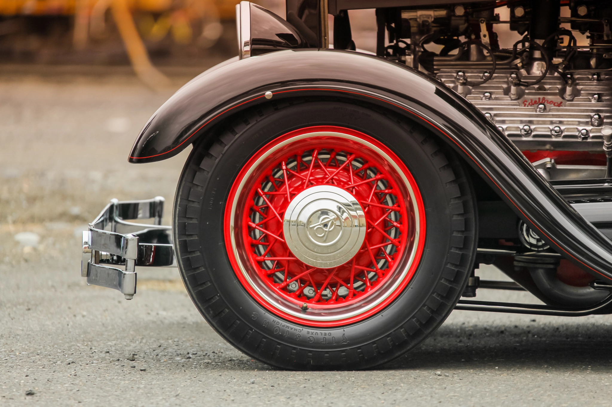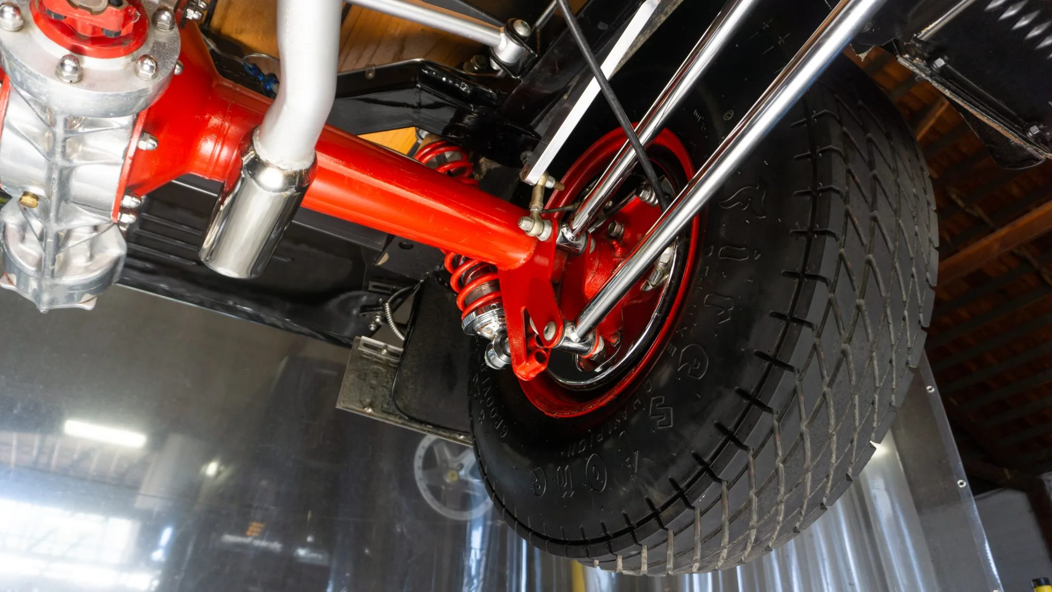 Les jantes Gary McLean à 52 rayons au fini rouge avec enjoliveurs Ford sont enveloppées de pneus décalés de marque Firestone de style vintage. L’extrémité avant est dotée d’un essieu rigide dit “à poutre tombante” de chez Pete&Jakes. Le freinage est assuré par des tambours à ailettes qui proviendraient d’une Buick de 1957 et qui sont équipés d’entrées d’air pour les refroidir.
