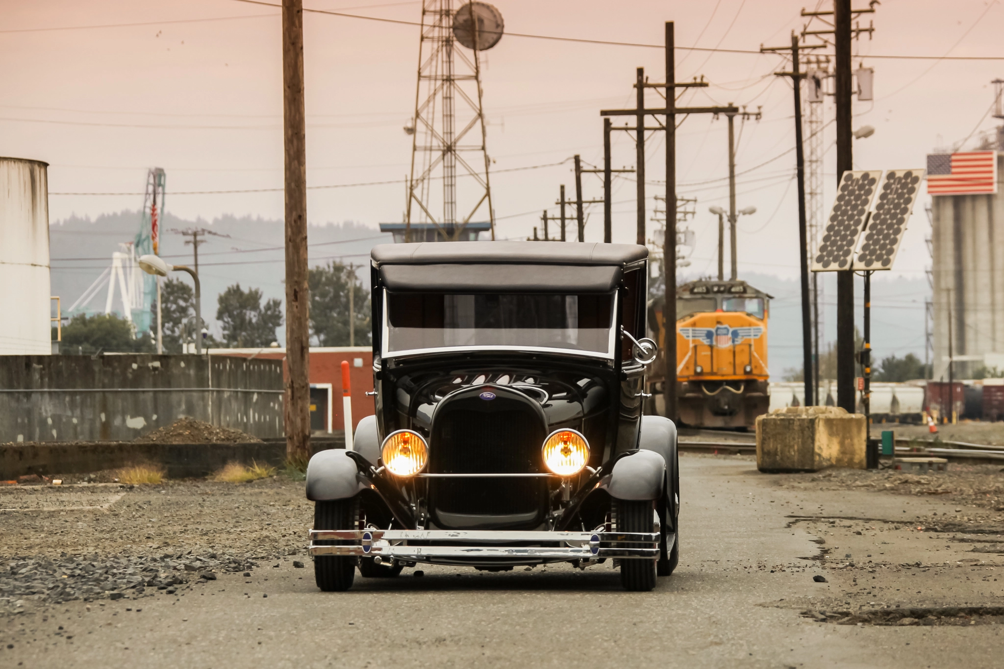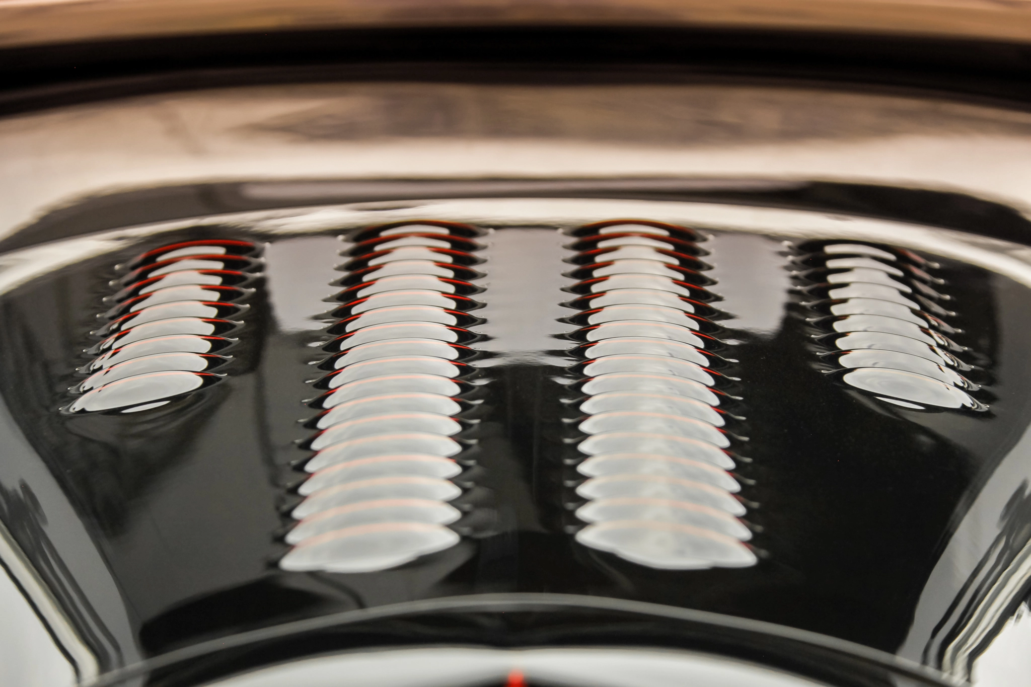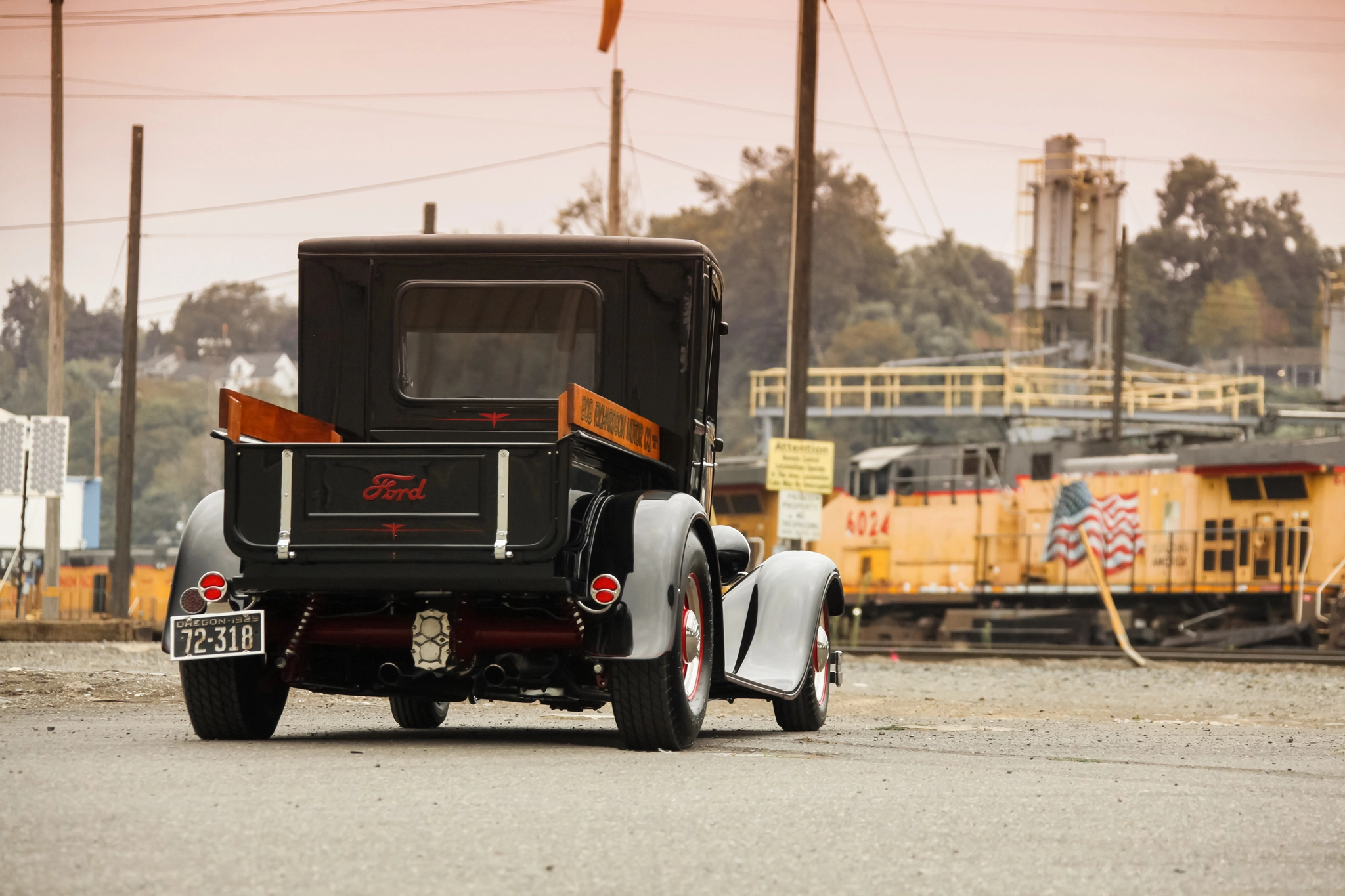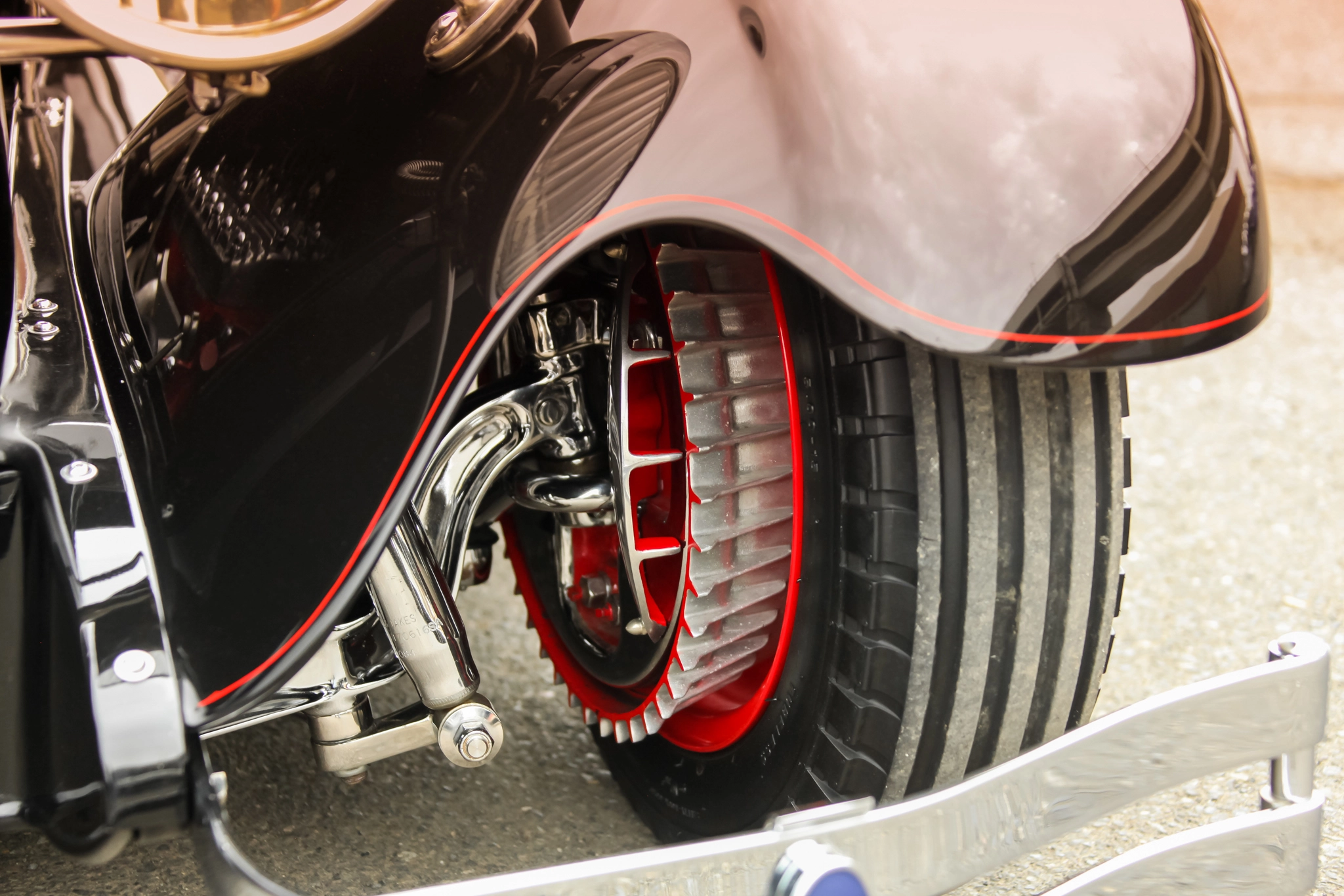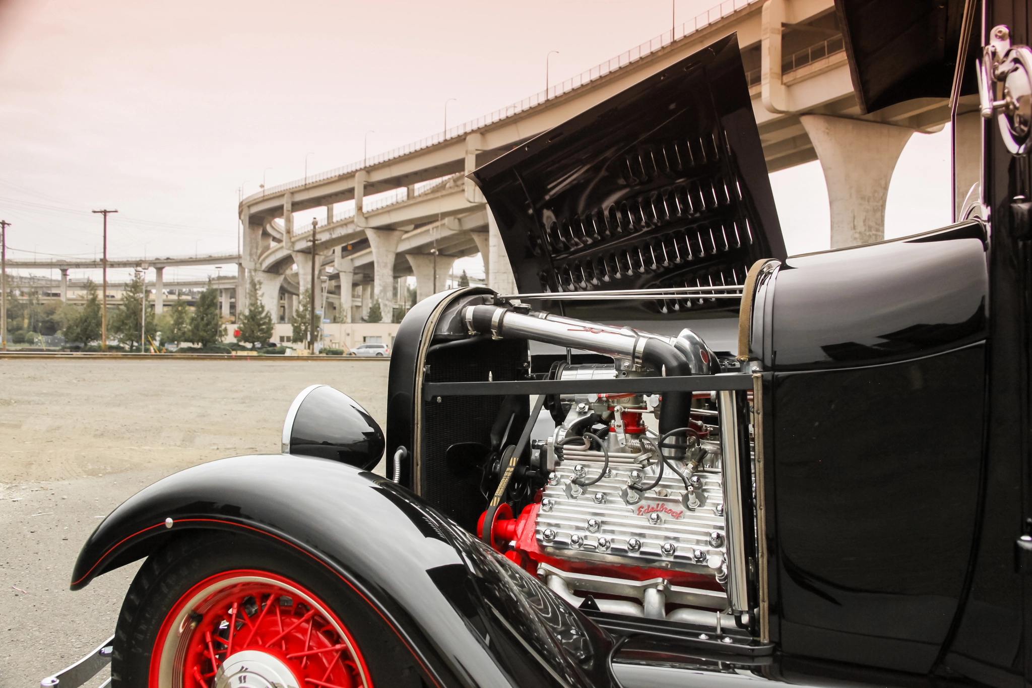 Les jantes Gary McLean à 52 rayons au fini rouge avec enjoliveurs Ford sont enveloppées de pneus décalés de marque Firestone de style vintage. L’extrémité avant est dotée d’un essieu rigide dit “à poutre tombante” de chez Pete&Jakes. Le freinage est assuré par des tambours à ailettes qui proviendraient d’une Buick de 1957 et qui sont équipés d’entrées d’air pour les refroidir.
