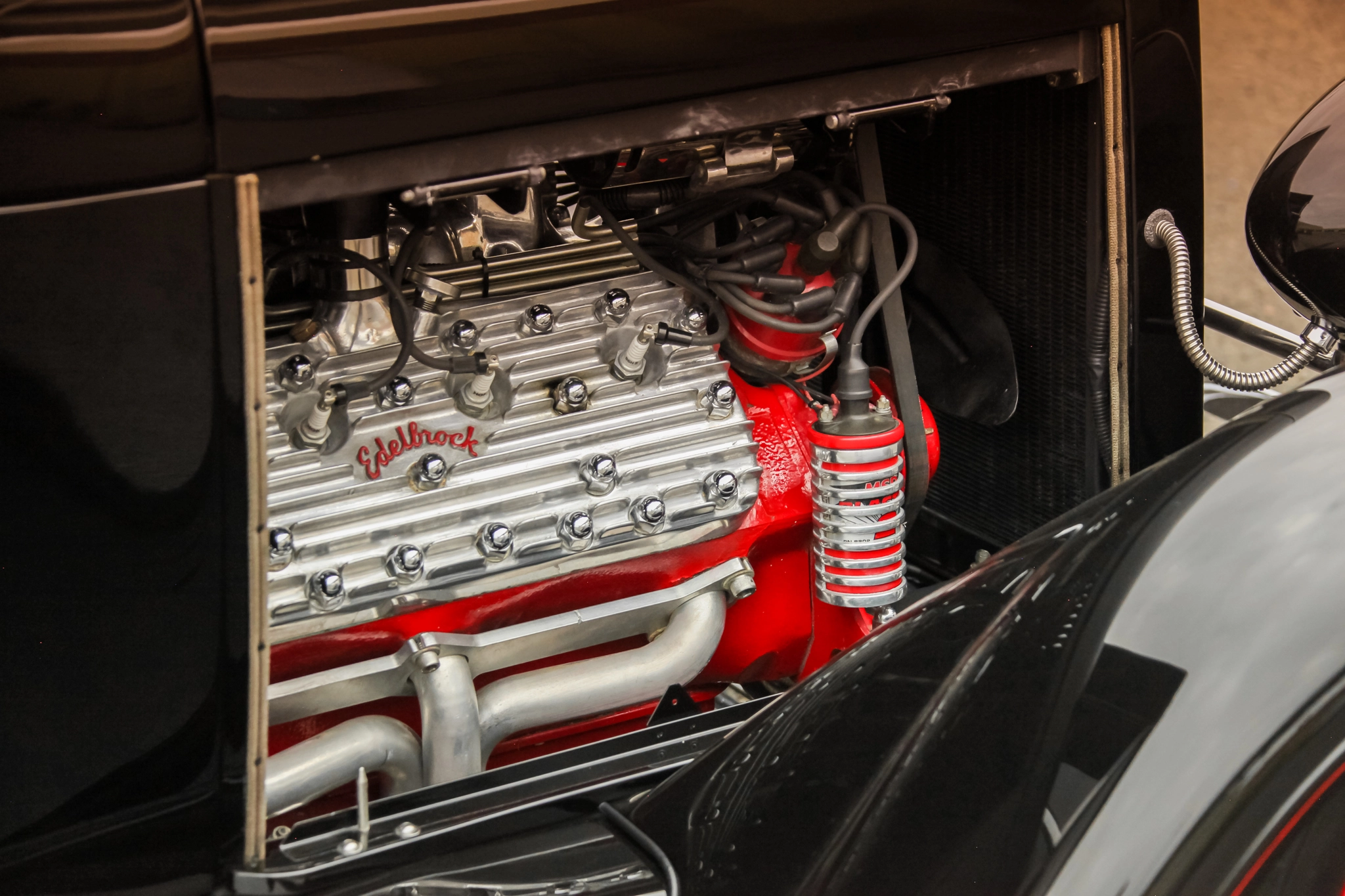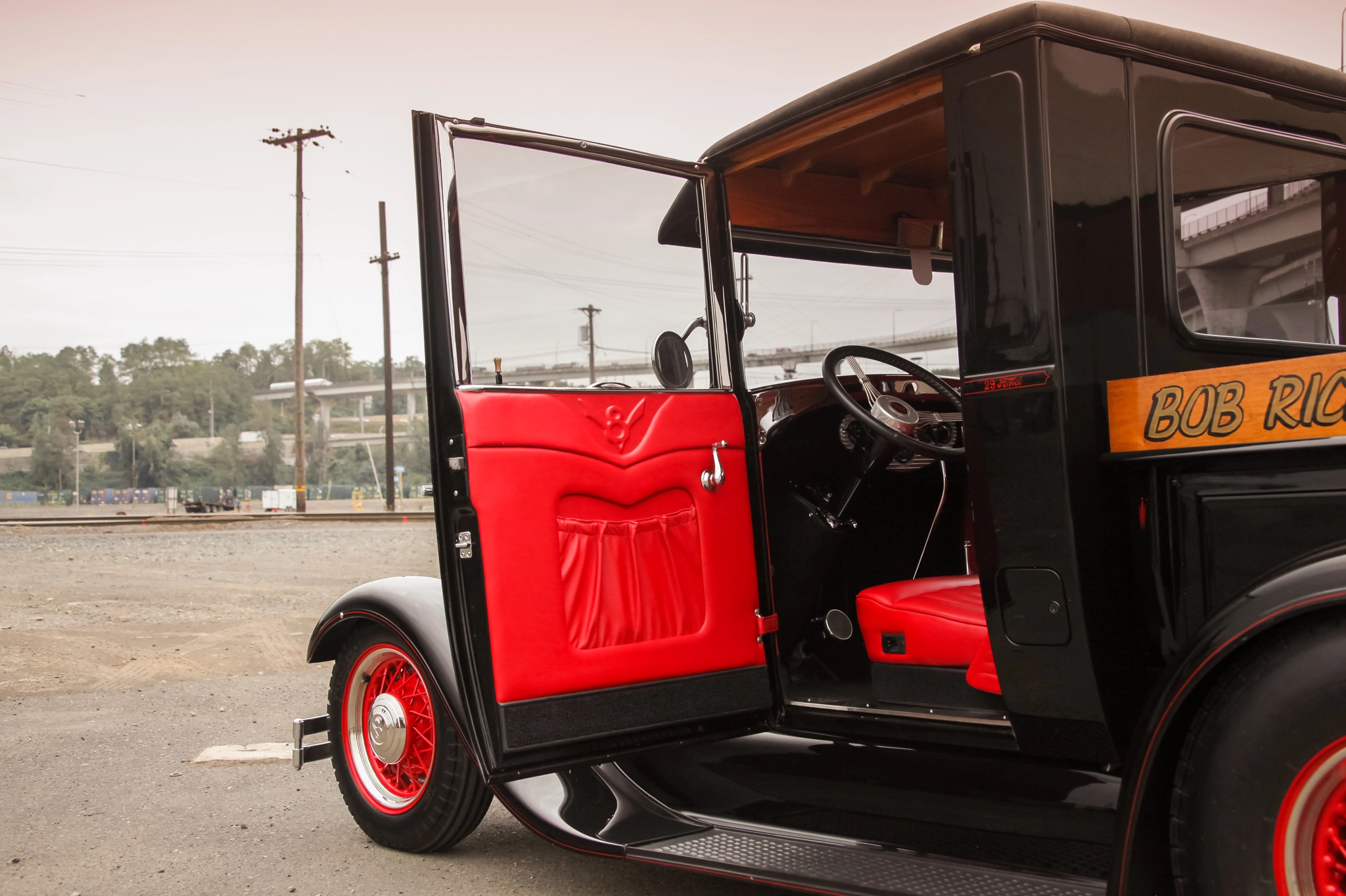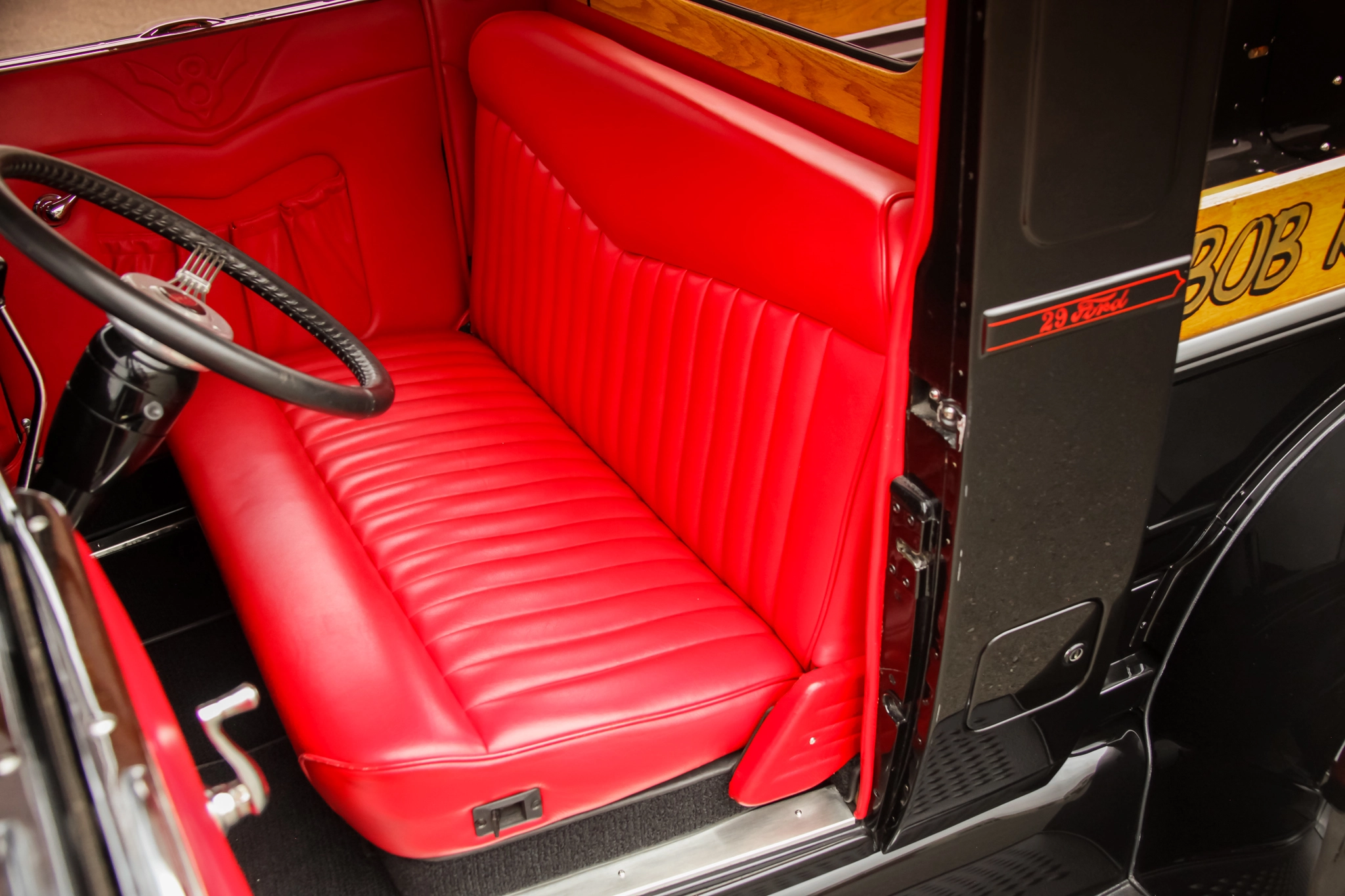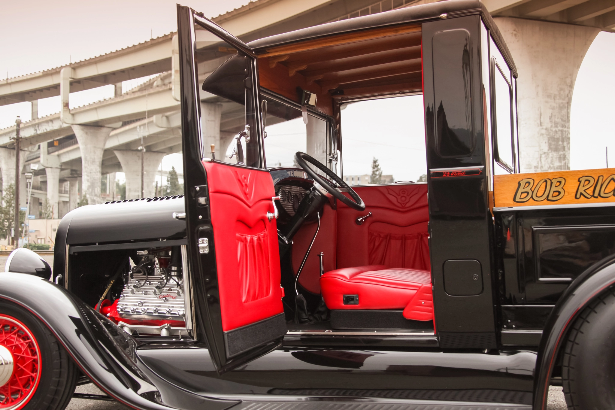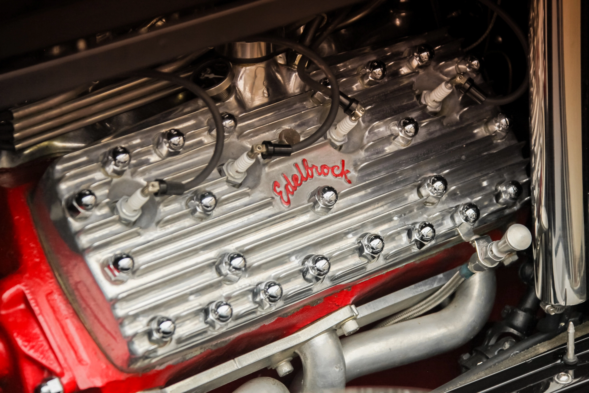 La cabine est dotée d’une banquette rembourrée en vinyle rouge et de panneaux assortis montés sur les portes. L’équipement supplémentaire comprend des garnitures en bois, une moquette noire, un frein à main monté au plancher, un levier de vitesses Lokar et un rétroviseur Vintage. Un volant de style banjo se trouve devant un tableau de bord couleur carrosserie abritant une instrumentation VDO.