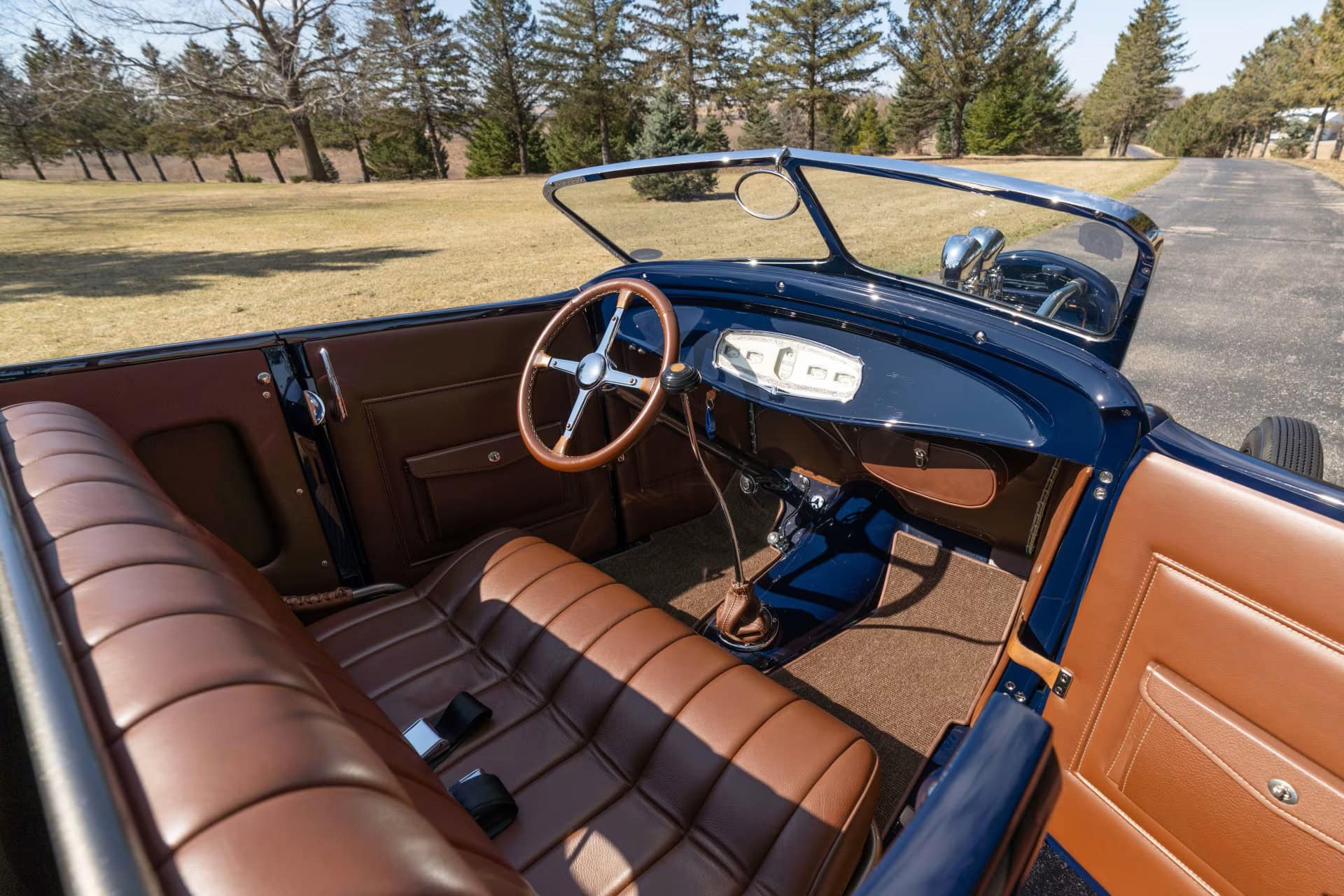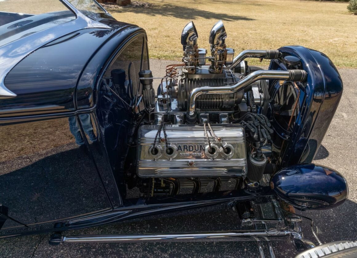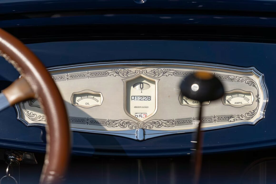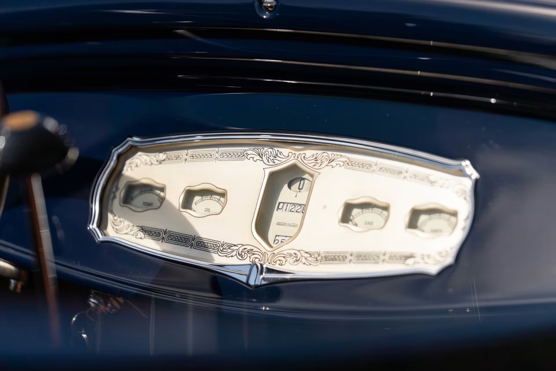 En effet, peu m’importe que la carrosserie a été bien adaptée en termes de râteau et de détails pour l’effort premier d’avoir créé un nouveau châssis “à l’identique” qui, de surcroit a été abordé par la police maritime section “drogues”… Ce Hot Rod porte une peinture bleu nuit, qui se marie bien avec le magnifique intérieur en cuir Tobacco. Cet intérieur comprend un volant à quatre branches gainé de cuir et un panneau de compteurs Stewart-Warner.