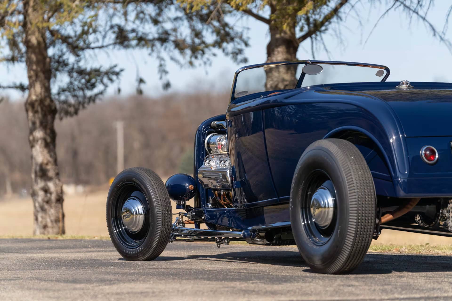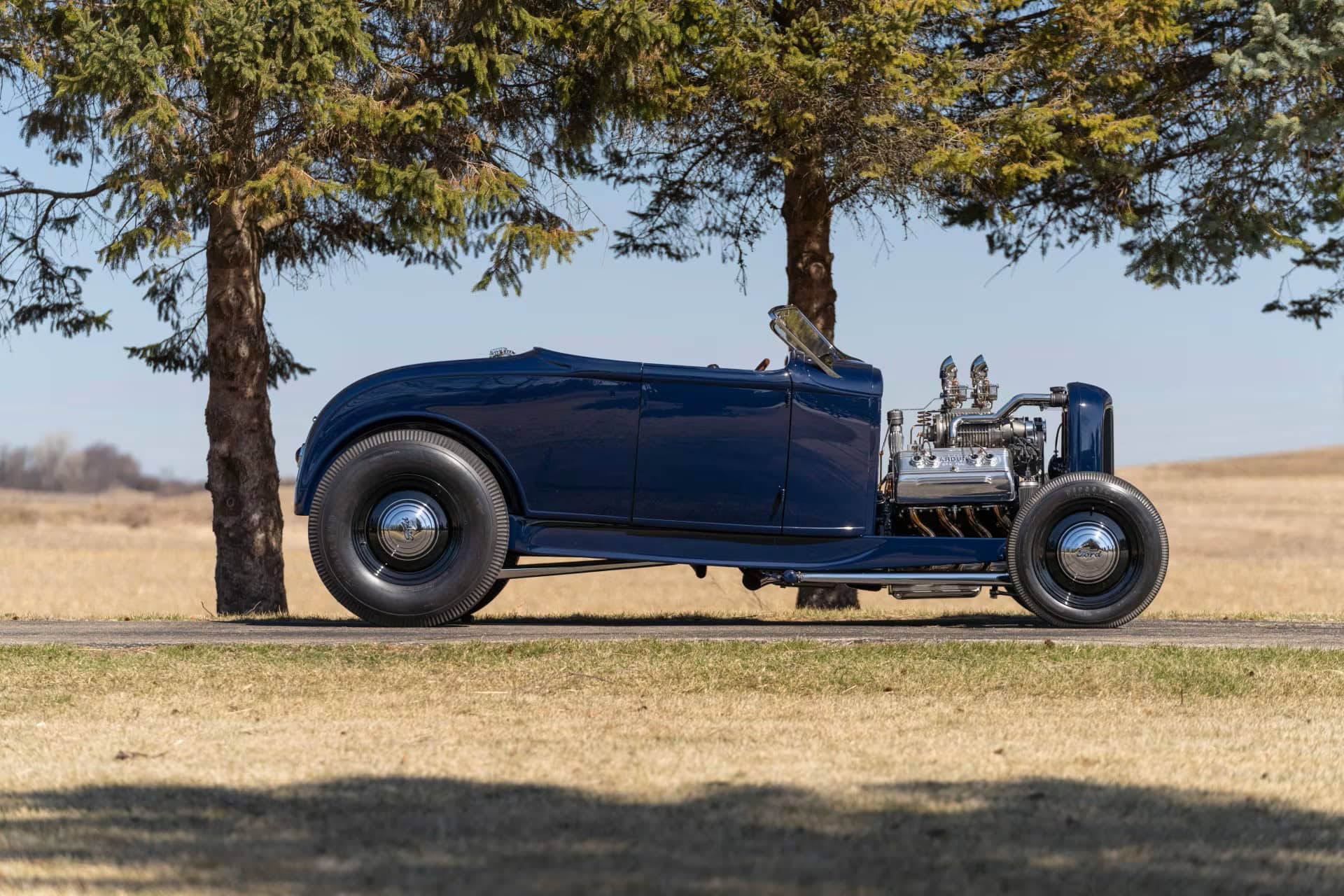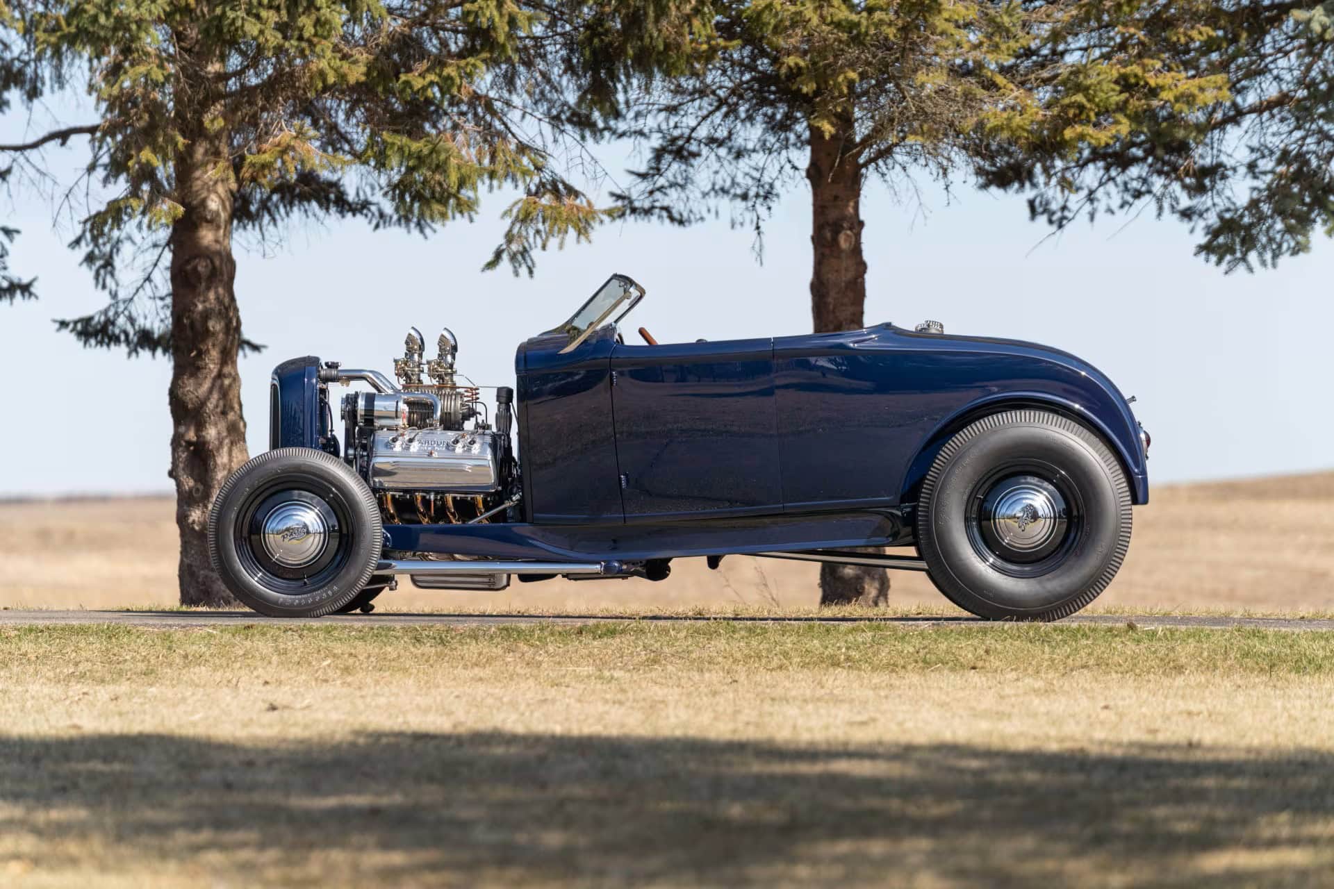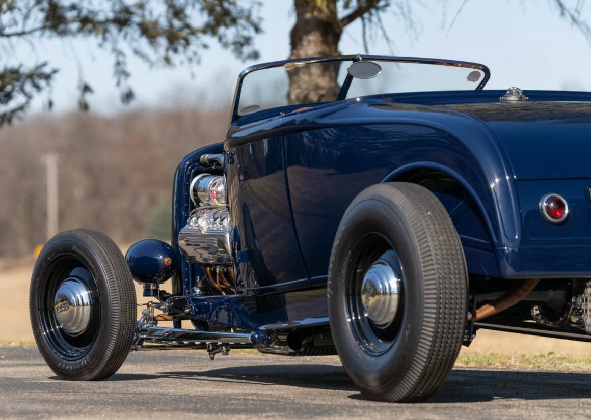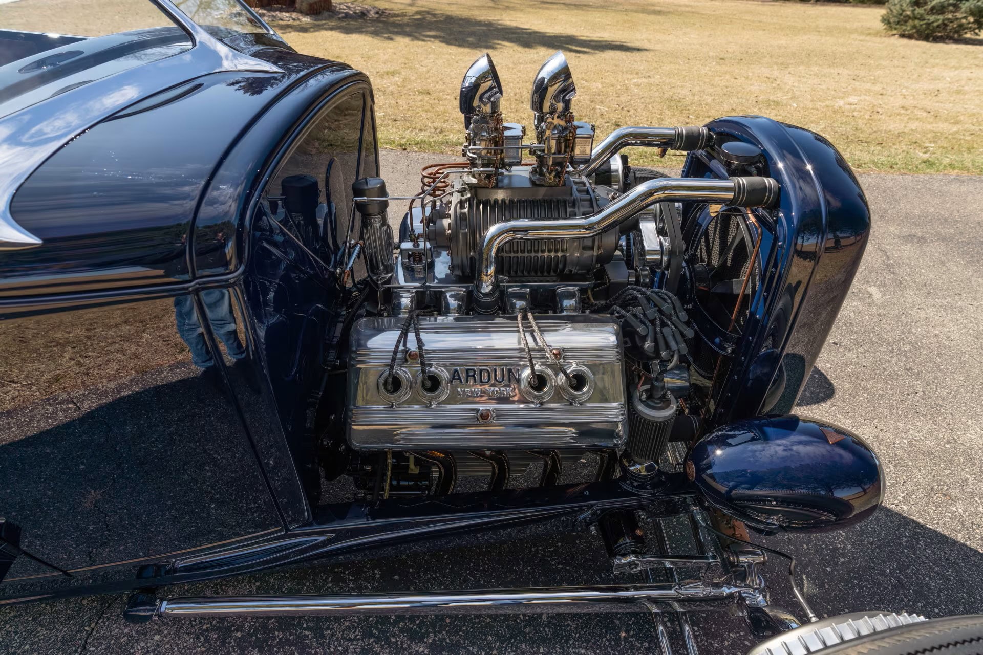 En effet, peu m’importe que la carrosserie a été bien adaptée en termes de râteau et de détails pour l’effort premier d’avoir créé un nouveau châssis “à l’identique” qui, de surcroit a été abordé par la police maritime section “drogues”… Ce Hot Rod porte une peinture bleu nuit, qui se marie bien avec le magnifique intérieur en cuir Tobacco. Cet intérieur comprend un volant à quatre branches gainé de cuir et un panneau de compteurs Stewart-Warner.