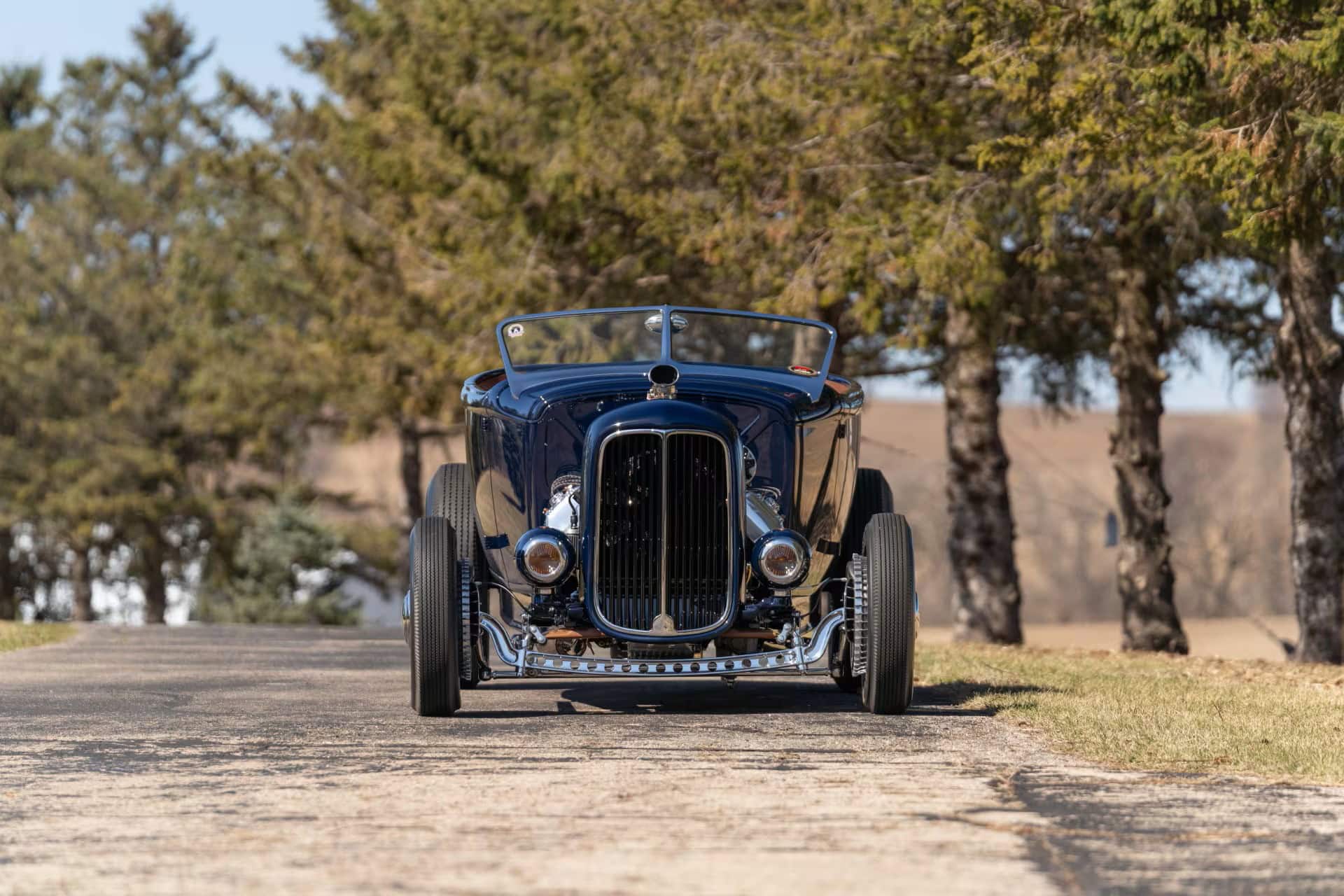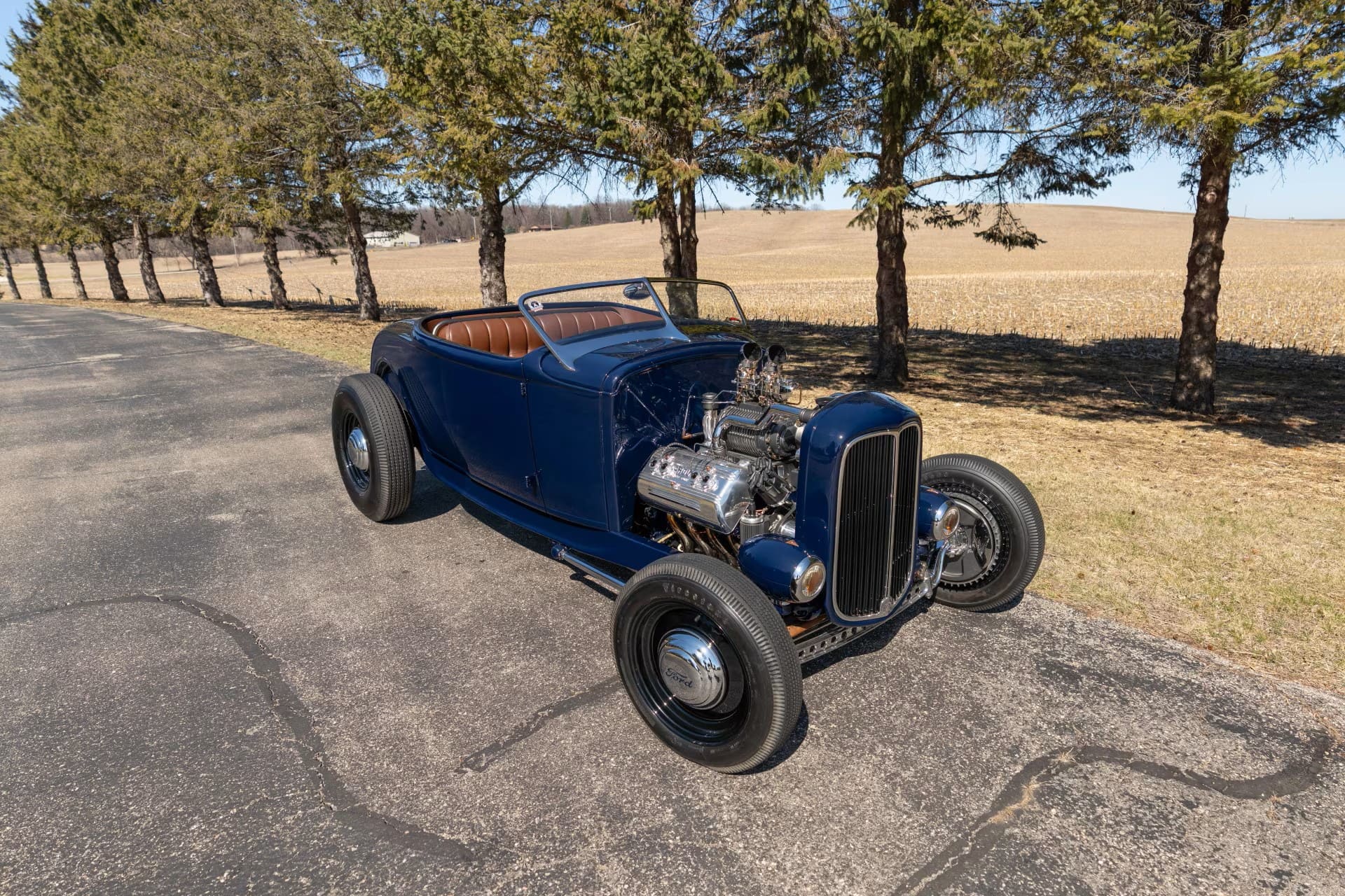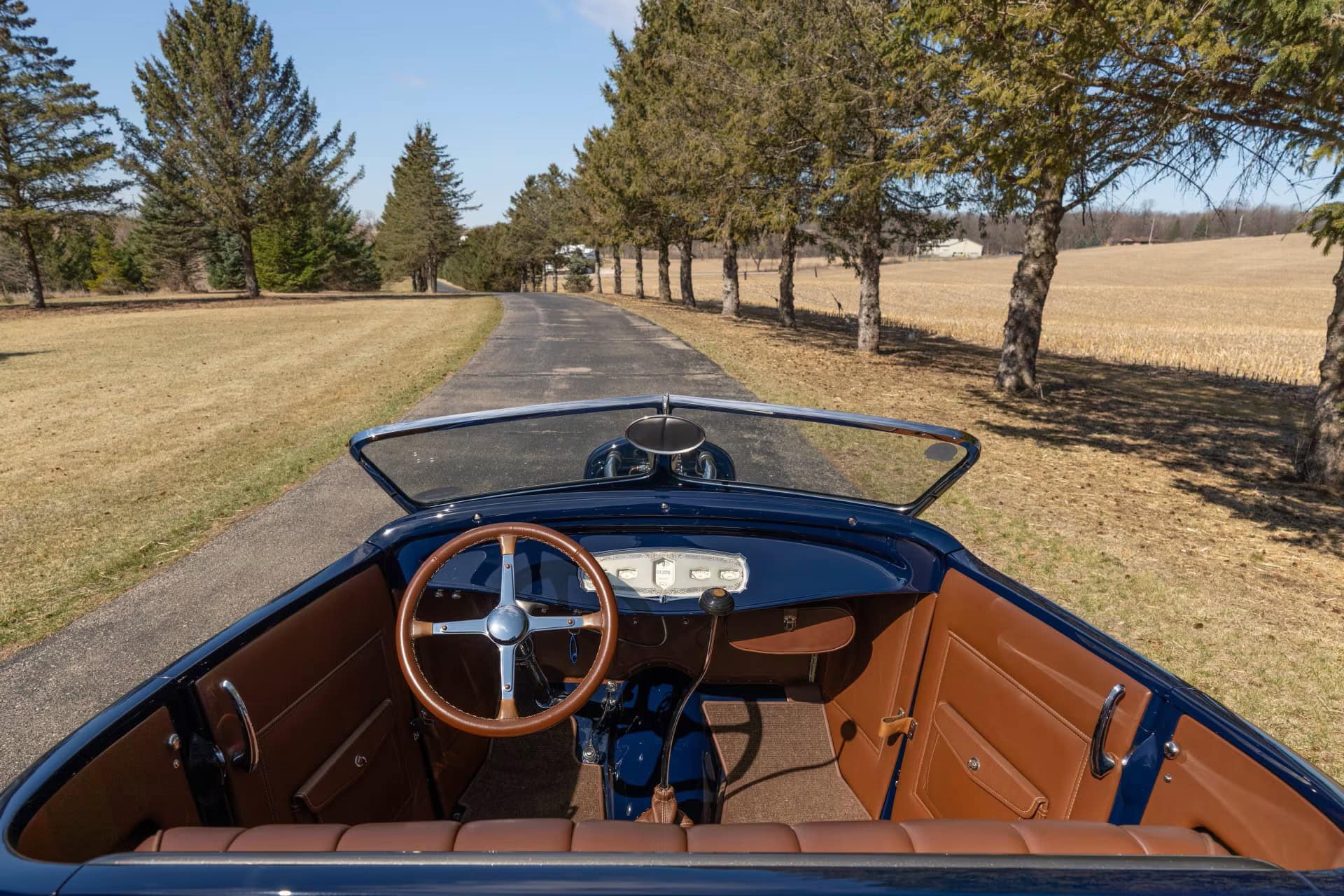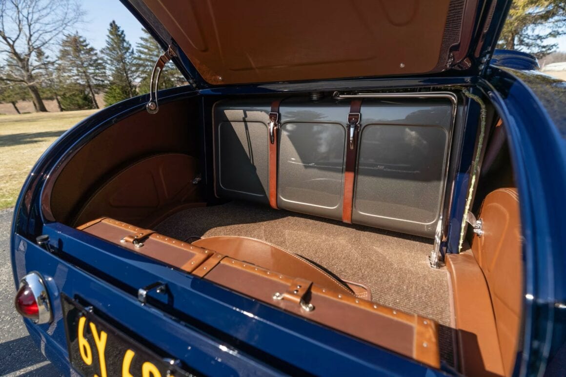 En effet, peu m’importe que la carrosserie a été bien adaptée en termes de râteau et de détails pour l’effort premier d’avoir créé un nouveau châssis “à l’identique” qui, de surcroit a été abordé par la police maritime section “drogues”… Ce Hot Rod porte une peinture bleu nuit, qui se marie bien avec le magnifique intérieur en cuir Tobacco. Cet intérieur comprend un volant à quatre branches gainé de cuir et un panneau de compteurs Stewart-Warner.