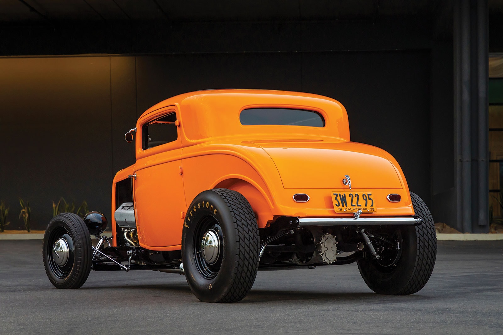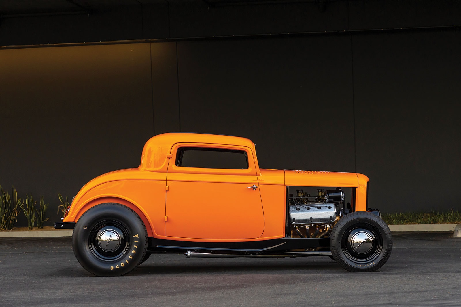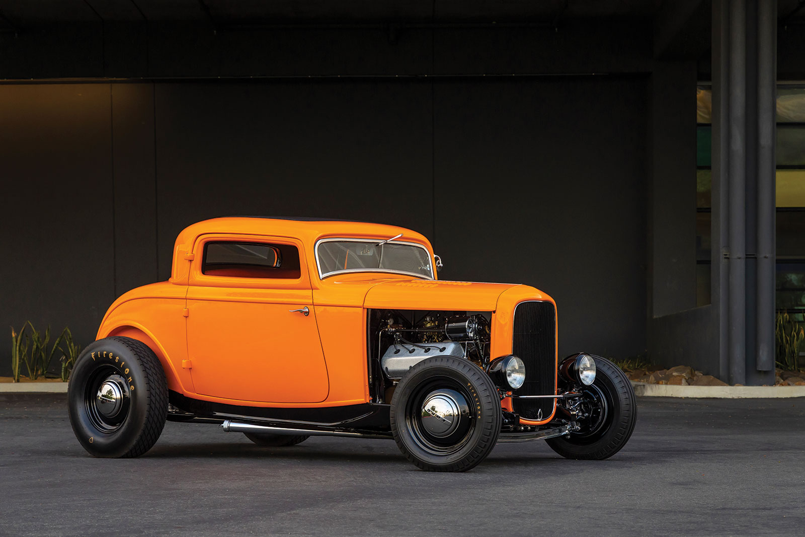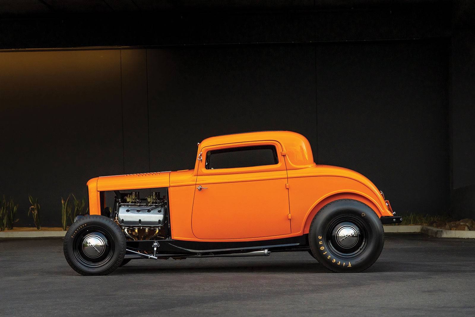Le système de carburant utilise une pompe à carburant Holley rotative et des tubes de filtre à air en acier inoxydable de 1, 3, 4 pouces faits maison. La carrosserie du coupé Deuce à trois fenêtres en acier est une Brookville Roadster coupée de 3 pouces à l’arrière et de 3-1/2 pouces à l’avant. Tout le bois nécessaire a également été fourni par Brookville Roadster. Le capot et la calandre (remplis et culminés) sont d’origine Ford 32 avec 36 persiennes personnalisées de 3 pouces percées dans le haut du capot. Les coutures de la carrosserie et les interstices des portes ont été gérés par Ron Lindeman tandis que Hollywood Hot Rods s’est occupé du pare-feu, il ressemble donc à un Deuce original. Hollywood Hot Rods a également ajouté un pouce de métal au bas du tableau de bord, il s’agit d’un tableau de bord coupé Ford à trois fenêtres avec un insert tourné par moteur.