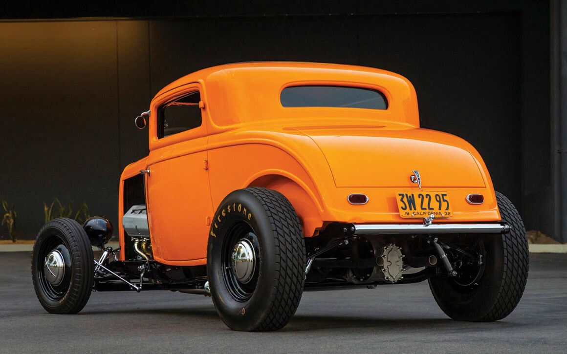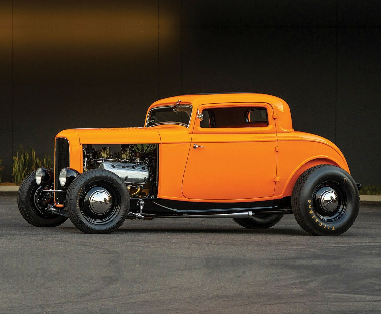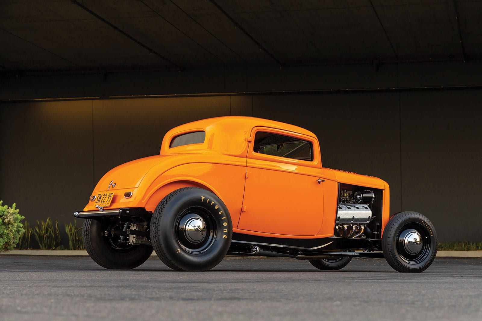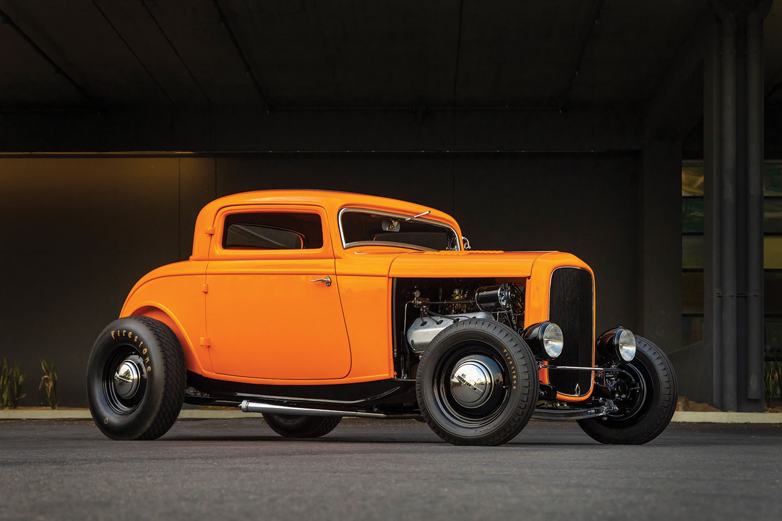 Le système de carburant utilise une pompe à carburant Holley rotative et des tubes de filtre à air en acier inoxydable de 1, 3, 4 pouces faits maison. La carrosserie du coupé Deuce à trois fenêtres en acier est une Brookville Roadster coupée de 3 pouces à l’arrière et de 3-1/2 pouces à l’avant. Tout le bois nécessaire a également été fourni par Brookville Roadster. Le capot et la calandre (remplis et culminés) sont d’origine Ford 32 avec 36 persiennes personnalisées de 3 pouces percées dans le haut du capot. Les coutures de la carrosserie et les interstices des portes ont été gérés par Ron Lindeman tandis que Hollywood Hot Rods s’est occupé du pare-feu, il ressemble donc à un Deuce original. Hollywood Hot Rods a également ajouté un pouce de métal au bas du tableau de bord, il s’agit d’un tableau de bord coupé Ford à trois fenêtres avec un insert tourné par moteur.