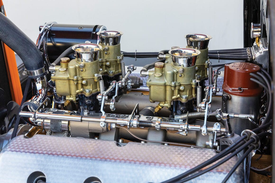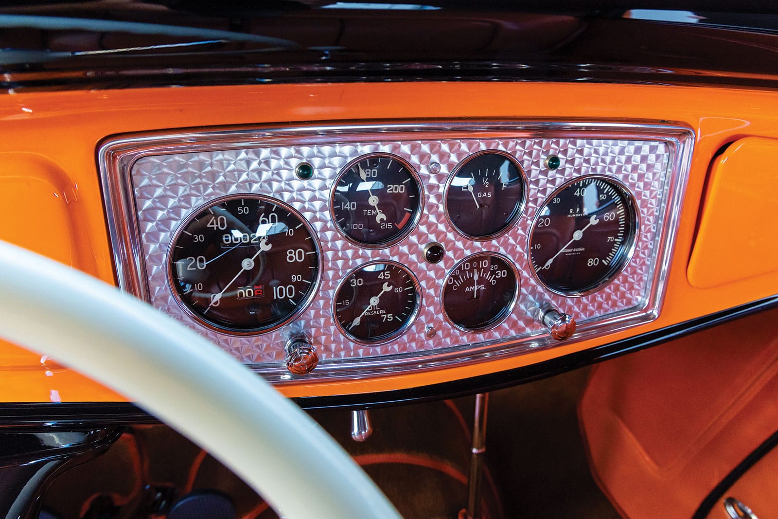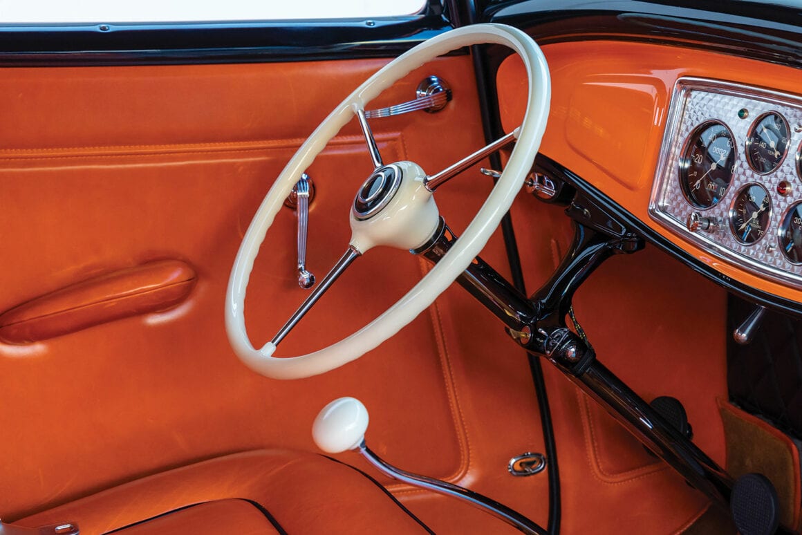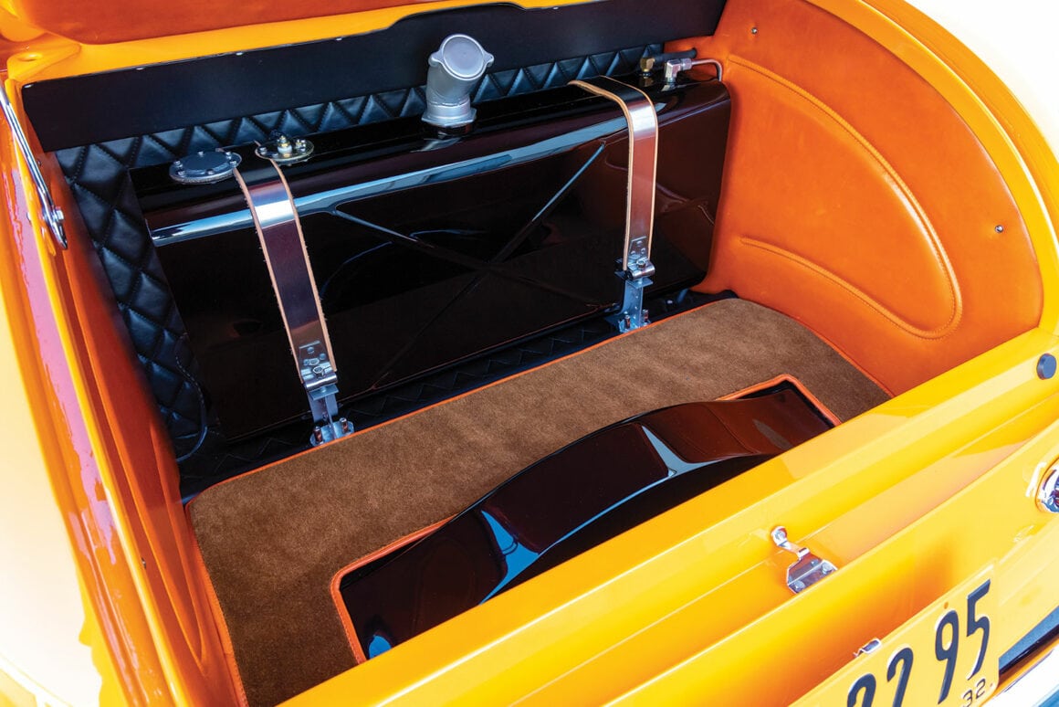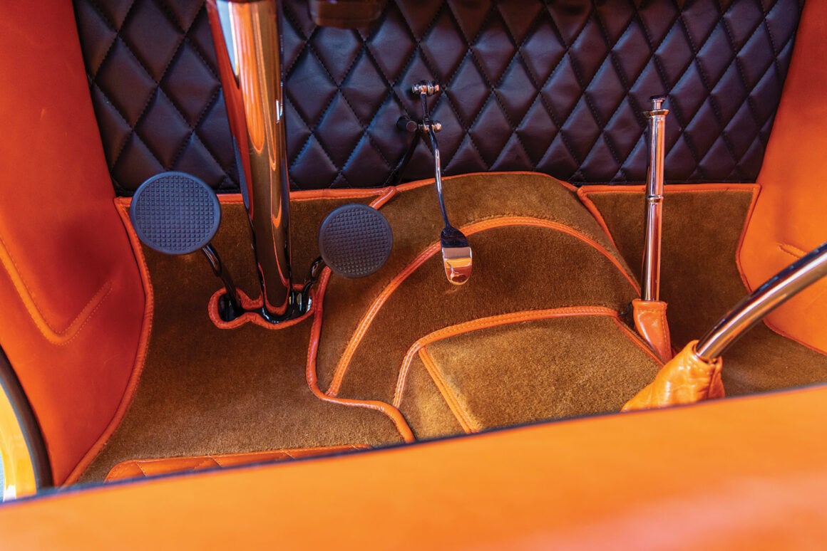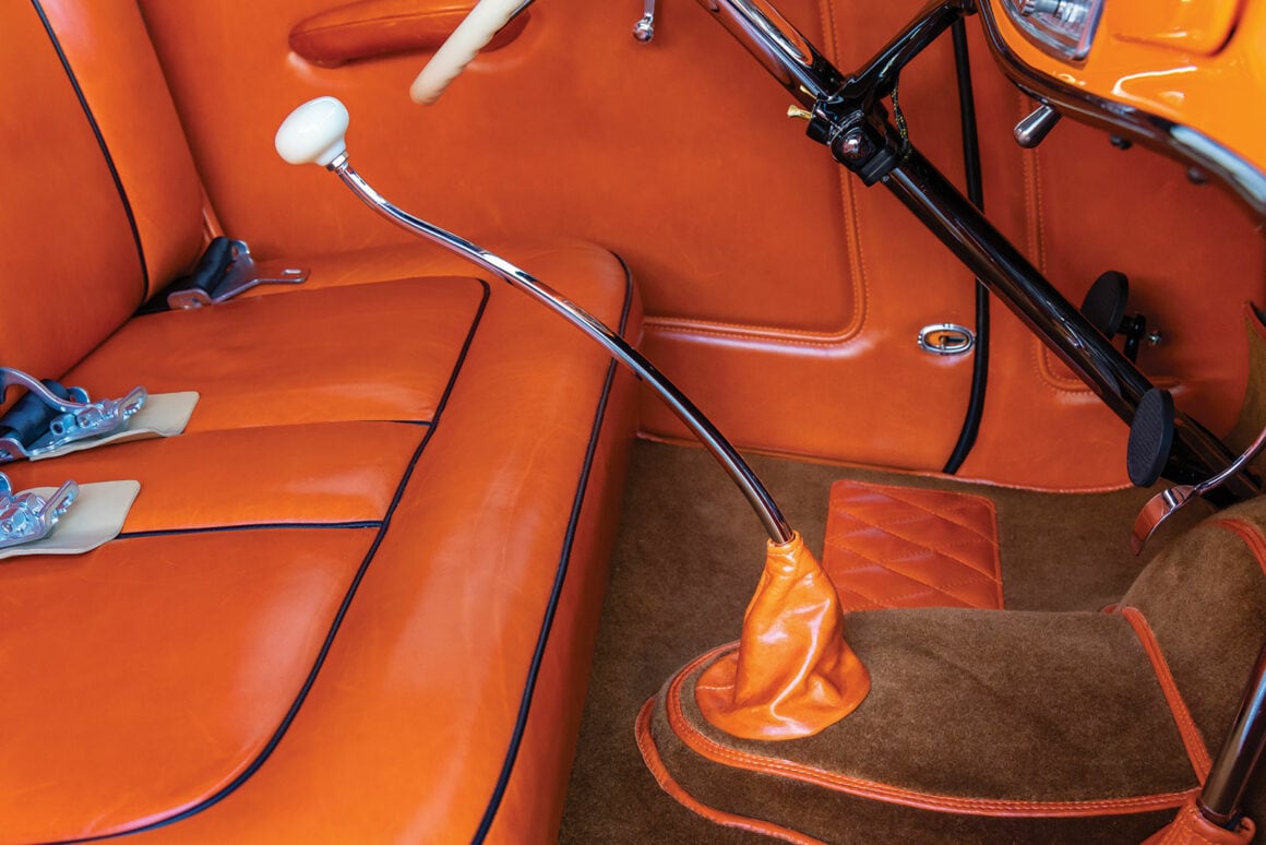 D’autres équipements intérieurs incluent des poignées et des boutons de fenêtre et de porte Ford ’37 avec des accoudoirs de porte Ford ’51 ainsi qu’un levier de clignotants sur mesure fabriqué à l’aide d’une lunette de boîte à gants Ford ’39. Steve m’a dit : “C’est un accélérateur original que j’ai modifié à la suite d’un article lu sur Hot Rod des années 50 montrant comment déplacer l’accélérateur de la traction du côté gauche à la traction du côté droit”... Gary Hudson a également contribué à l’assemblage général et Squeak White de Squeak’s Metalworks s’est occupé du soudage spécialisé sur l’entrée de remplissage du réservoir d’essence, le capot et les extensions de calandre inférieure. Ensuite, Tom Rodriquez Sr. de Cypress Auto Body s’est occupé de la carrosserie et de la peinture orange Valspar correspondant à une Bugatti ’31 de l’ancienne collection automobile Peter Mullin à Oxnard, en Californie.
