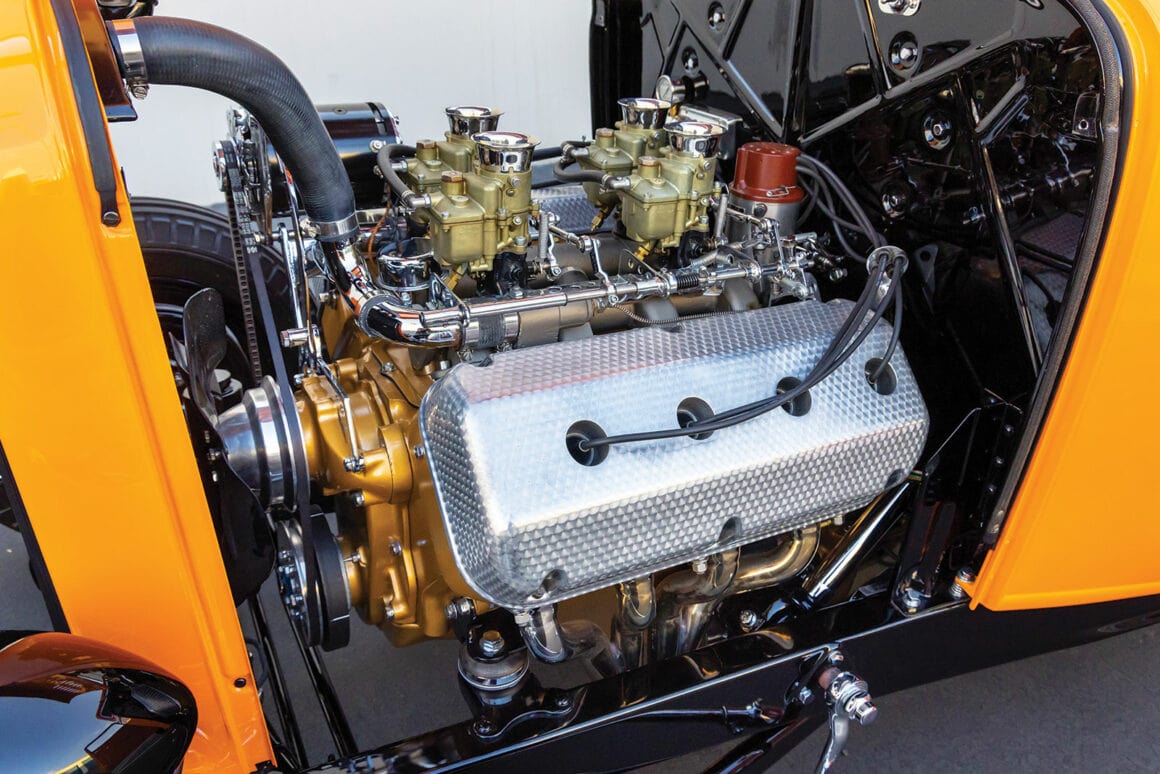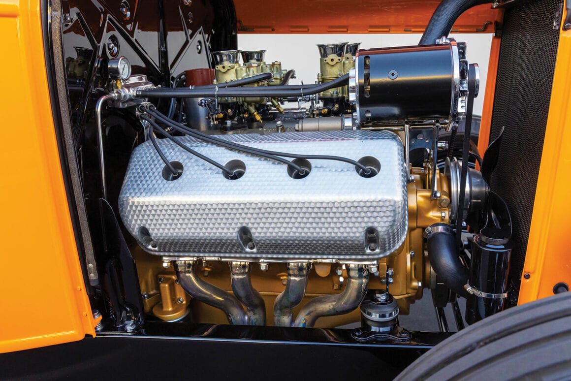 À l’avant, des Steelies Ford 16 × 4,5 avec des enjoliveurs à lettres Ford sont utilisés, ainsi qu’à l’arrière des jantes de 6 pouces de large avec des enjoliveurs. Le caoutchouc provient de Coker Firestone ce sont des nervurés 5,00 Dirt Track Specials à l’avant et 8,90 Dirt Track Specials à l’arrière… Steve, il a opté pour une “cloche allongée” de 1953 (’51-53). Squeak’s Metalworks s’est occupé du soudage spécialisé sur l’entrée de remplissage du réservoir d’essence (La cloche allongée provient de la partie allongée du boîtier de cloche qui sort de l’arrière du bloc. Malheureusement pour les Hot Rodders, l’extension fait saillie dans l’habitacle et mange l’espace au niveau des pieds.)… Le moteur Hemi en dispose de pistons Ross 10,5: 1, de cames de course Isky , de têtes d’origine retravaillées, de boulons ARP, d’un ensemble de soupapes Rocker Arms Unlimited et de couvercles de soupapes lisses Hot Heads.