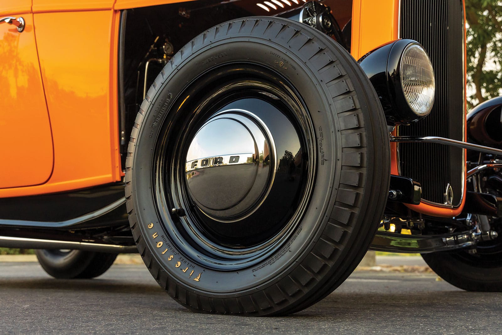 Un ressort à lames transversal modèle A, d’autres amortisseurs à tube chromé SO-CAL Speed Shop, un ensemble personnalisé de bras oscillants Ford ’36, une barre stabilisatrice Deuce Factory de 1 pouce et une barre Panhard personnalisée sont également utilisés à l’arrière. Les freins arrière sont basés sur la Ford d’origine ’40 couplée au frein électronique qui l’accompagne. Les freins sont actionnés via un maître-cylindre à double réservoir Mustang avec une valve d’hélice en ligne conçue pour l’utilisation des freins à tambour. Un pédalier Ford ’36 est adopté sur le châssis Deuce. Steve Biermann, l’un des amis de Steve, a aidé à “suspendre” l’arrière, à aligner l’avant et à effectuer divers travaux de soudure. Conformément au thème du Hot-Rod du milieu des années’50, l’utilisation de pneus Steelies est indispensable.