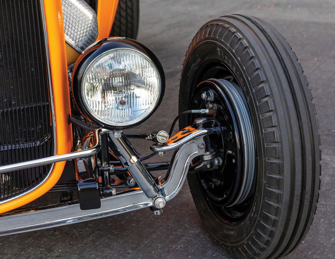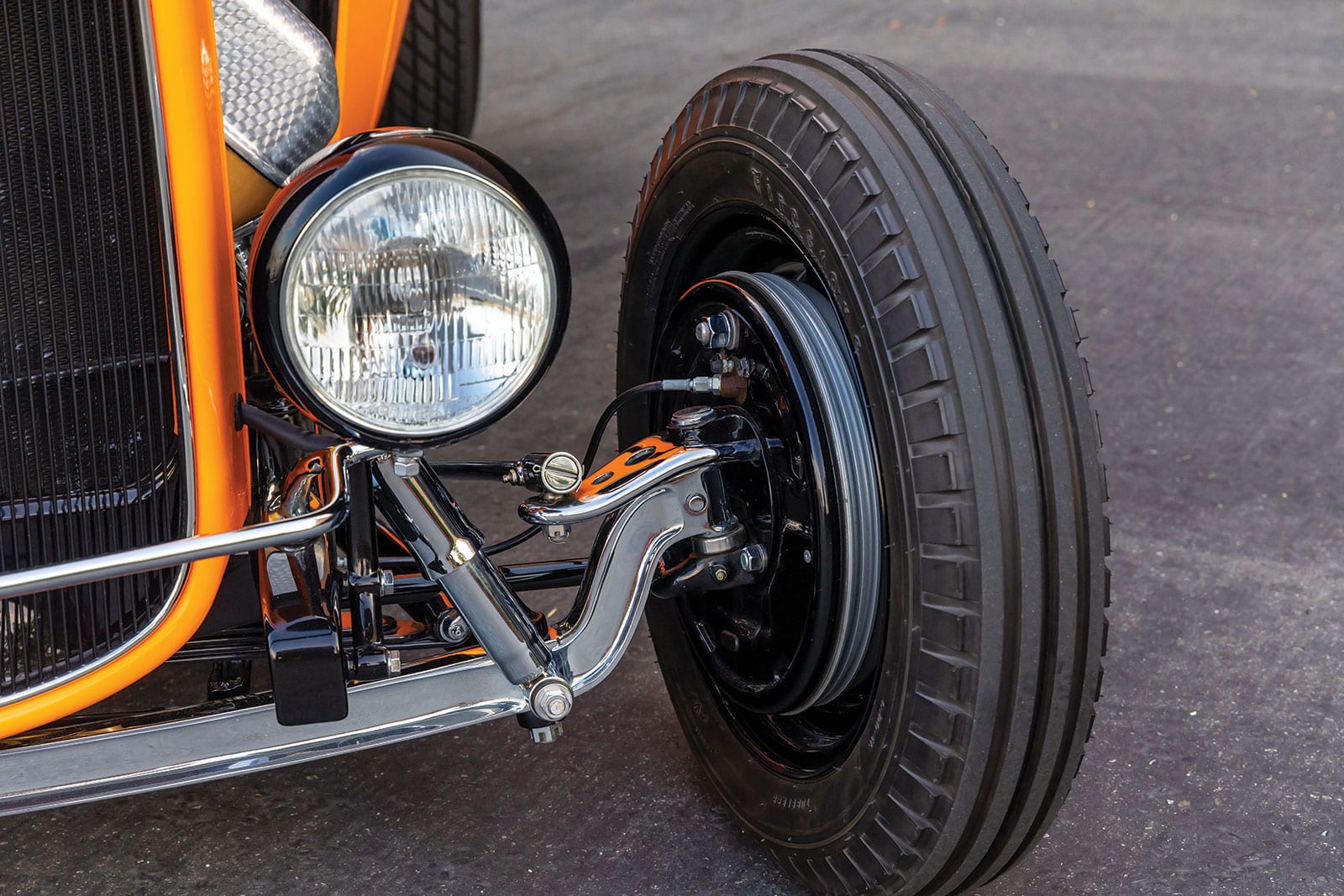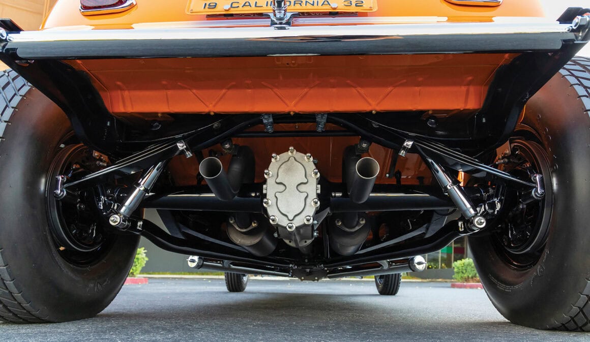 Les rails eux-mêmes sont encadrés, par un X Ford ’36, les cornes du châssis avant sont inclinées et l’arrière des rails est surélevé pour correspondre à l’arrière de la carrosserie. La suspension est basée sur un essieu abaissé original de 4 pouces Ford ’32 d’ Anson Axles , rectifié en douceur et culminé par Steve. À partir de là, les axes 37-41 sont utilisés avec des freins de camion Ford de 12 pouces et des tambours de frein de style Lincoln avec des trous d’aération usinés dans les plaques d’appui. La direction est assurée par un boîtier de direction de camion Ford F1. Les amortisseurs sont les tubes chromés traditionnels avec cache-poussière directement de SO-CAL Speed Shop . La suspension arrière est basée sur une extrémité arrière Winters Quick Change avec des cloches d’essieu Ford ’36 et des essieux avec un rapport global de 3,78.