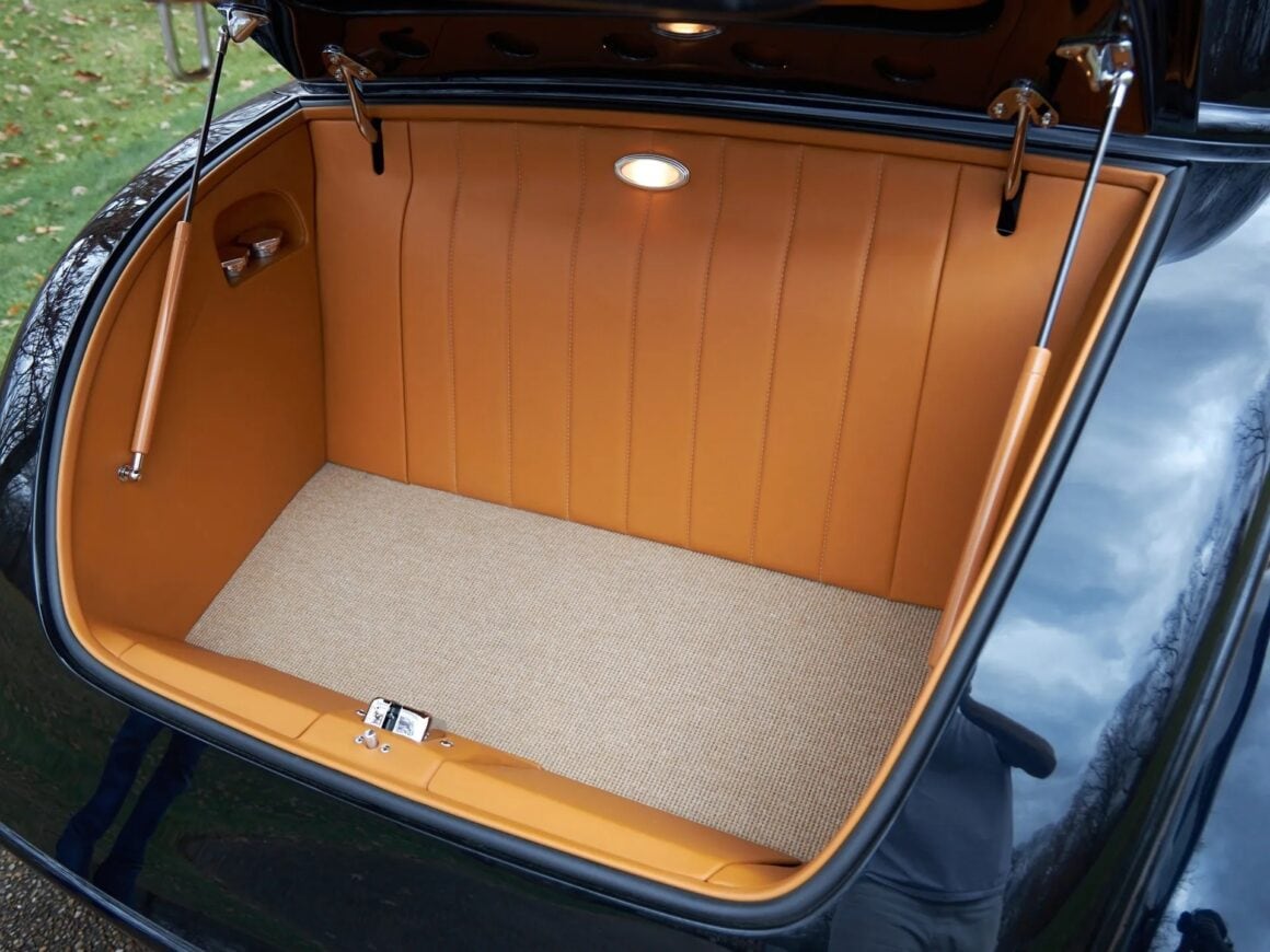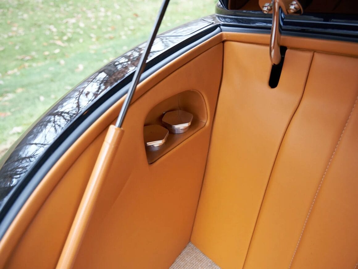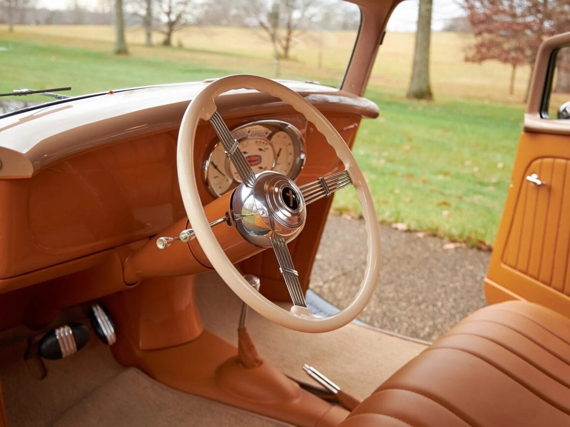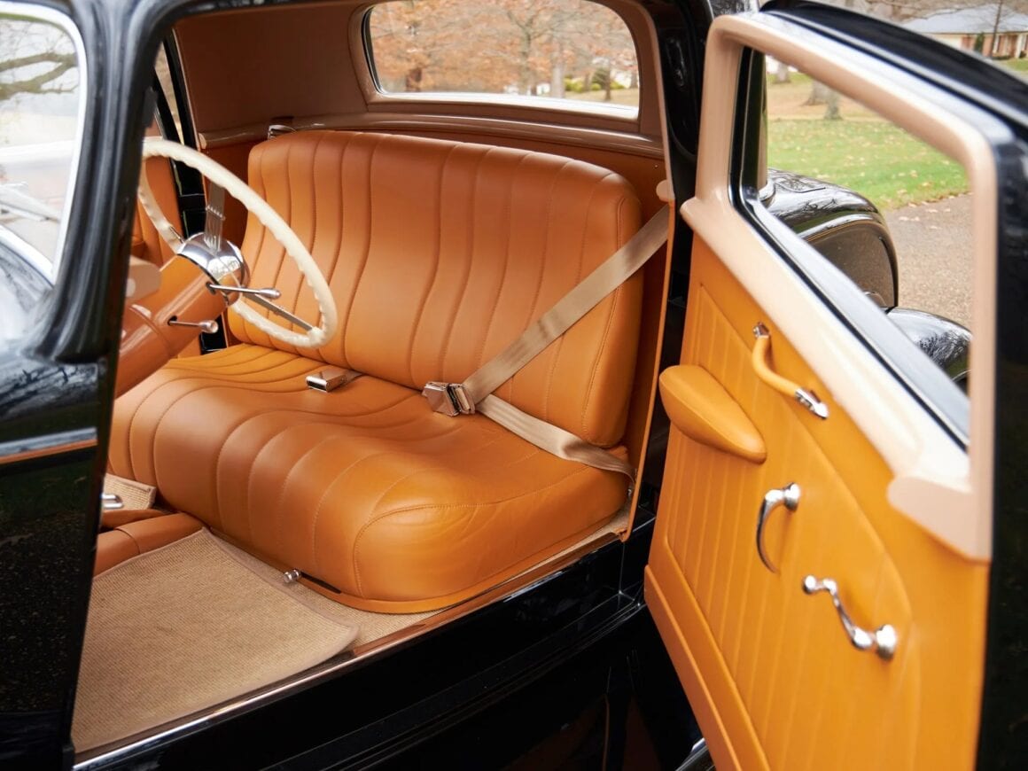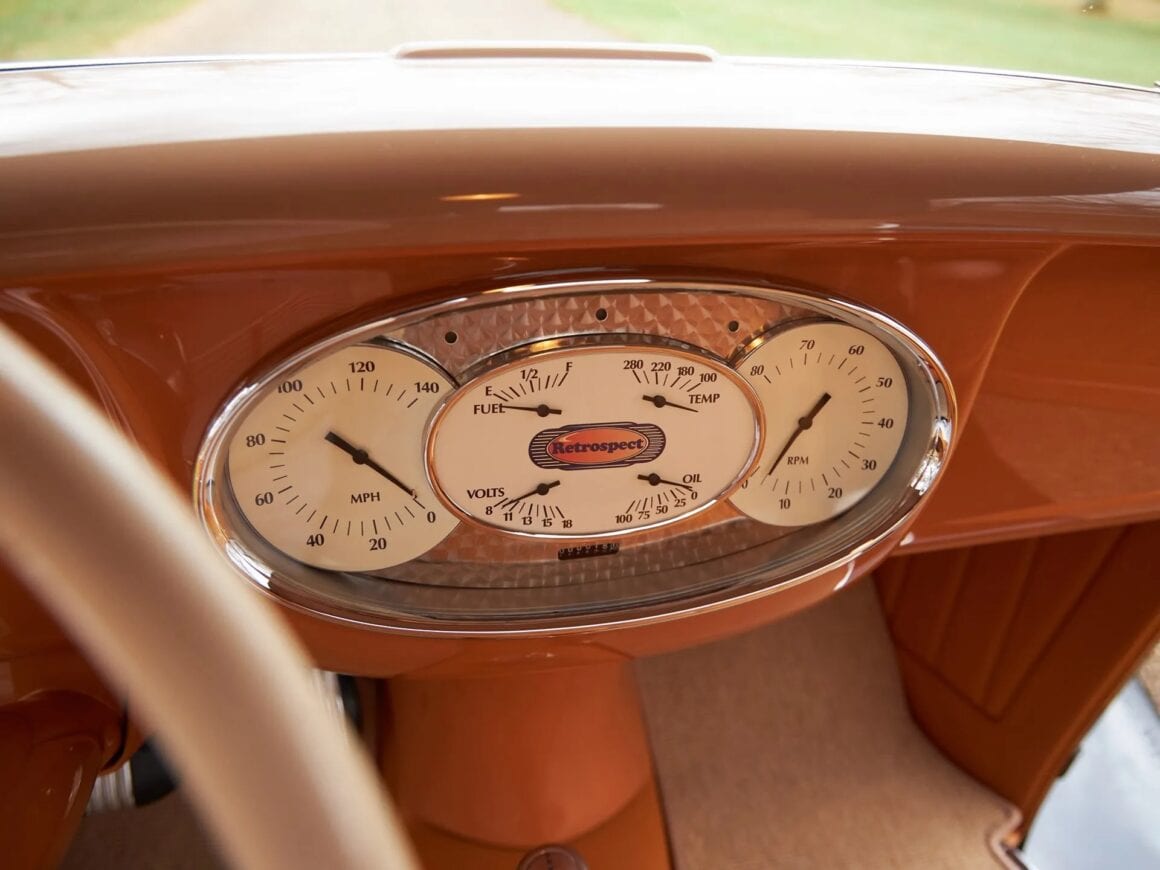 Les détails subtils abondent: un tablier personnalisé relie les ailes fluides de la voiture juste sous une interprétation modifiée de la calandre emblématique de la Ford 1932; les badges, les charnières de portes et même la poignée du coffre ont été enlevés; le bouchon de remplissage du radiateur a été caché sous le capot pour un look plus propre. Il est fini dans un bleu profond si sombre que, dans une certaine lumière, il semble presque noir. Pendant des générations, la Ford B’32 a servi de toile vierge ultime pour d’innombrables Hot-Rods, des constructions d’arrière-cour enthousiastes mais d’amateurs, jusqu’aux créations sans regarder aux frais qui mettent en valeur le meilleur de l’artisanat automobile américain. Ce coupé à trois fenêtres, surnommé “Retrospect”, est un exemple exceptionnel : lorsqu’il a fait ses débuts à l’Autorama de Detroit, il a été honoré en tant que finaliste-vainqueur du “Great 8” pour le très convoité “Ridler Award”, l’un des trophées les plus disputés au monde des voitures personnalisées ! Une attention égale a été accordée à l’intérieur, qui a été garni d’un riche cuir couleur cognac-français (une couleur portée à l’extérieur par des paires de rayures subtiles). Les instruments montés au centre sont placés dans un panneau tourné vers le moteur, mais l’appareillage de commutation et les autres distractions sont réduits au minimum.