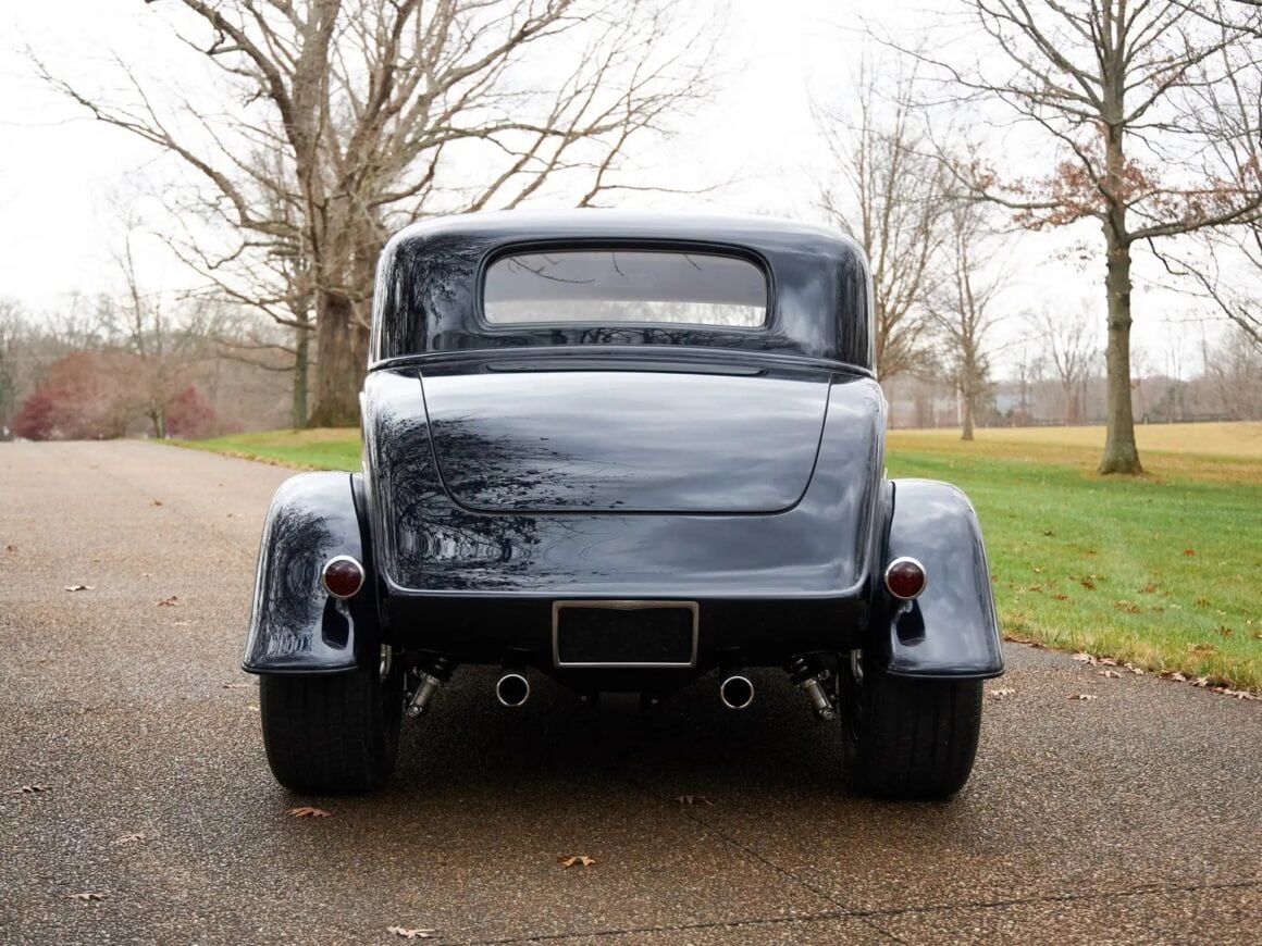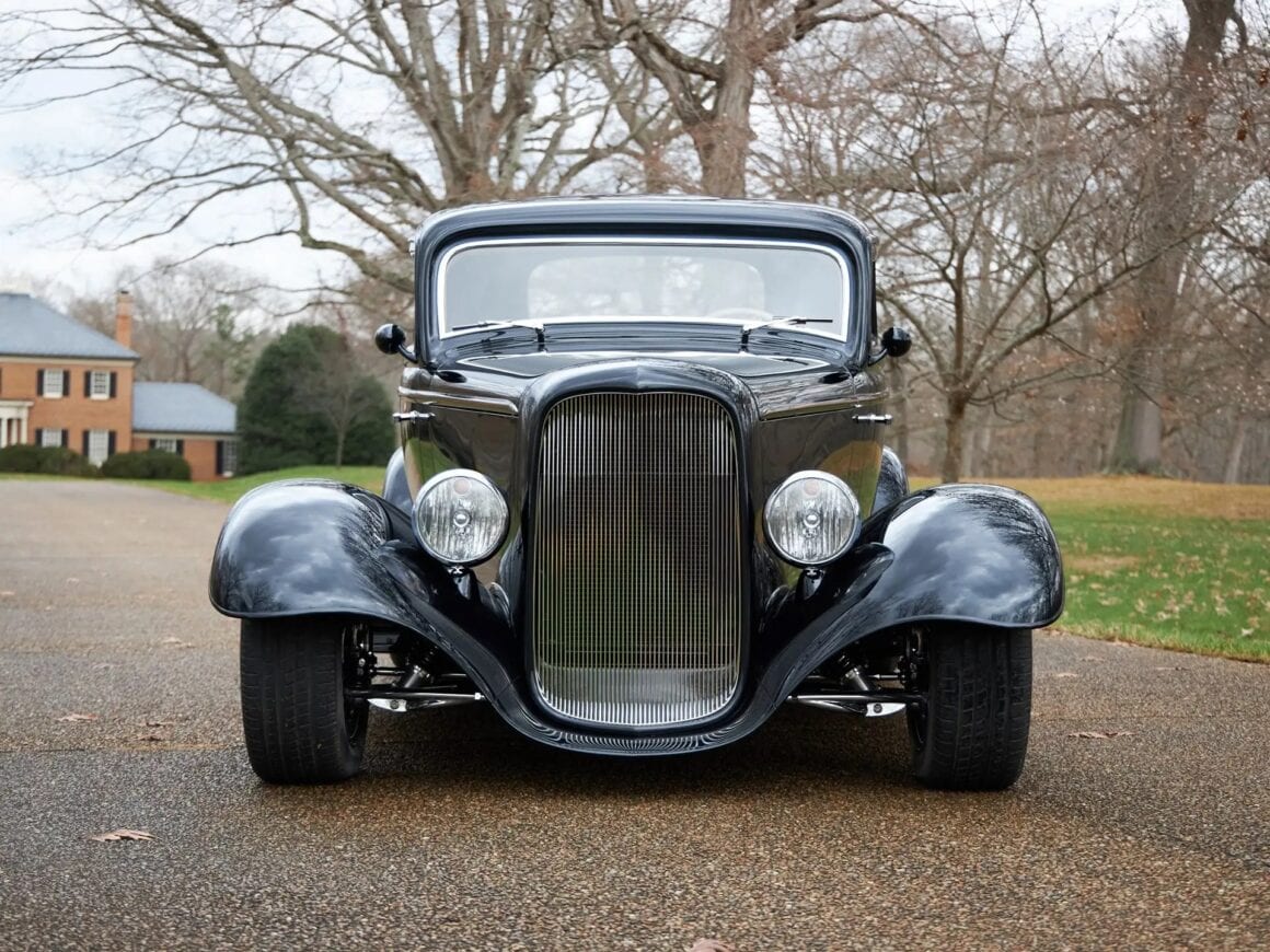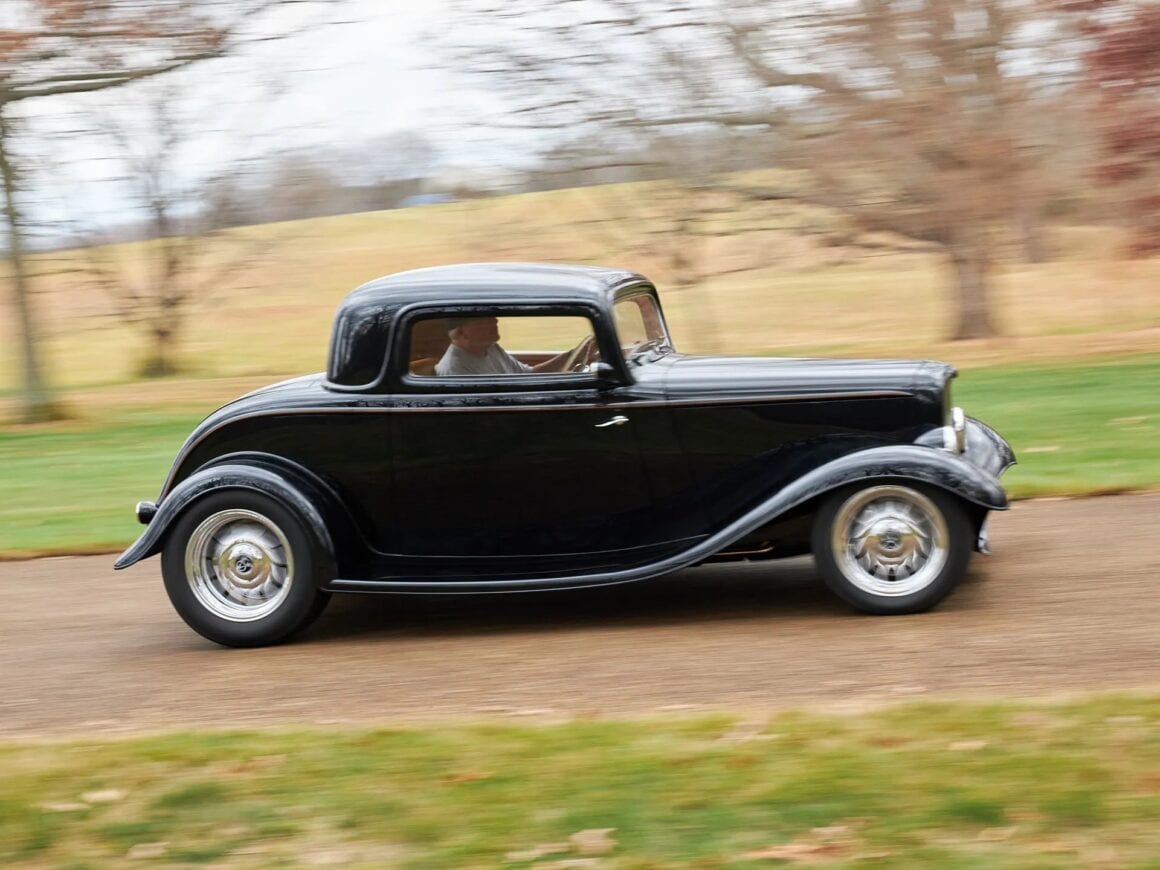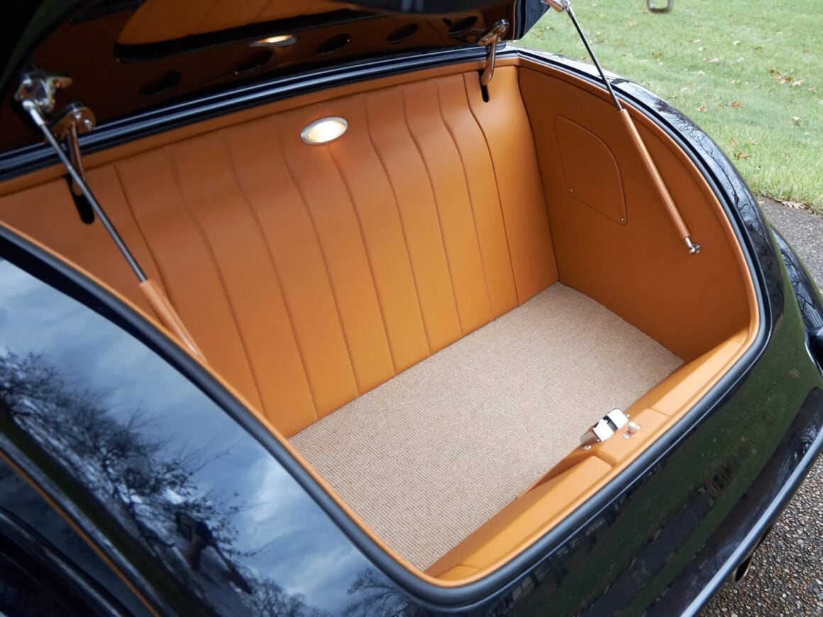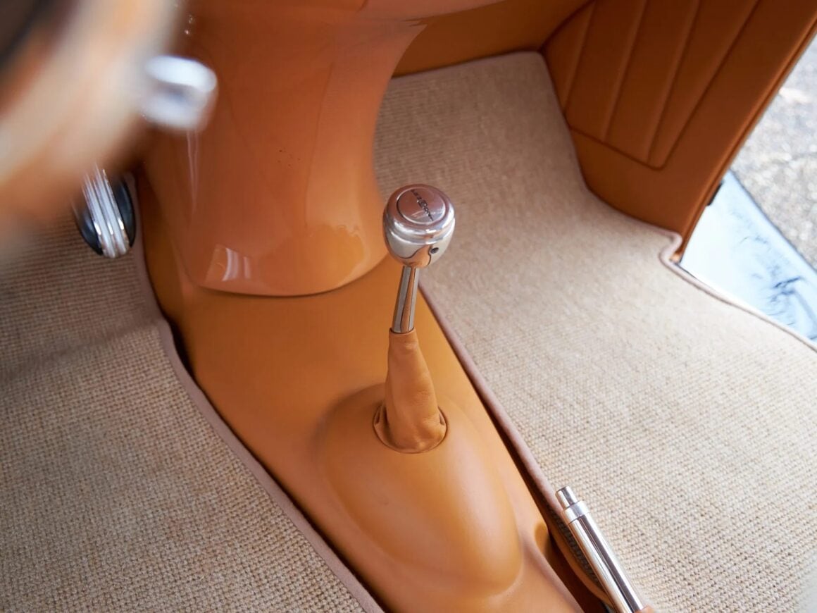 Les détails subtils abondent: un tablier personnalisé relie les ailes fluides de la voiture juste sous une interprétation modifiée de la calandre emblématique de la Ford 1932; les badges, les charnières de portes et même la poignée du coffre ont été enlevés; le bouchon de remplissage du radiateur a été caché sous le capot pour un look plus propre. Il est fini dans un bleu profond si sombre que, dans une certaine lumière, il semble presque noir. Pendant des générations, la Ford B’32 a servi de toile vierge ultime pour d’innombrables Hot-Rods, des constructions d’arrière-cour enthousiastes mais d’amateurs, jusqu’aux créations sans regarder aux frais qui mettent en valeur le meilleur de l’artisanat automobile américain. Ce coupé à trois fenêtres, surnommé “Retrospect”, est un exemple exceptionnel : lorsqu’il a fait ses débuts à l’Autorama de Detroit, il a été honoré en tant que finaliste-vainqueur du “Great 8” pour le très convoité “Ridler Award”, l’un des trophées les plus disputés au monde des voitures personnalisées ! Une attention égale a été accordée à l’intérieur, qui a été garni d’un riche cuir couleur cognac-français (une couleur portée à l’extérieur par des paires de rayures subtiles). Les instruments montés au centre sont placés dans un panneau tourné vers le moteur, mais l’appareillage de commutation et les autres distractions sont réduits au minimum.