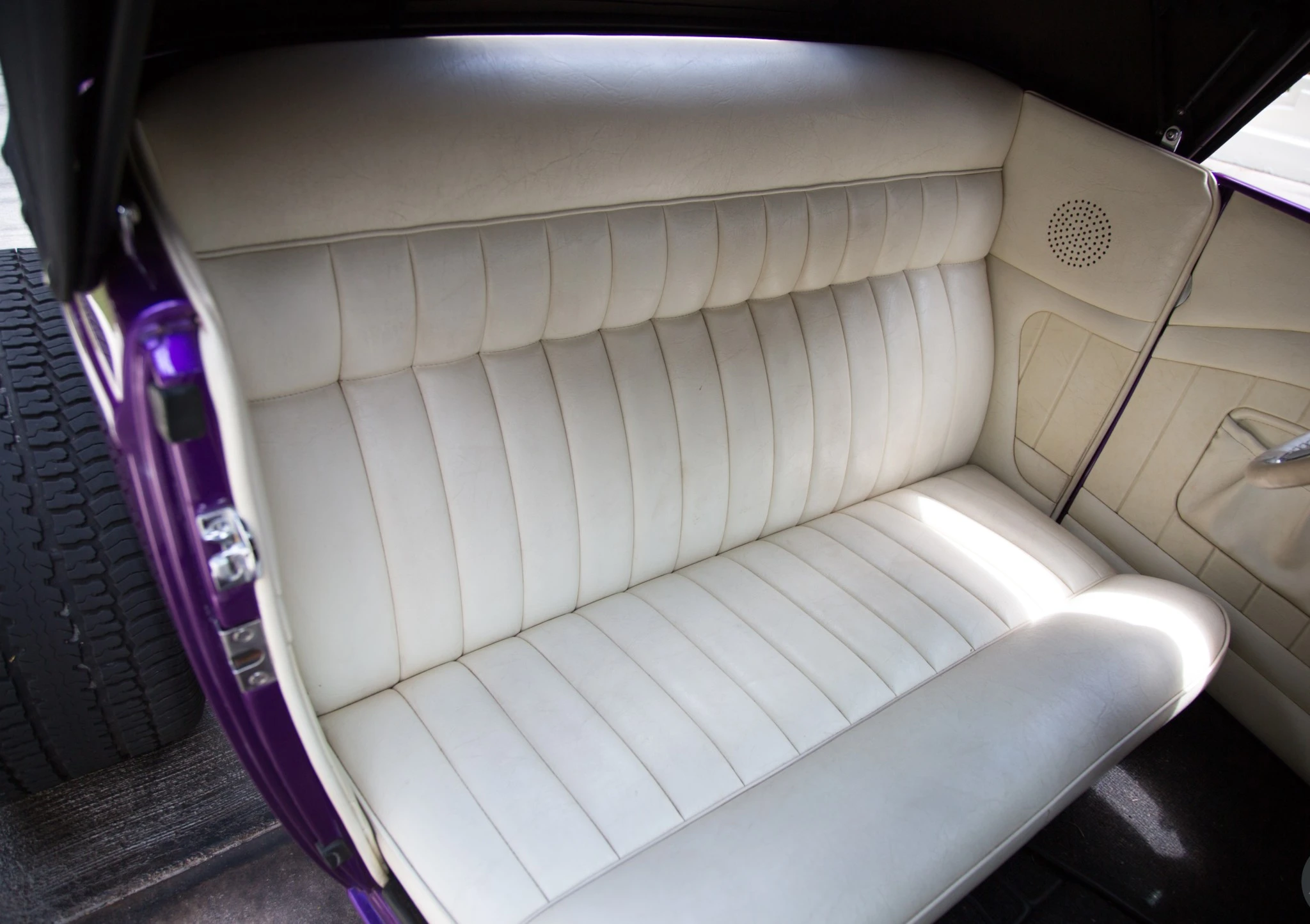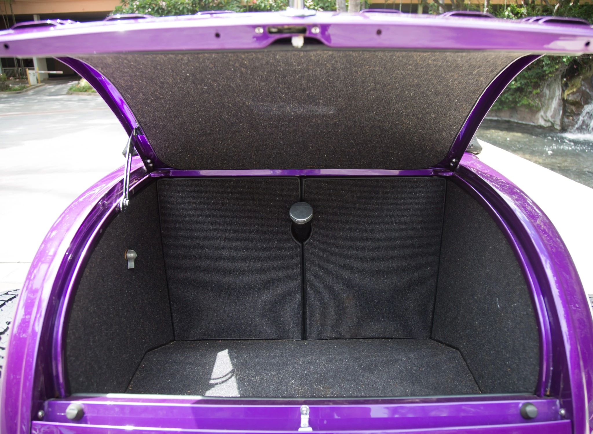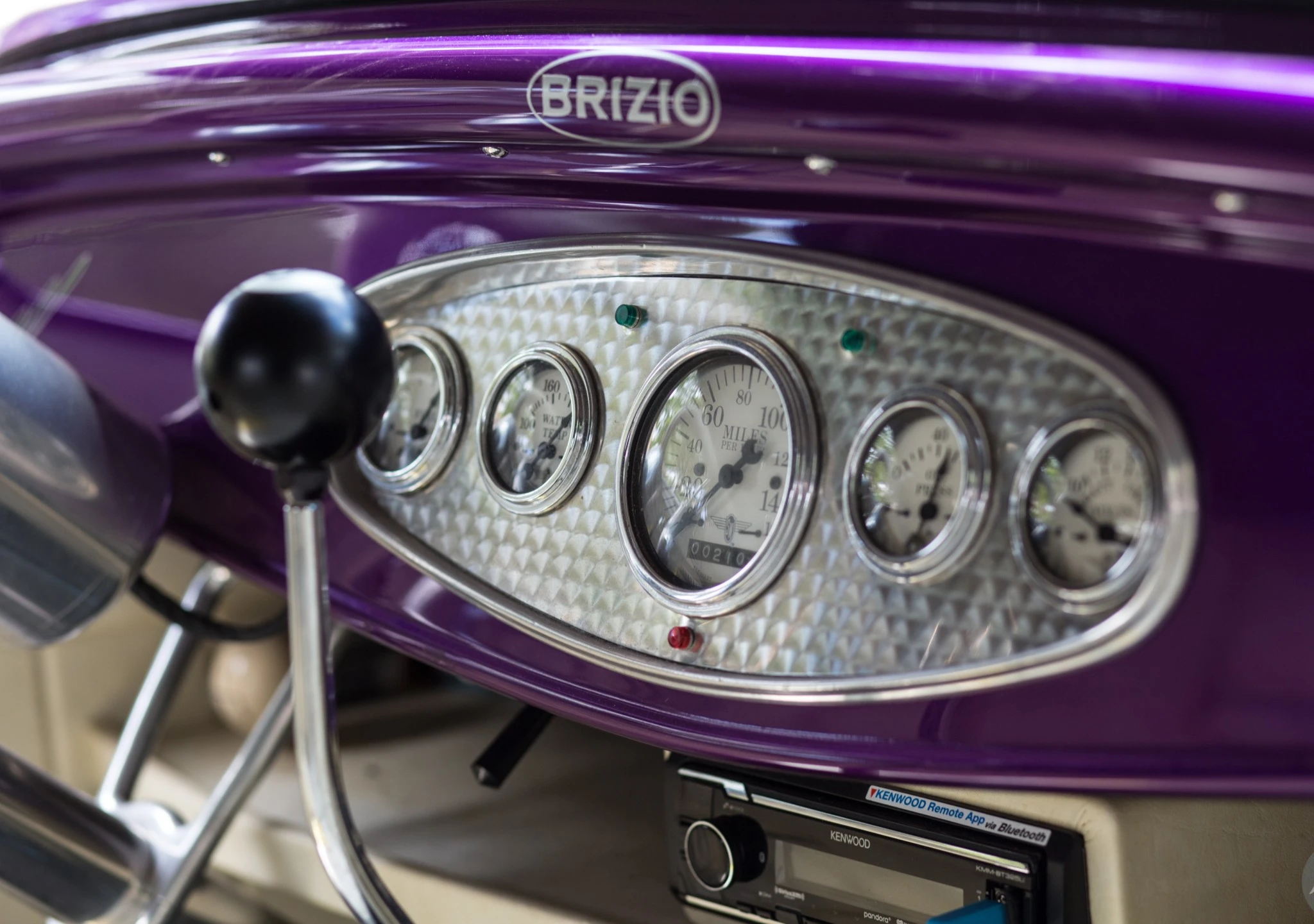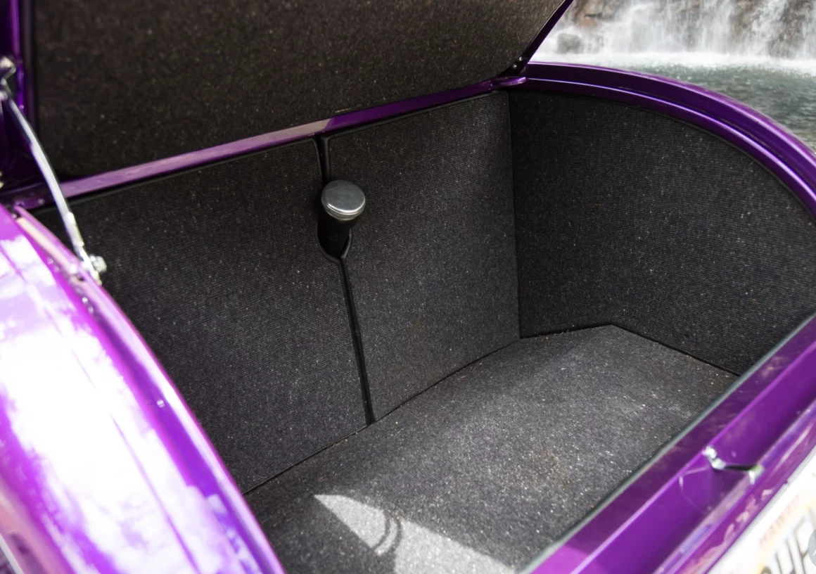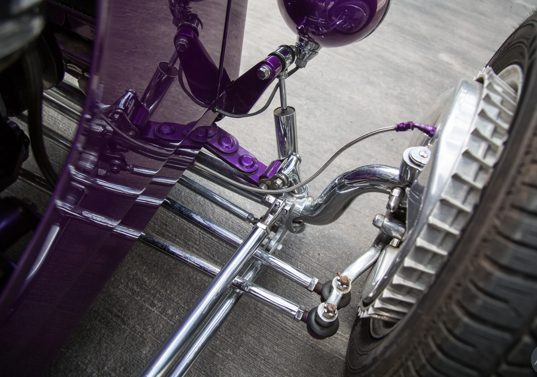 La voiture dispose d’un essieu avant surbaissé avec un ressort à lames transversal, et d’une suspension arrière à ressorts hélicoïdaux. Les freins à disques aux 4 roues sont équipés de lignes en acier inoxydable et les disques avant sont dissimulés dans des couvercles à ailettes en forme de tambour “à l’ancienne”… L’’intérieur en cuir crème et la capote noire sont l’œuvre de Sid Chavers. Une chaîne stéréo Kenwood avec Bluetooth est montée sous le tableau de bord.