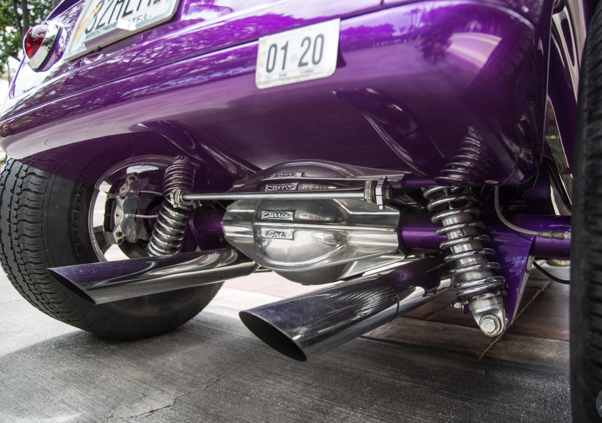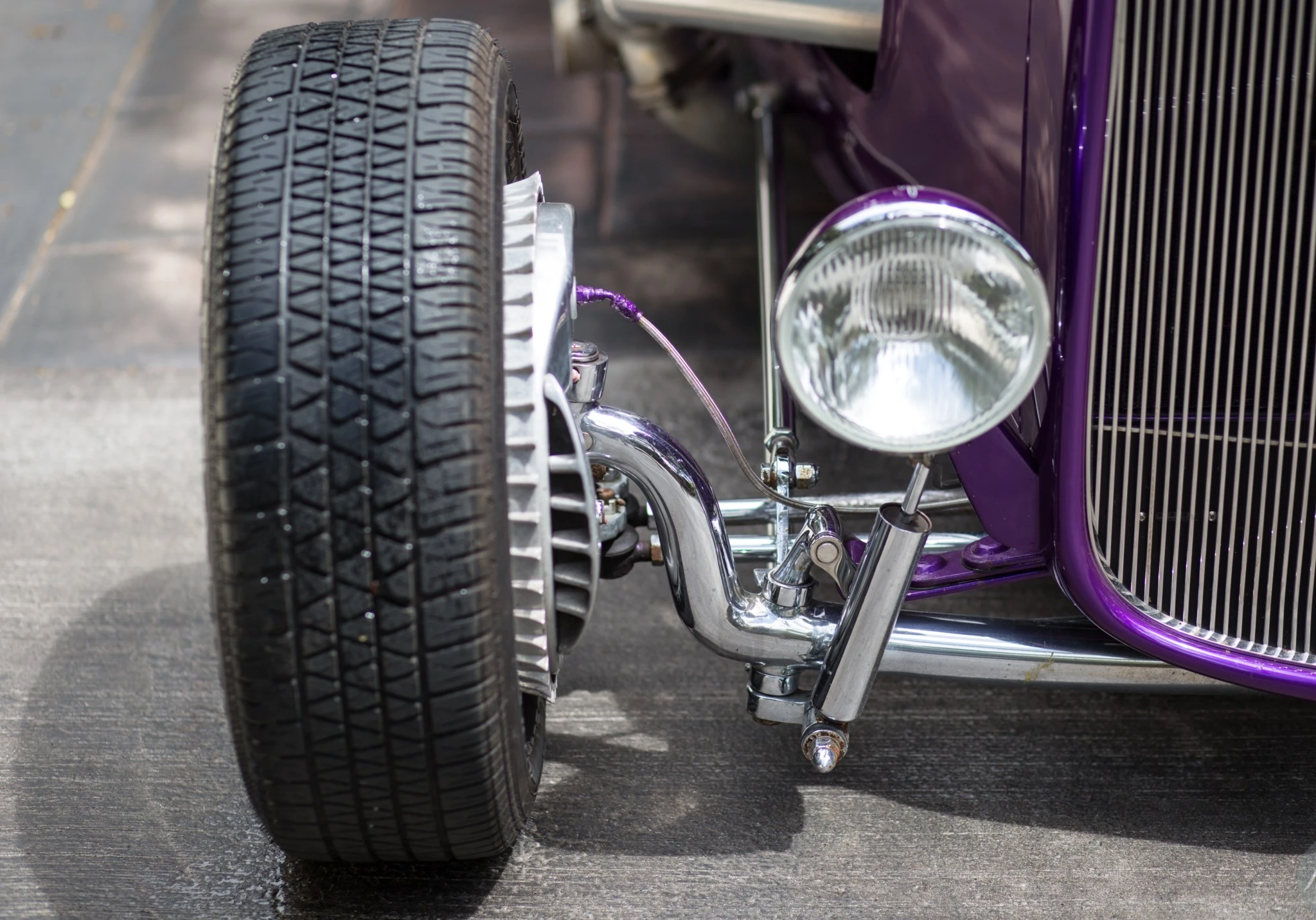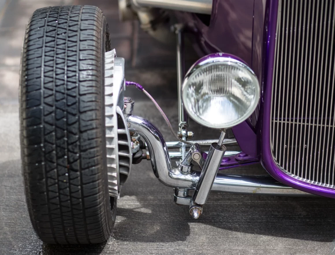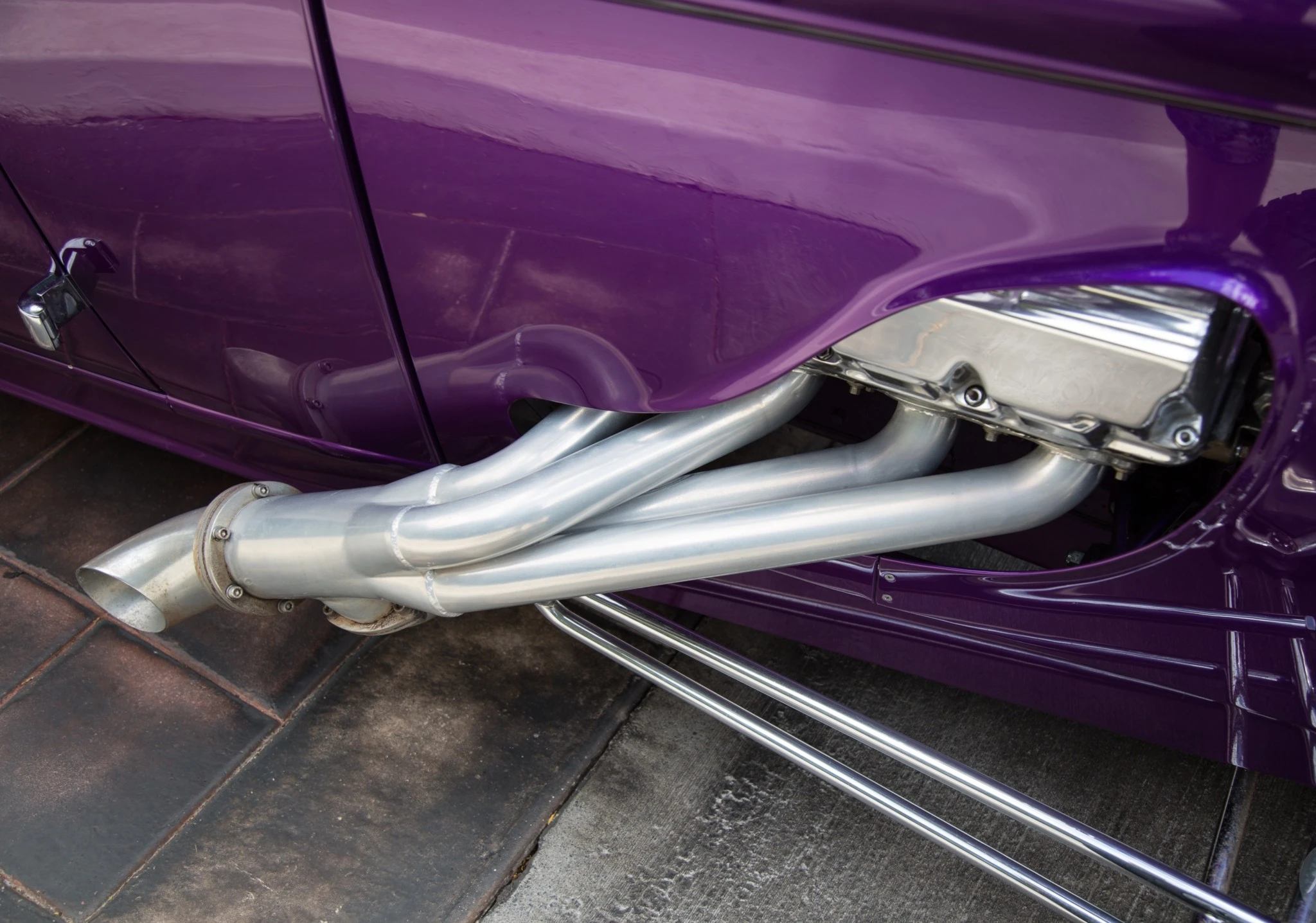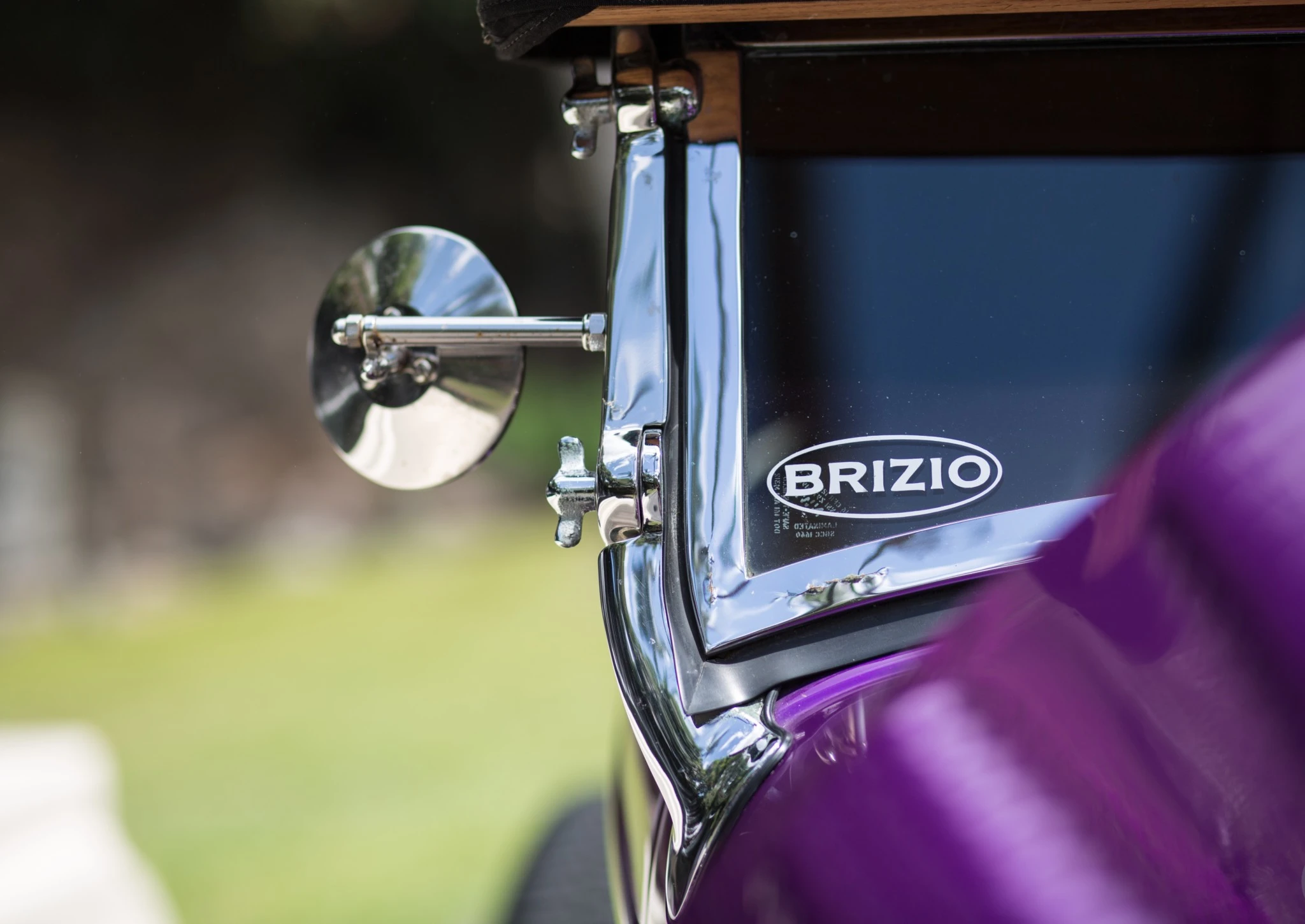 La voiture dispose d’un essieu avant surbaissé avec un ressort à lames transversal, et d’une suspension arrière à ressorts hélicoïdaux. Les freins à disques aux 4 roues sont équipés de lignes en acier inoxydable et les disques avant sont dissimulés dans des couvercles à ailettes en forme de tambour “à l’ancienne”… L’’intérieur en cuir crème et la capote noire sont l’œuvre de Sid Chavers. Une chaîne stéréo Kenwood avec Bluetooth est montée sous le tableau de bord.