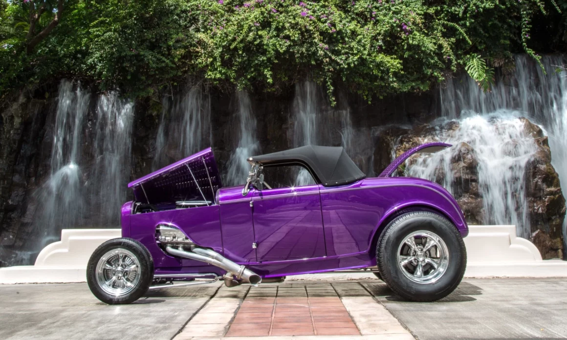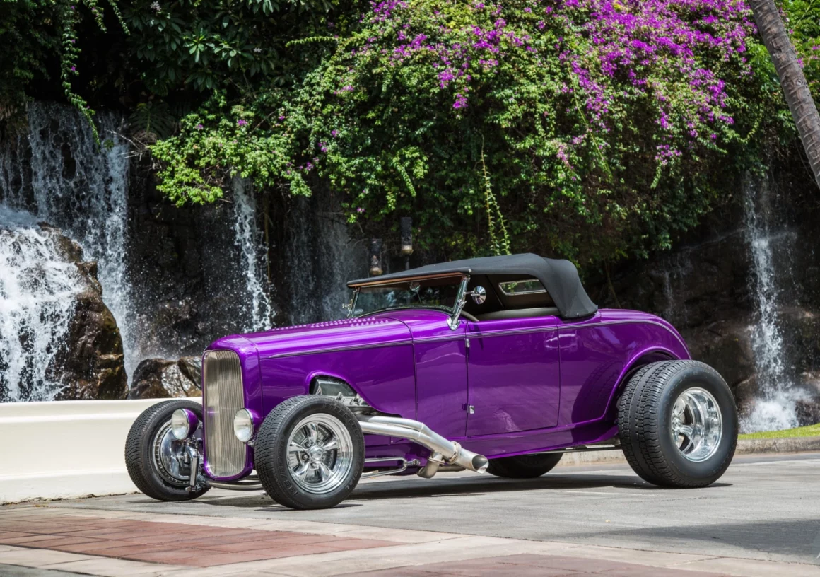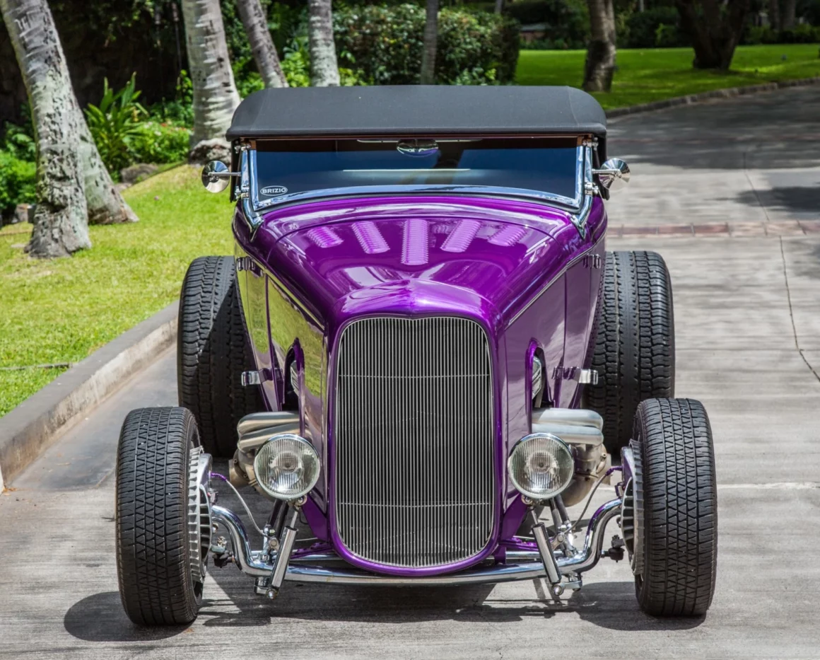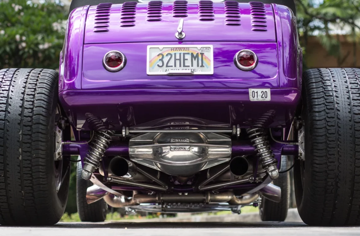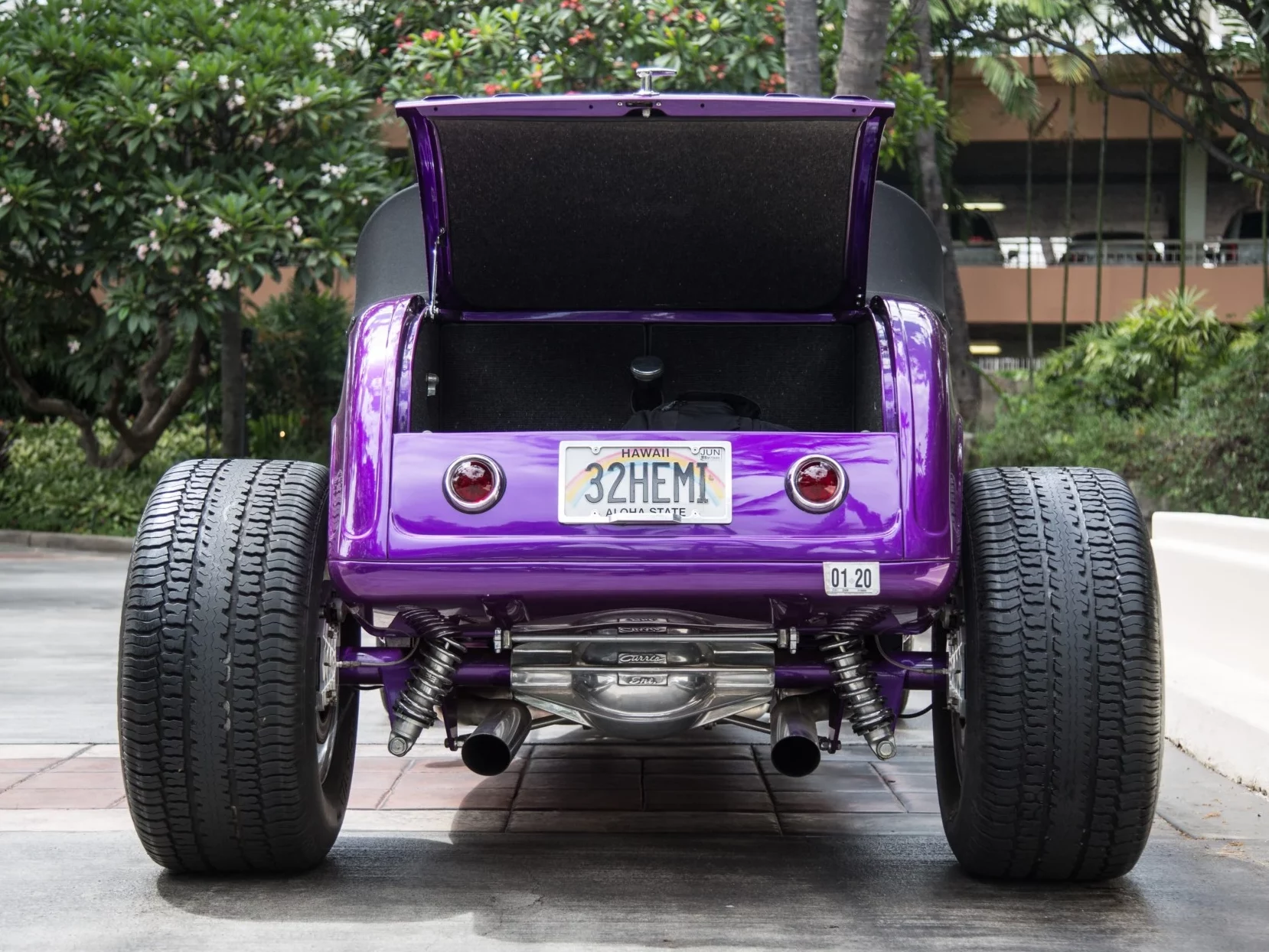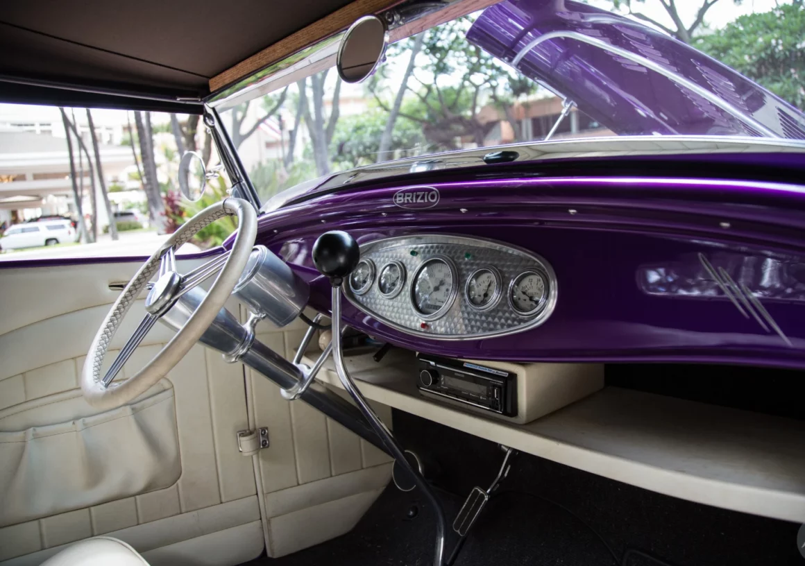 Ce Deuce Roadster dispose d’un titre de circulation Hawaïen, qui décrit ce Hot-Rod comme étant un Ford de 1932 reconstruit en 2001 par Roy Brizio Street Rods de South San Francisco, en Californie. Le capot et le couvercle du coffre ont été perçés de “louvers” et les panneaux latéraux du moteur comportent des découpes personnalisées pour laisser entrevoir le moteur et les tuyaux d’échappement. Les jantes American Racing sont des 15’avant et 17’arrière.
