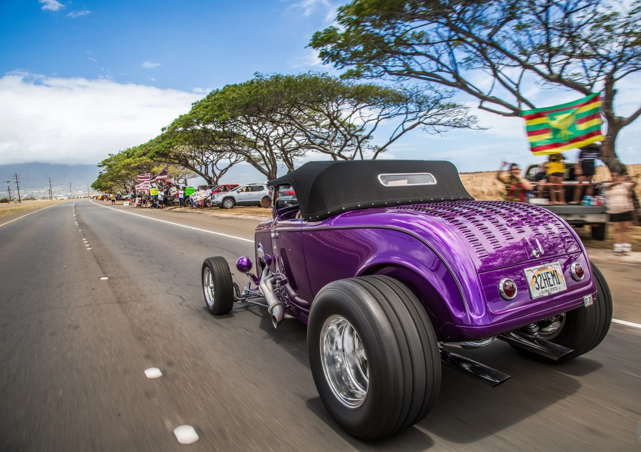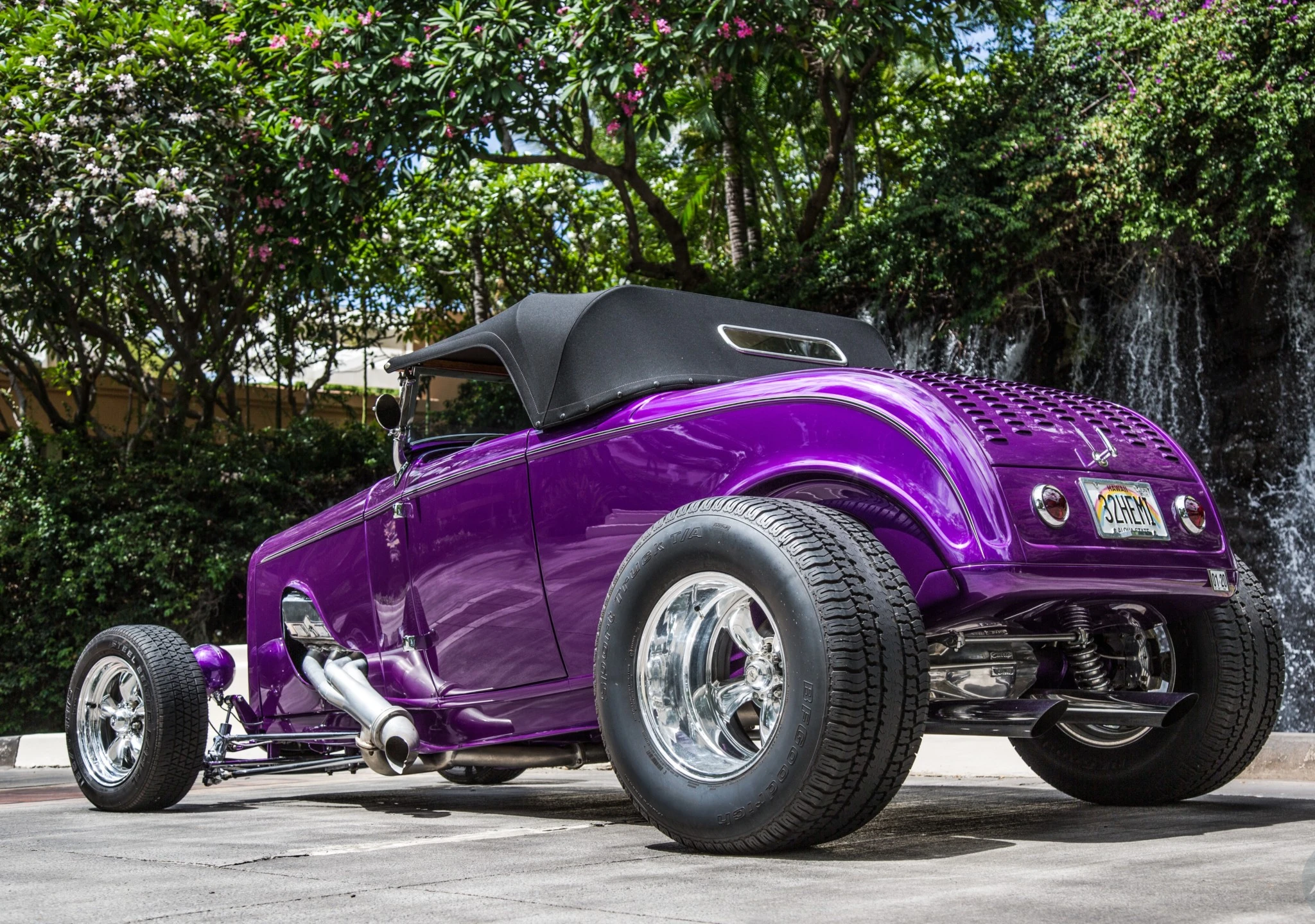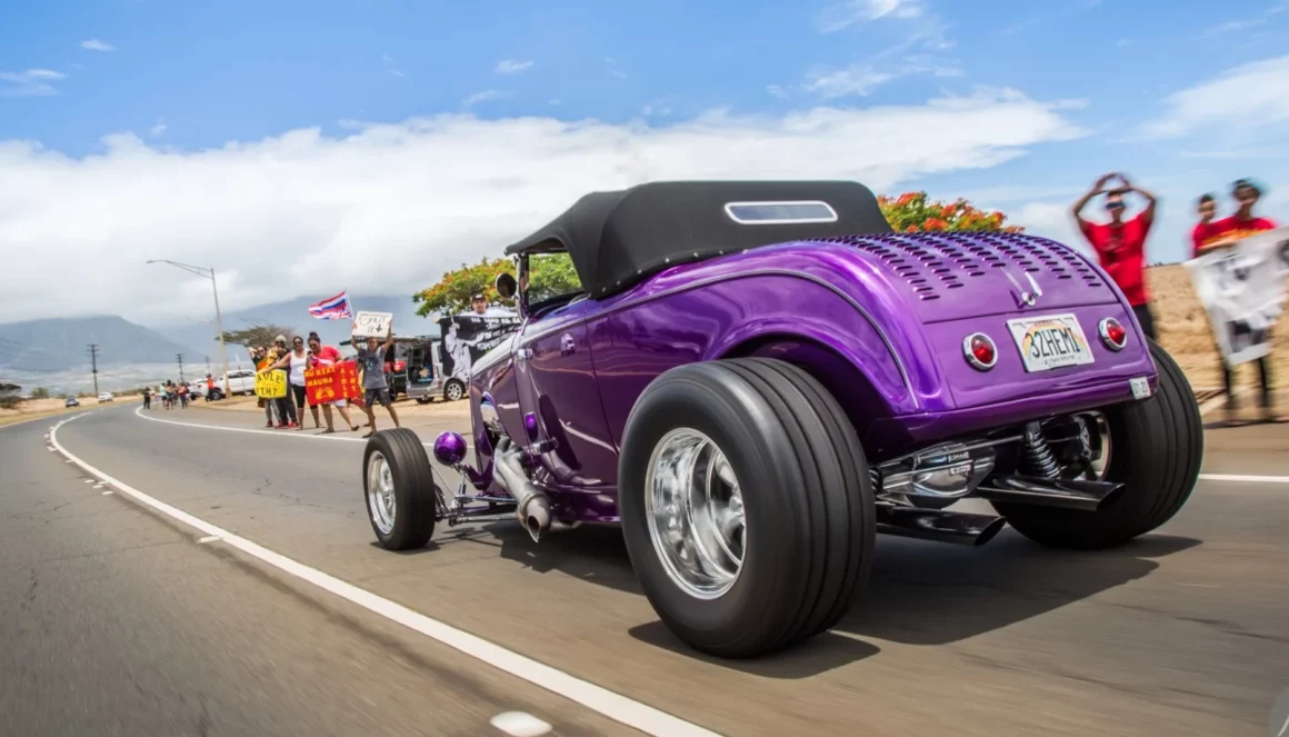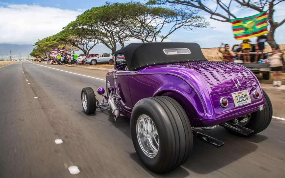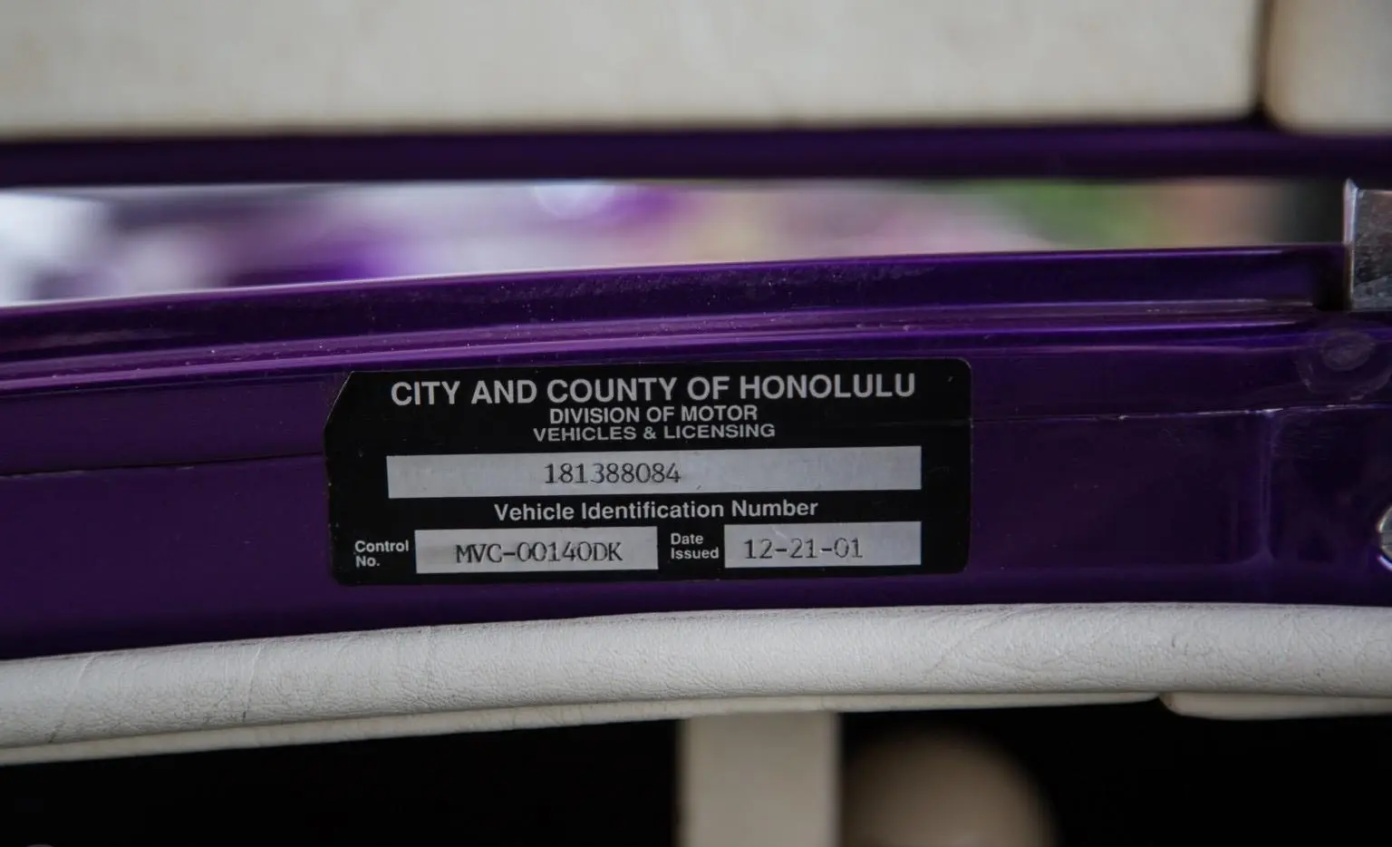 Ce Deuce Roadster dispose d’un titre de circulation Hawaïen, qui décrit ce Hot-Rod comme étant un Ford de 1932 reconstruit en 2001 par Roy Brizio Street Rods de South San Francisco, en Californie. Le capot et le couvercle du coffre ont été perçés de “louvers” et les panneaux latéraux du moteur comportent des découpes personnalisées pour laisser entrevoir le moteur et les tuyaux d’échappement. Les jantes American Racing sont des 15’avant et 17’arrière.