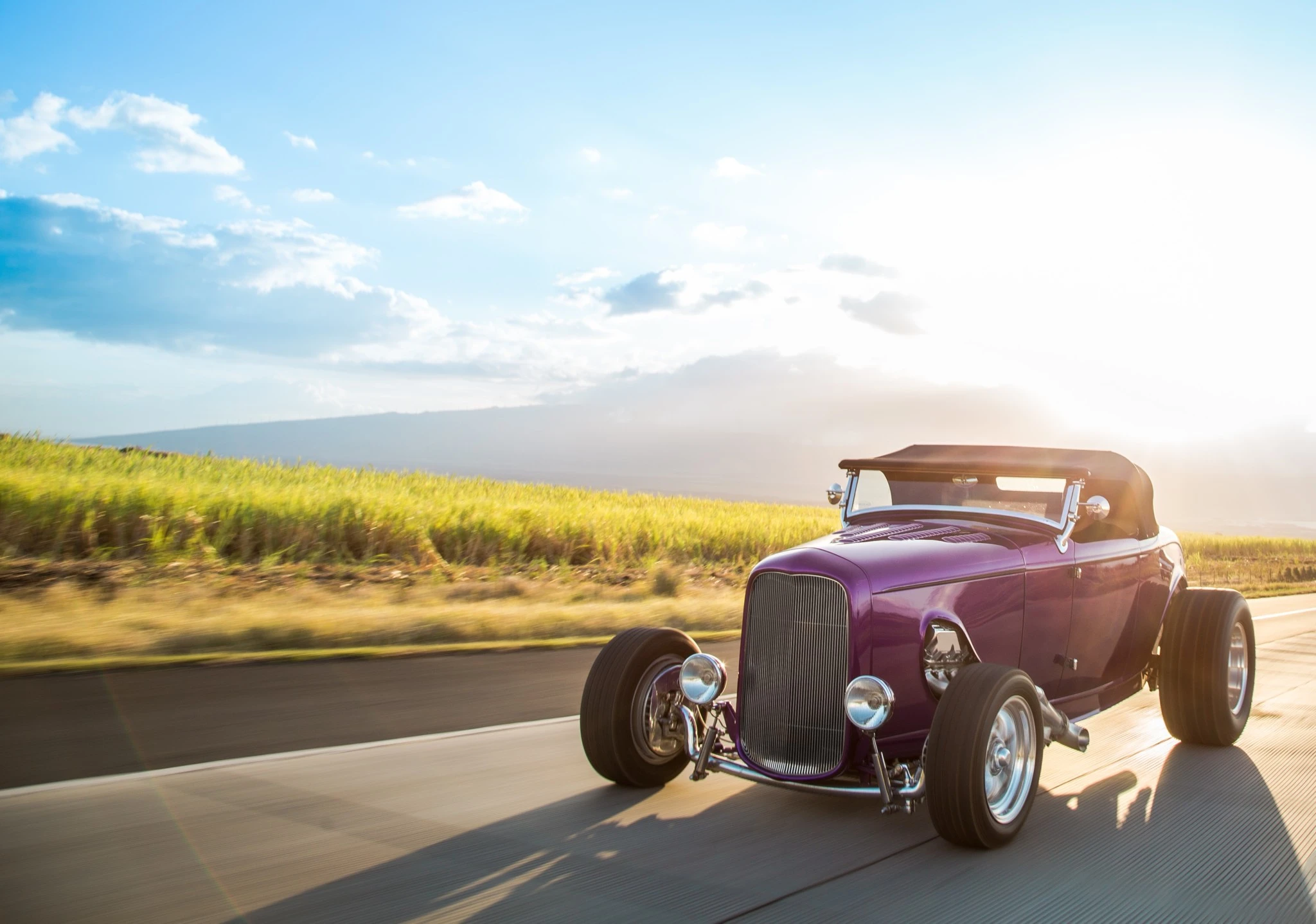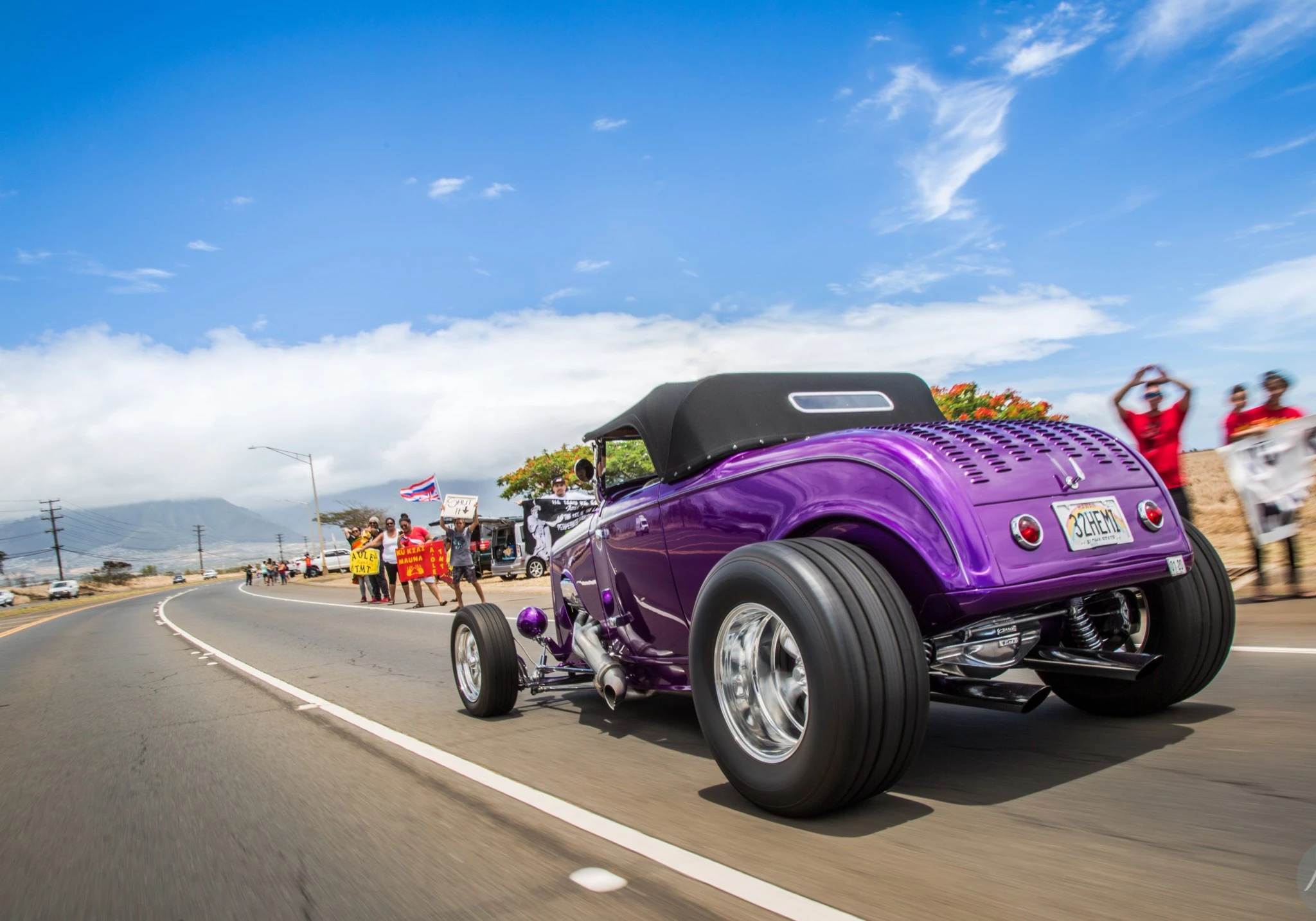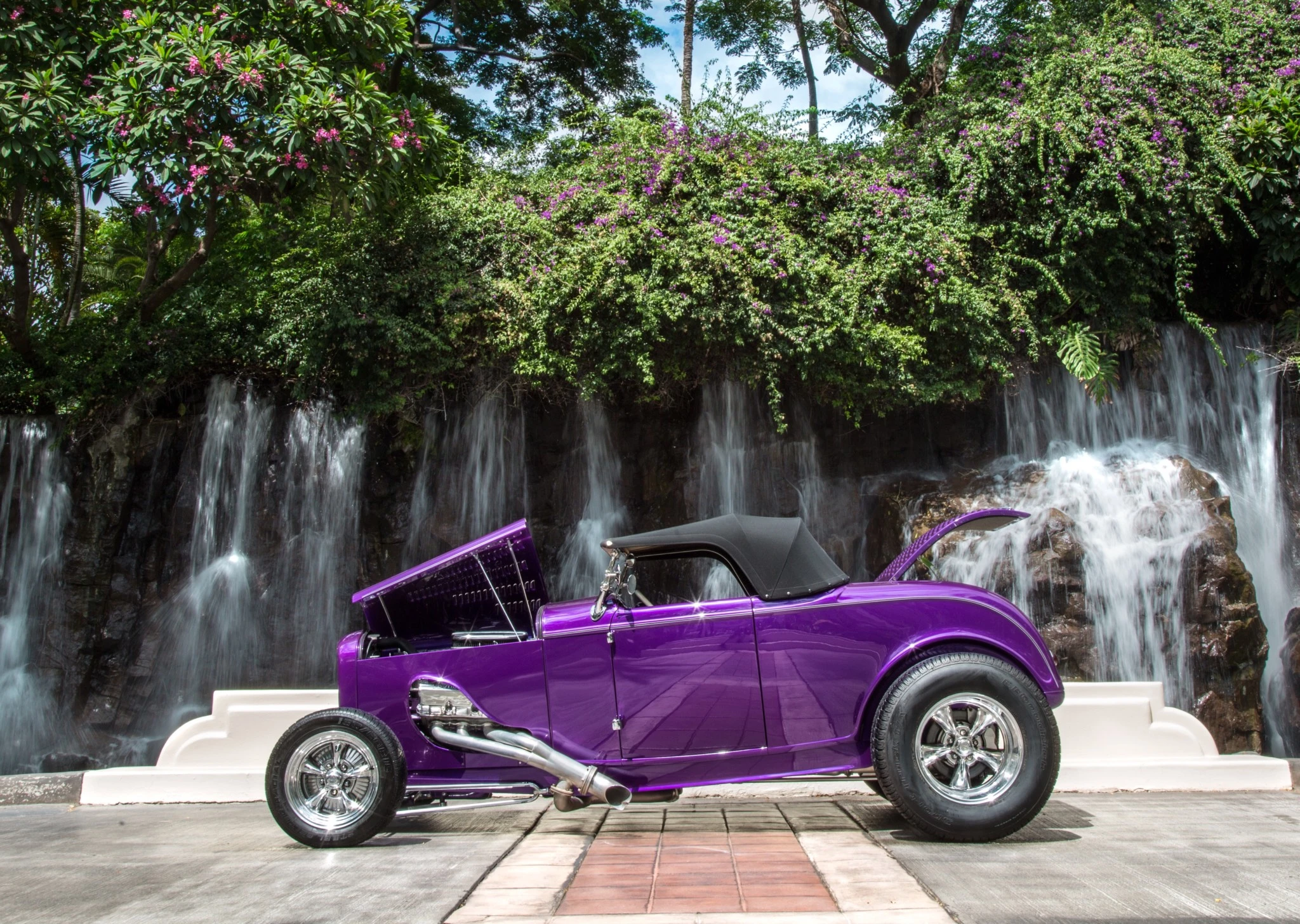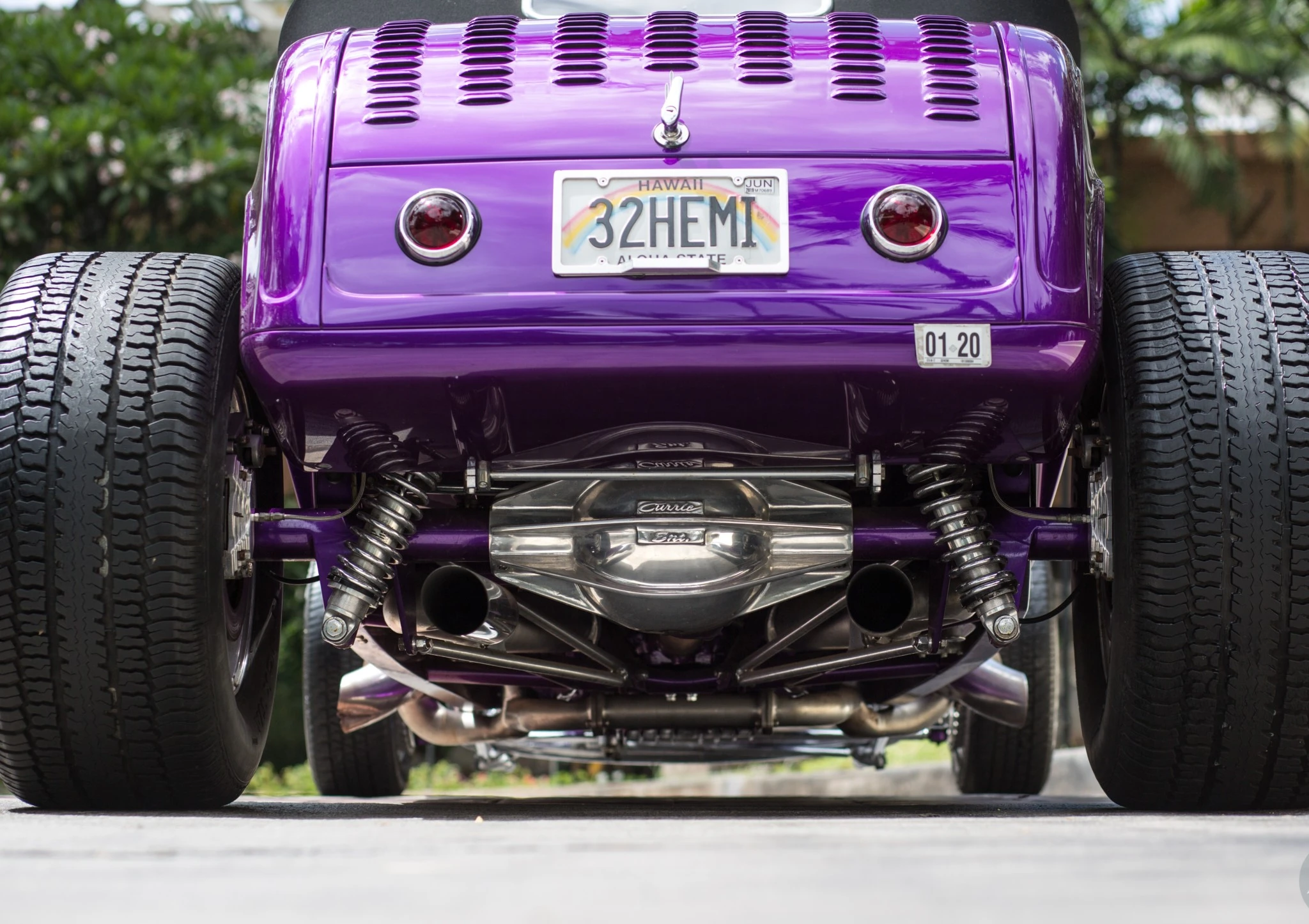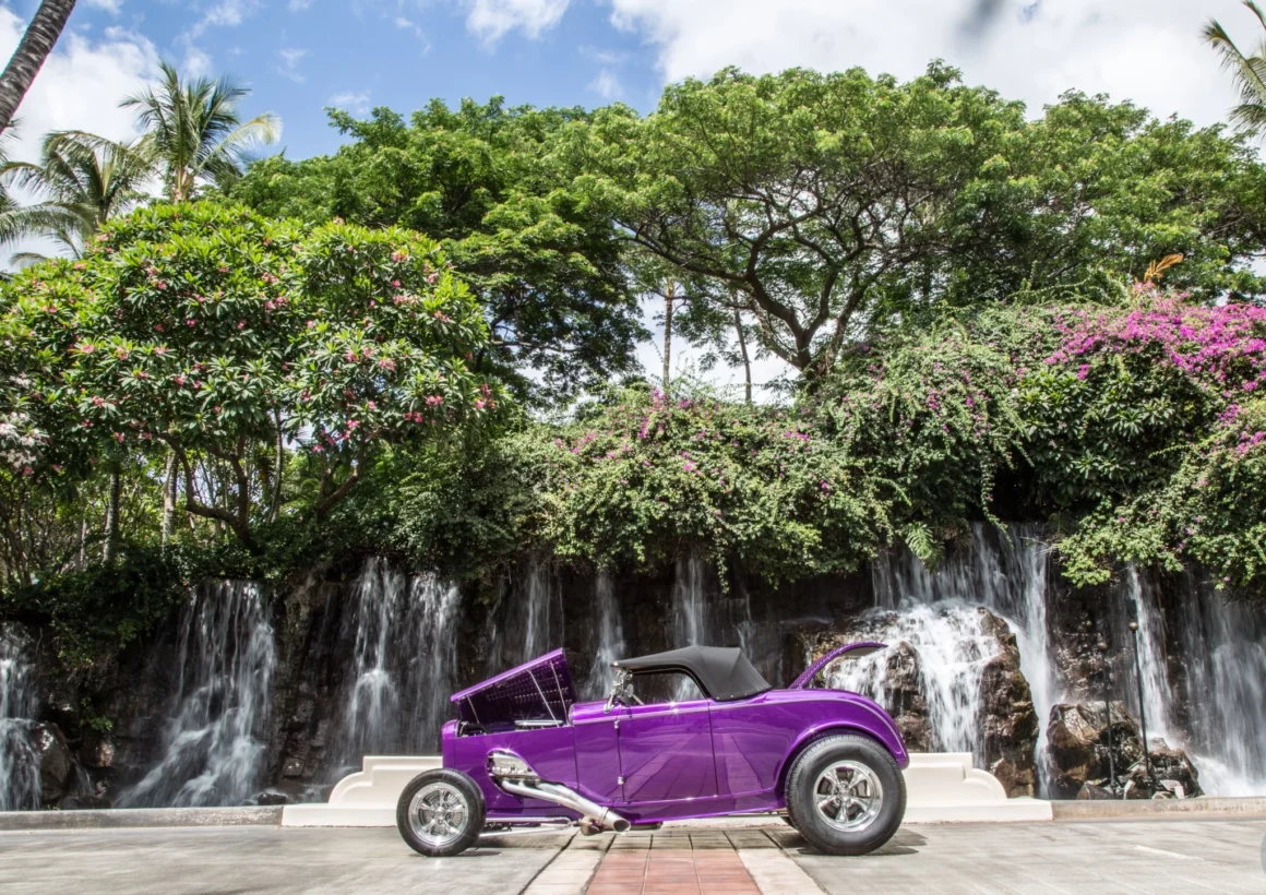 Ce Deuce Roadster dispose d’un titre de circulation Hawaïen, qui décrit ce Hot-Rod comme étant un Ford de 1932 reconstruit en 2001 par Roy Brizio Street Rods de South San Francisco, en Californie. Le capot et le couvercle du coffre ont été perçés de “louvers” et les panneaux latéraux du moteur comportent des découpes personnalisées pour laisser entrevoir le moteur et les tuyaux d’échappement. Les jantes American Racing sont des 15’avant et 17’arrière.