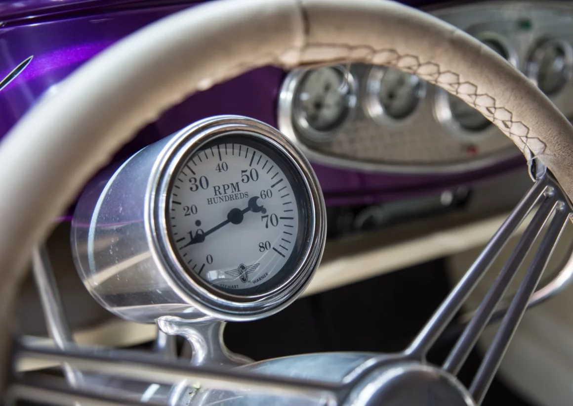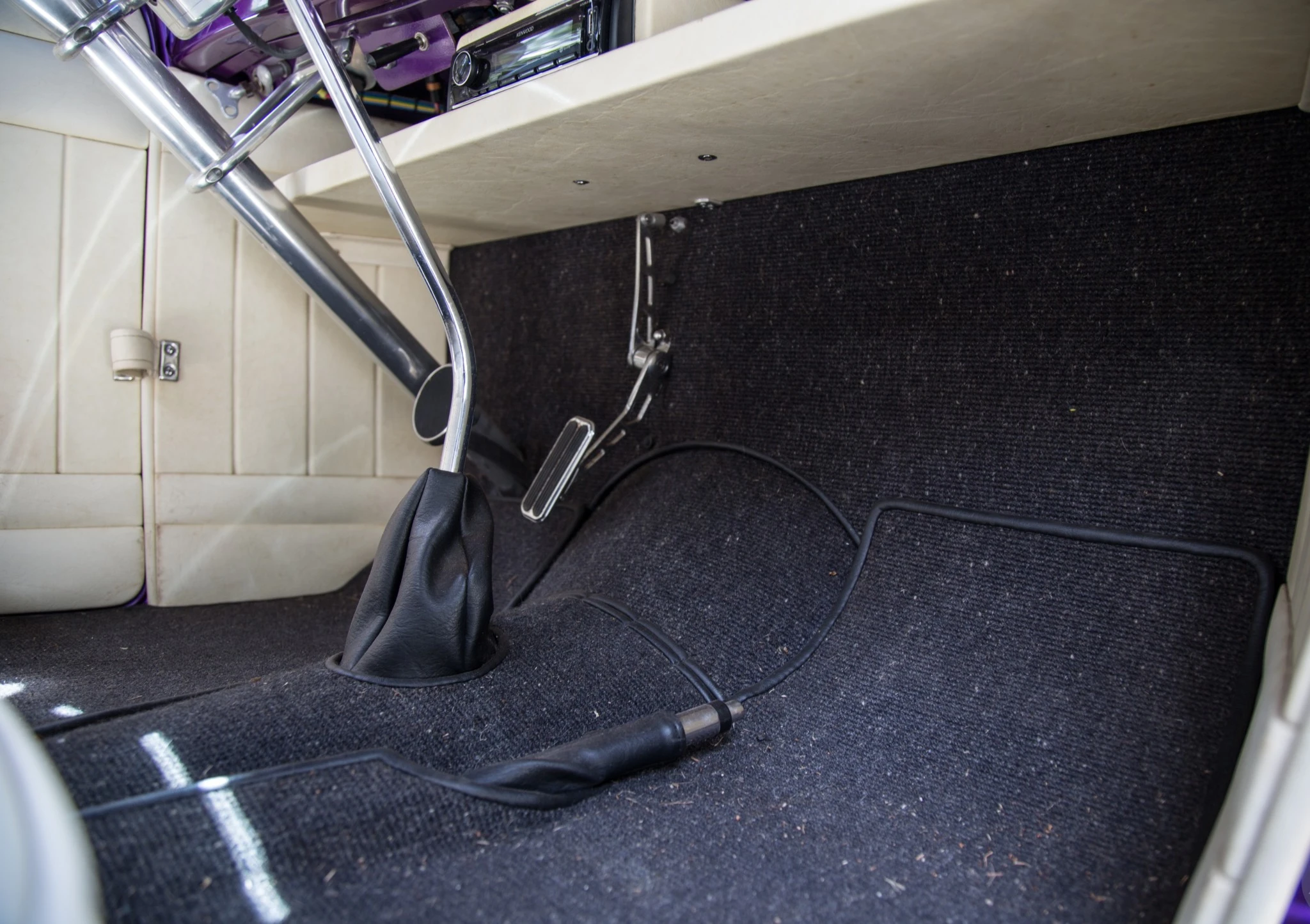 La cabine dispose également de tapis noirs. Il est à noter que ainsi les freins sont assistés électriquement. Le tableau de bord abrite des compteurs Stewart Warner (indicateurs de : niveau de carburant, température de l’eau, manomètre d’huile et voltmètreun ainsi qu’un compteur de vitesse à 160 mph, le tachymètre Stewart Warner 8 k/min est monté sur la colonne de direction.