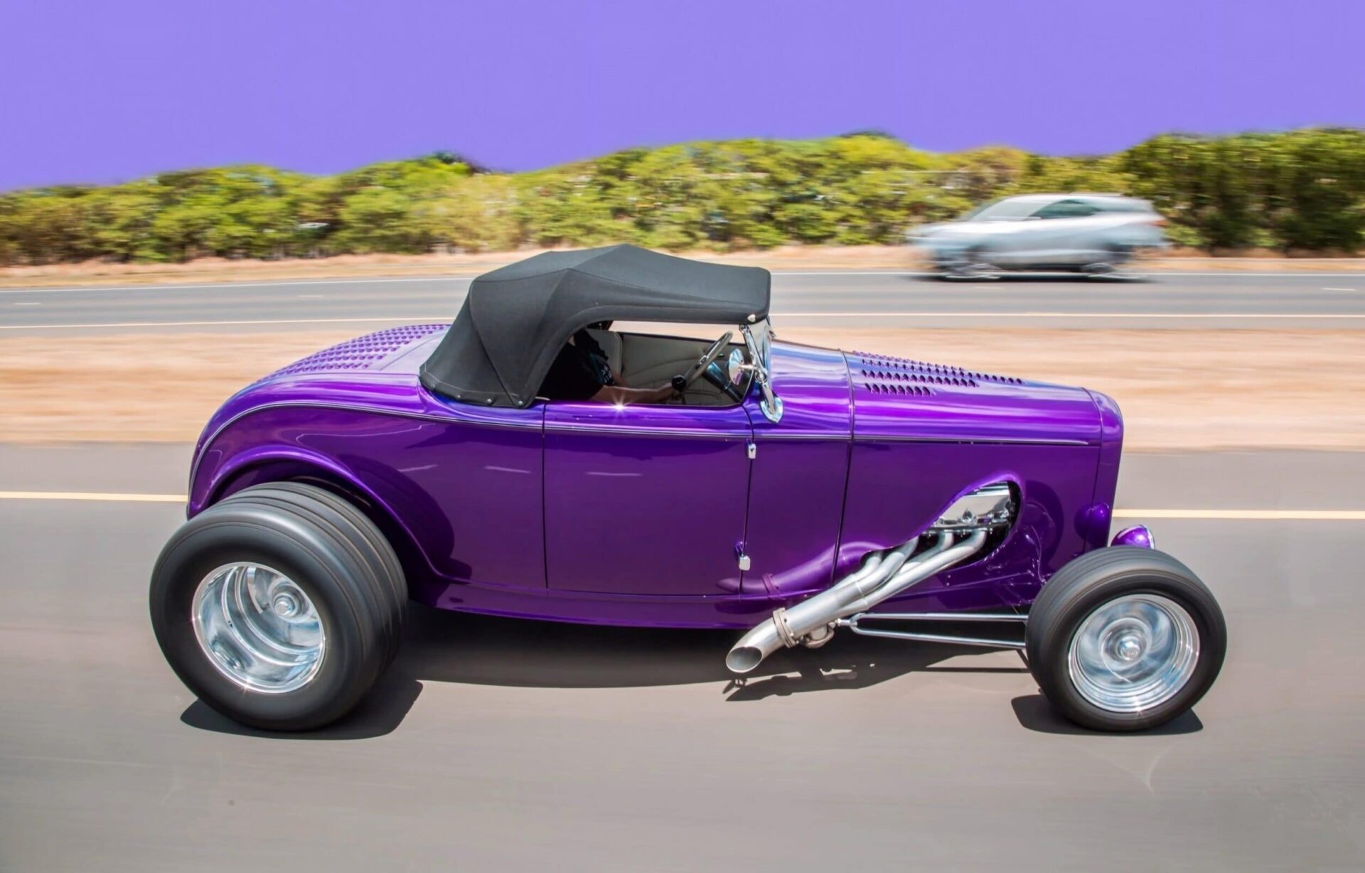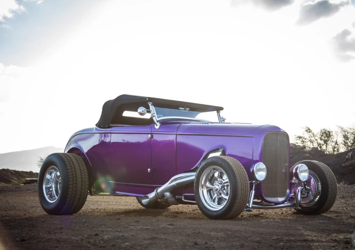 Ce Hot-Rod Ford’32 Roadster a été construit par Roy Brizio Street Rods en 2001. La voiture dispose d’une carrosserie en acier avec un châssis renforcé. La puissance est fournie par un Keith Black 572ci Hemi V8, jumelé à une transmission automatique 727 à trois vitesses et à un pont arrière Currie aluminium. La capote noire et l’intérieur en cuir personnalisé ont été installés par Sid Chavers Co. de Santa Clara, en Californie.
