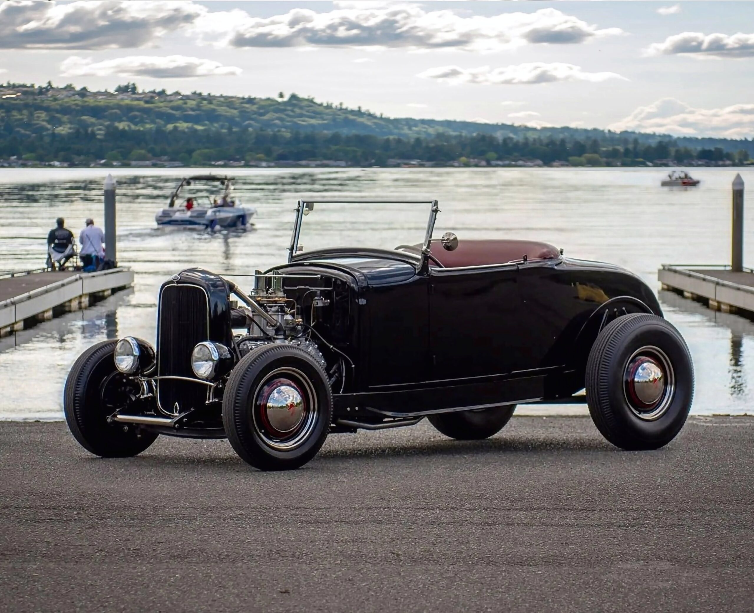 Histoire de verser complètement dans le stéréotype, le décor d’un vrai lac poissonneux en lieu et place d’un lac asséché, est plus propice pour un week-end de baises glamoureuses torrides. Voilà ! Faut-il aussi être décidé de faire l’impasse sur l’existant politique aux Etats-Unis et ailleurs… Le Hi-Boy Roadster est là, en attente sur le mini-port du lac… Look Old-School, style Old-Fashion, muscles cachés, un bon vieux V8 Flathead et pas de capot ni de garde-boues .