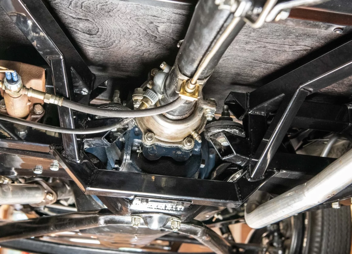 Le tableau de bord est composé d’un compteur de vitesse de 160 mph, d’un tachymètre et de lectures pour la pression d’huile, la température du liquide de refroidissement, l’ampérage et le niveau de carburant. L’odomètre à cinq chiffres indique 3 400 milles, Le V8 Flathead est bourré de pièces Edelbrock. Le collecteur d’admission est un Thickstun, les deux carburateurs sont des Stromberg 97 et les collecteurs sont des “Red”… Voilà, c’est fini…