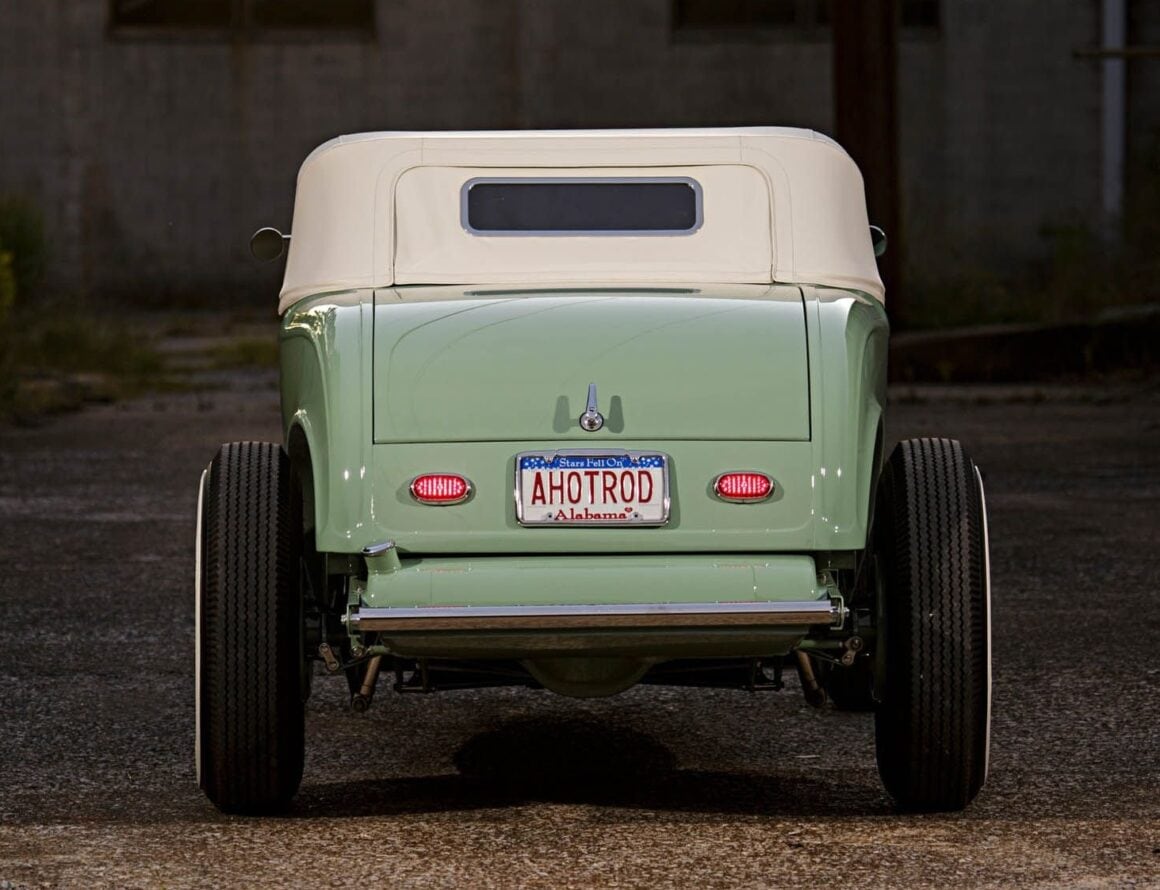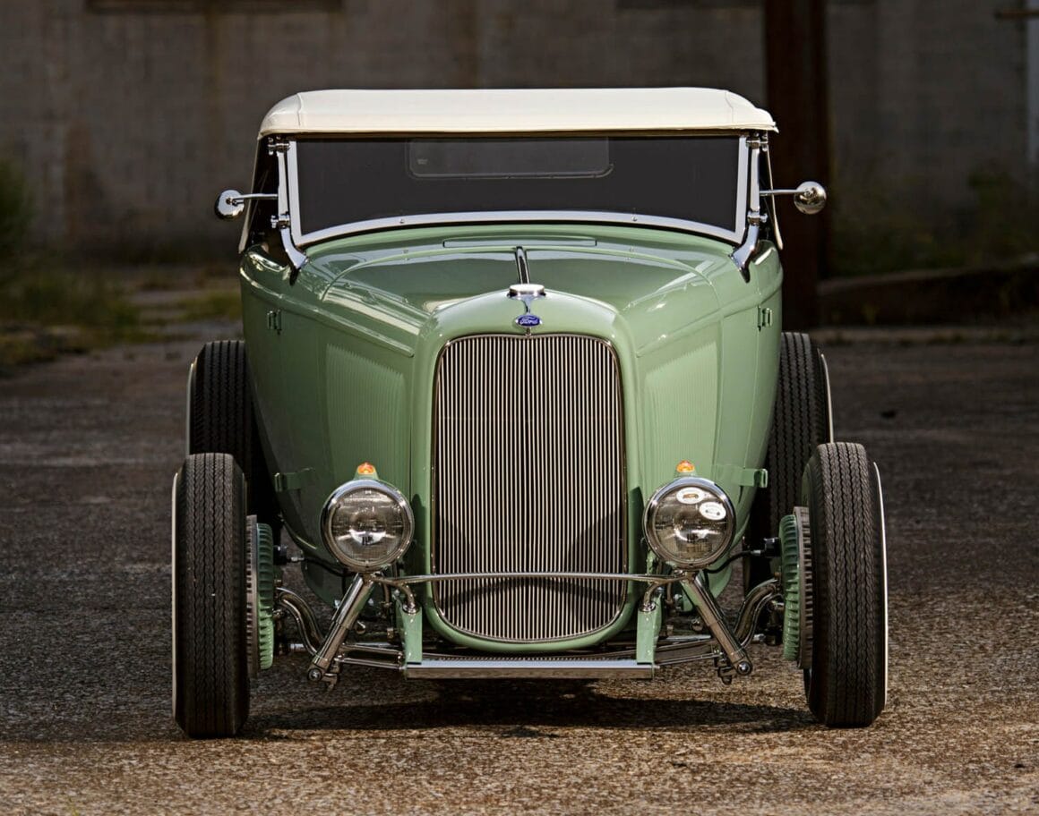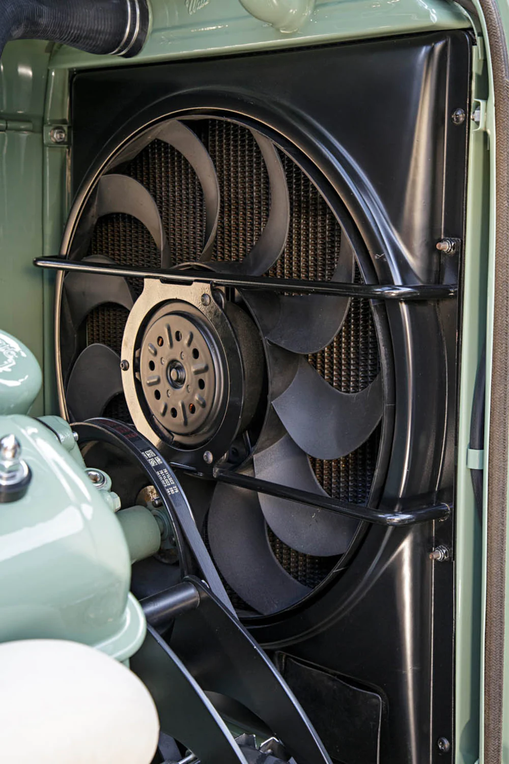 -Elles se sont limitées aux ajustements et à la finition ! Wesley Johnson et Greg Chalcraft de W-J Body Shop ont peint le Rod en PPG Willow Green, une couleur que les personnes plus âgées pourraient trouver rappelant le dentifrice Ipana. Le capot est un Rootlieb de 5cm de plus que la longueur stock avec une calandre Brookville. L’éclairage avant est constitué de phares de chez “Style-Guide”, et les feux arrière sont ceux d’une Ford 1942.
