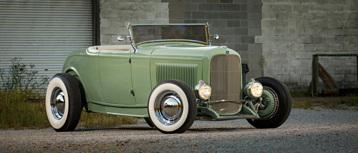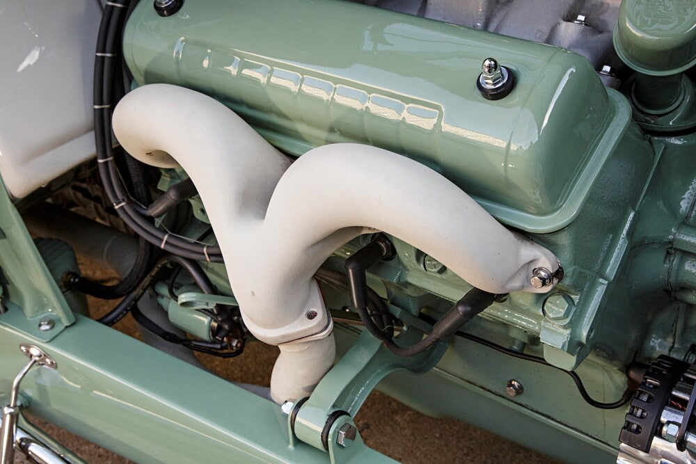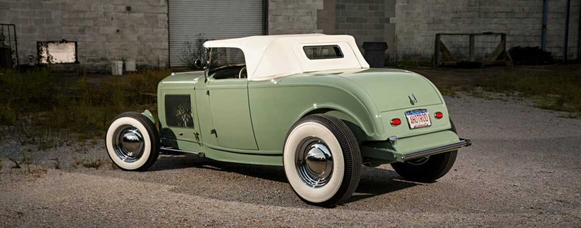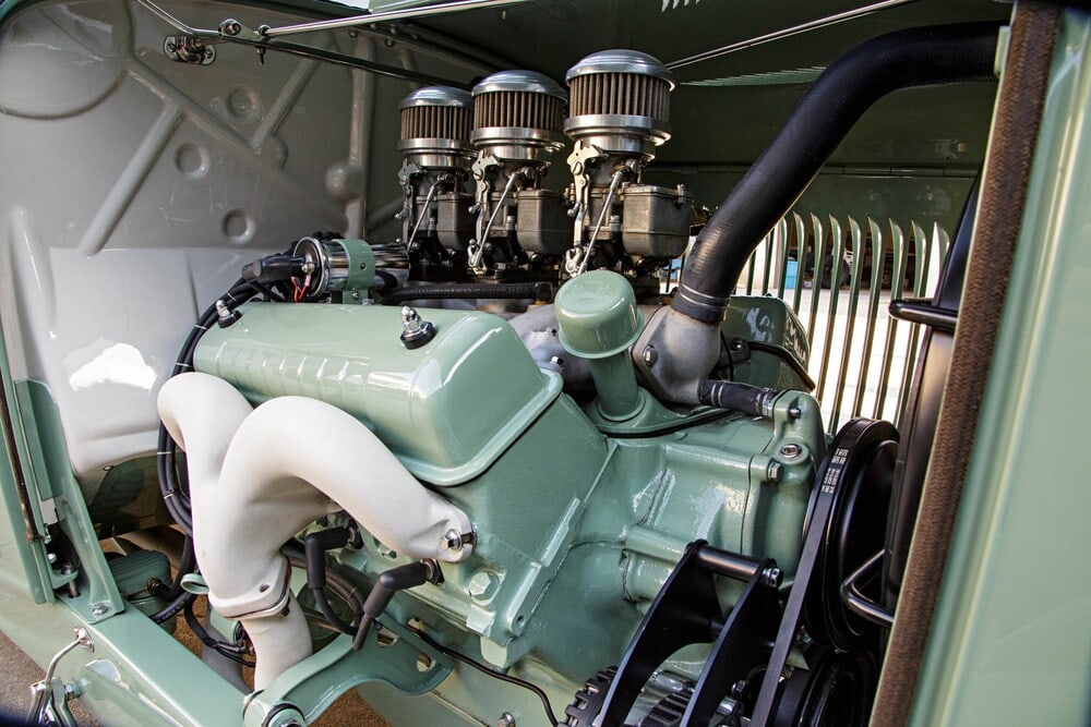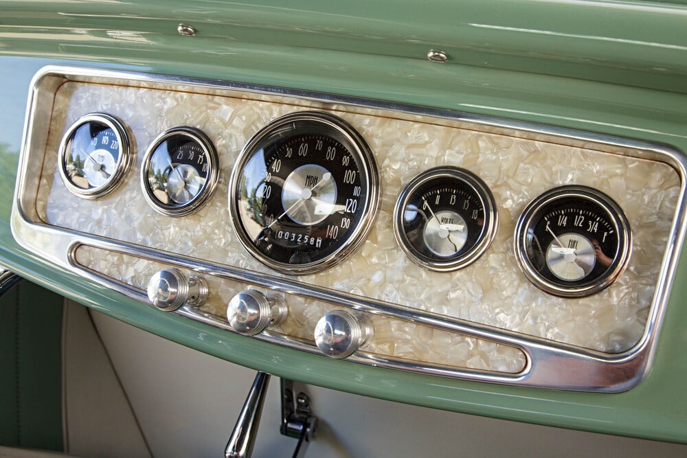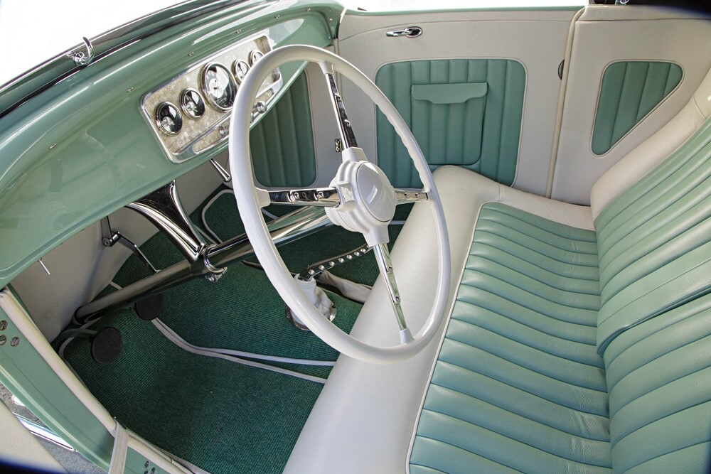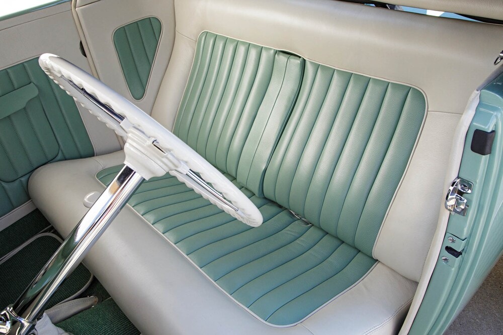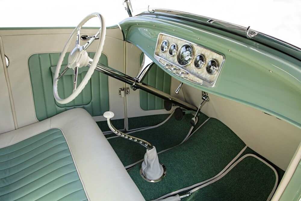 -Un arceau de sécurité caché à six points entoure l’intérieur plissé vertical en cuir vert et crème cousu par la tondeuse interne de Johnson-Hot-Rod-Shop, Maria Garcia, une super sexy avec qui j’ai passé des moments inoubliables ! La moquette verte à tissage carré recouvre le sol et aide à retenir la chaleur. Il y a aussi l’air-co Vintage-Air. Le tableau de bord est en aluminium Lokar-Goolsby de style Auburn avec inserts en nacre. La capote hachée vient de chez Rod-Tops d’Ellsworth, dans le Michigan.