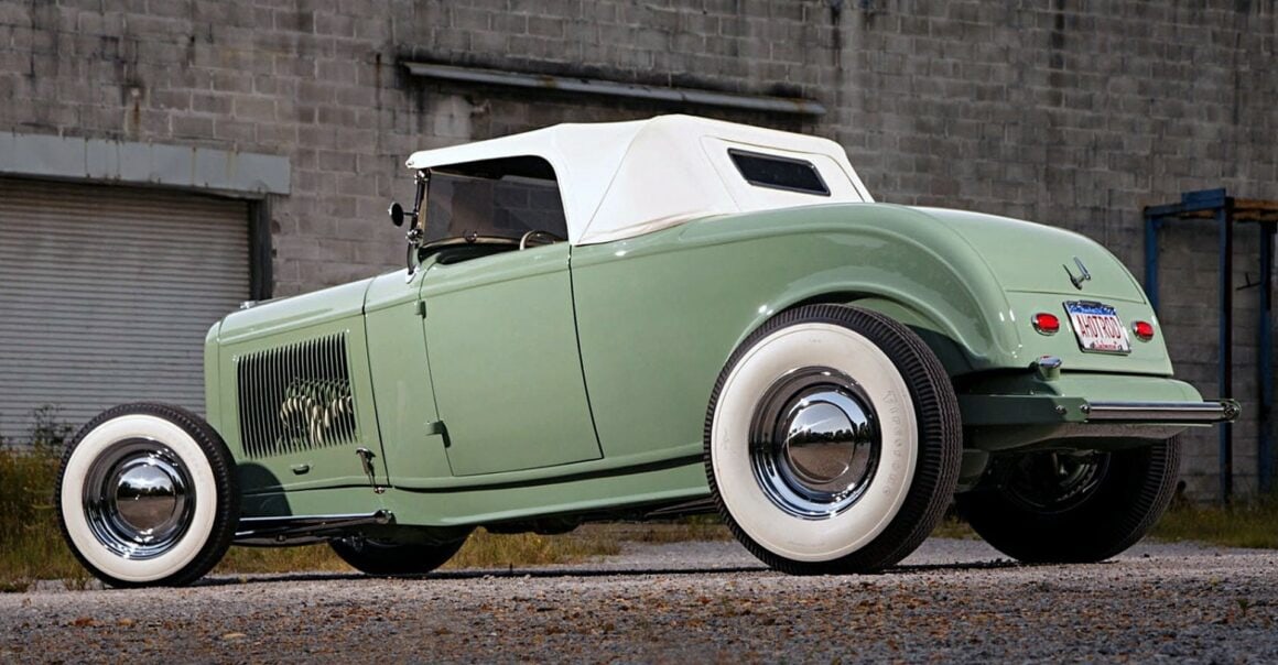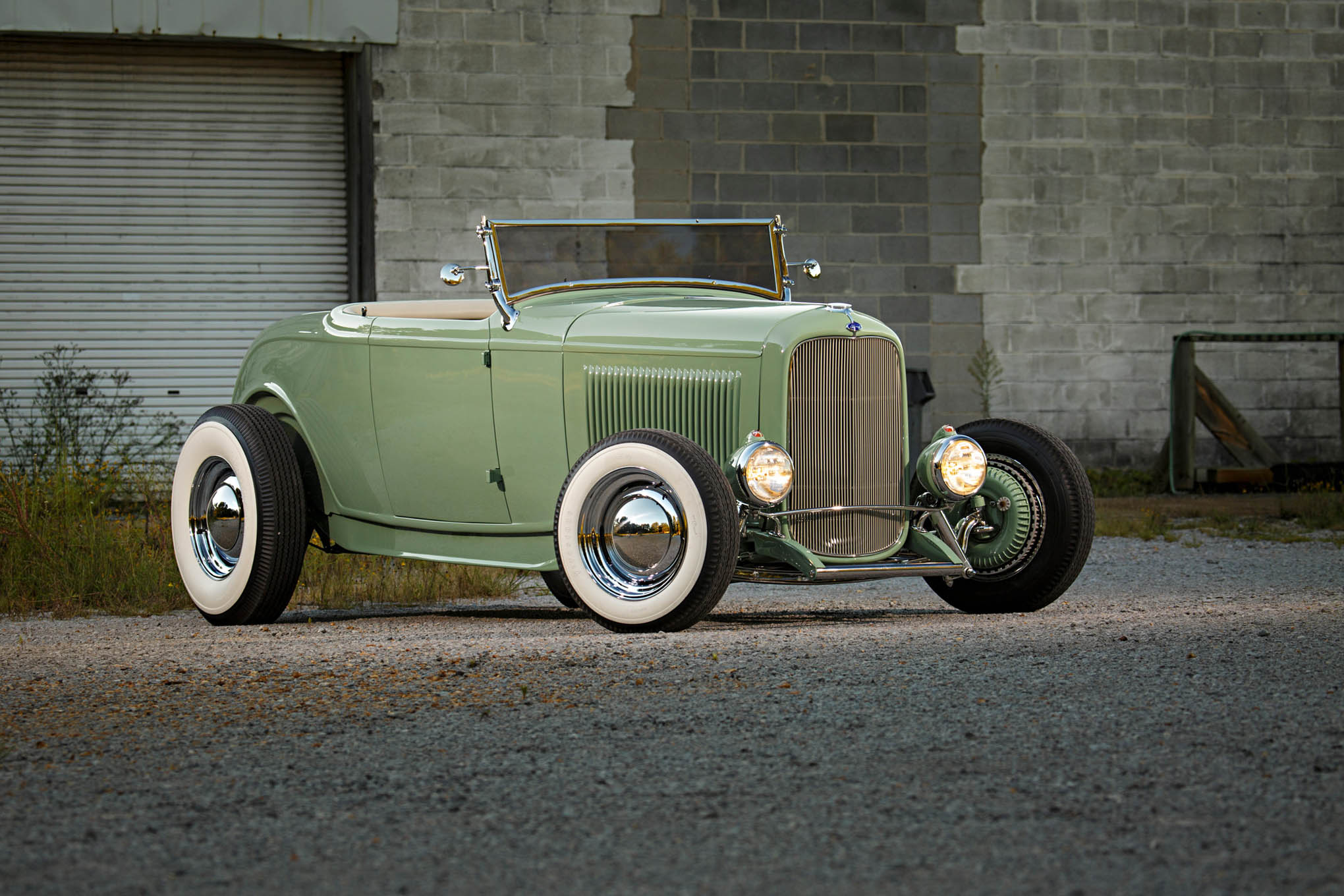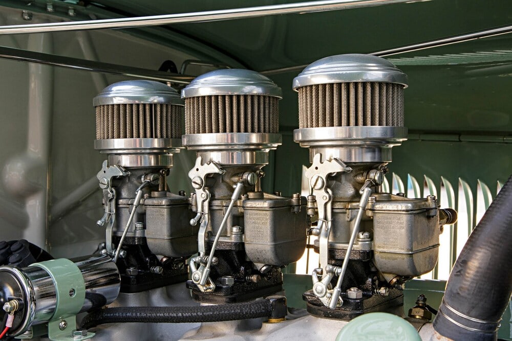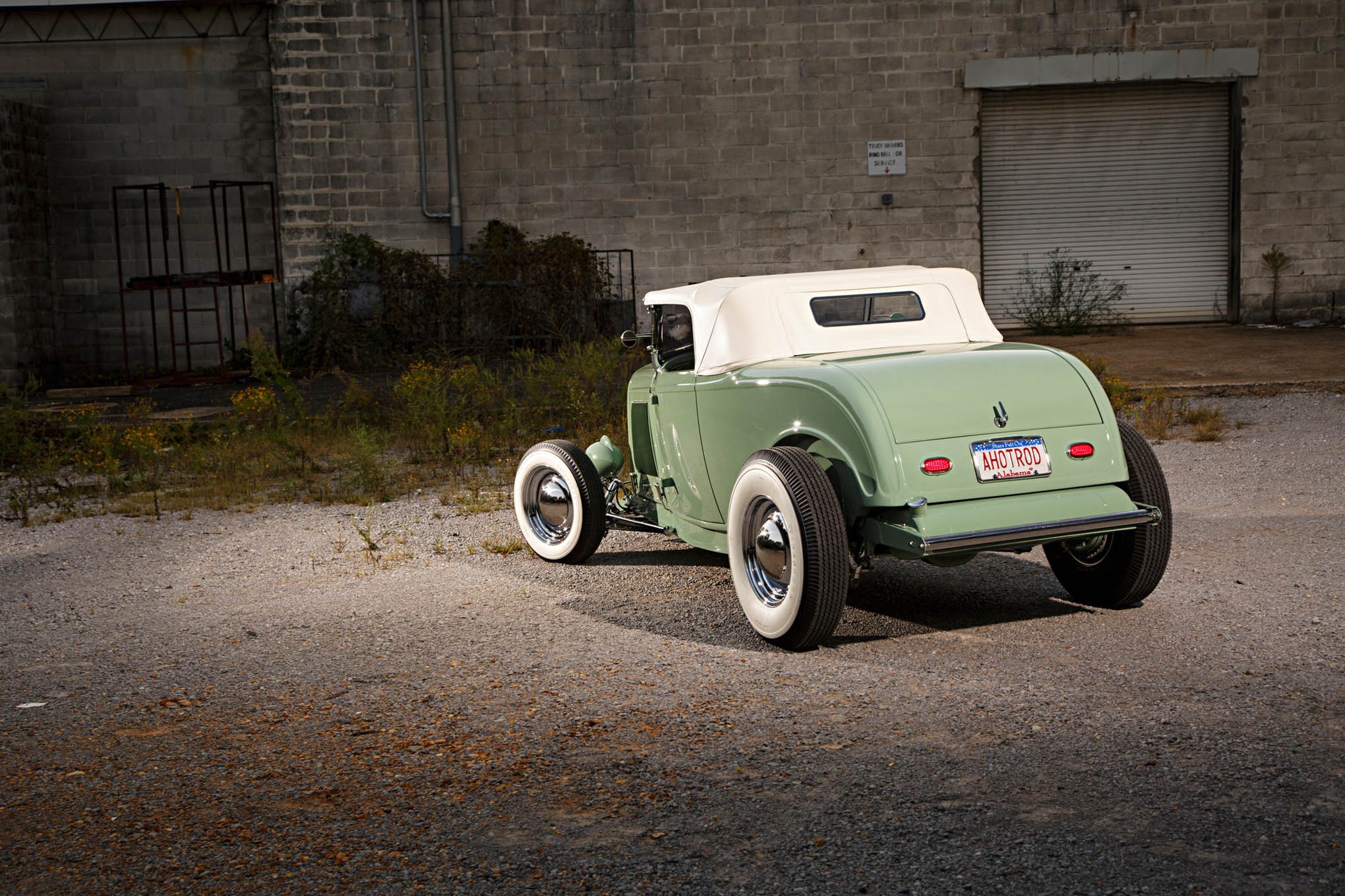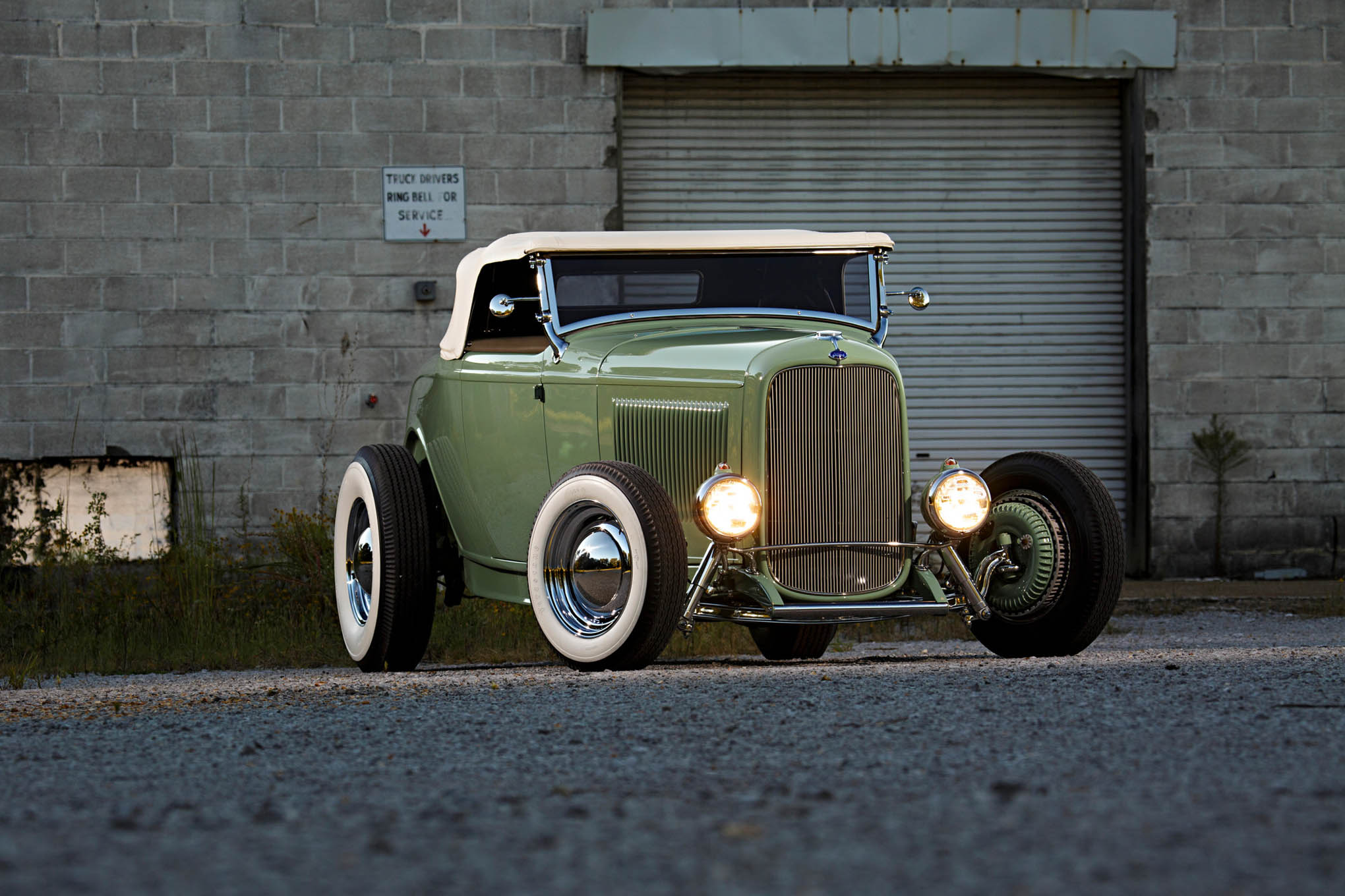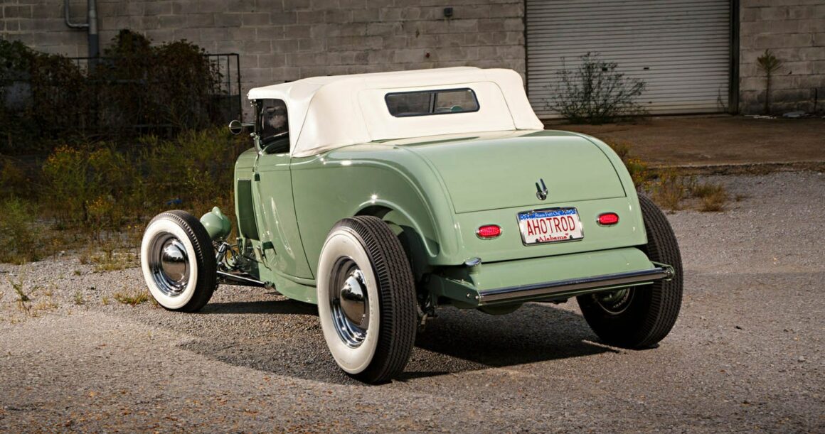 -Un arceau de sécurité caché à six points entoure l’intérieur plissé vertical en cuir vert et crème cousu par la tondeuse interne de Johnson-Hot-Rod-Shop, Maria Garcia, une super sexy avec qui j’ai passé des moments inoubliables ! La moquette verte à tissage carré recouvre le sol et aide à retenir la chaleur. Il y a aussi l’air-co Vintage-Air. Le tableau de bord est en aluminium Lokar-Goolsby de style Auburn avec inserts en nacre. La capote hachée vient de chez Rod-Tops d’Ellsworth, dans le Michigan.