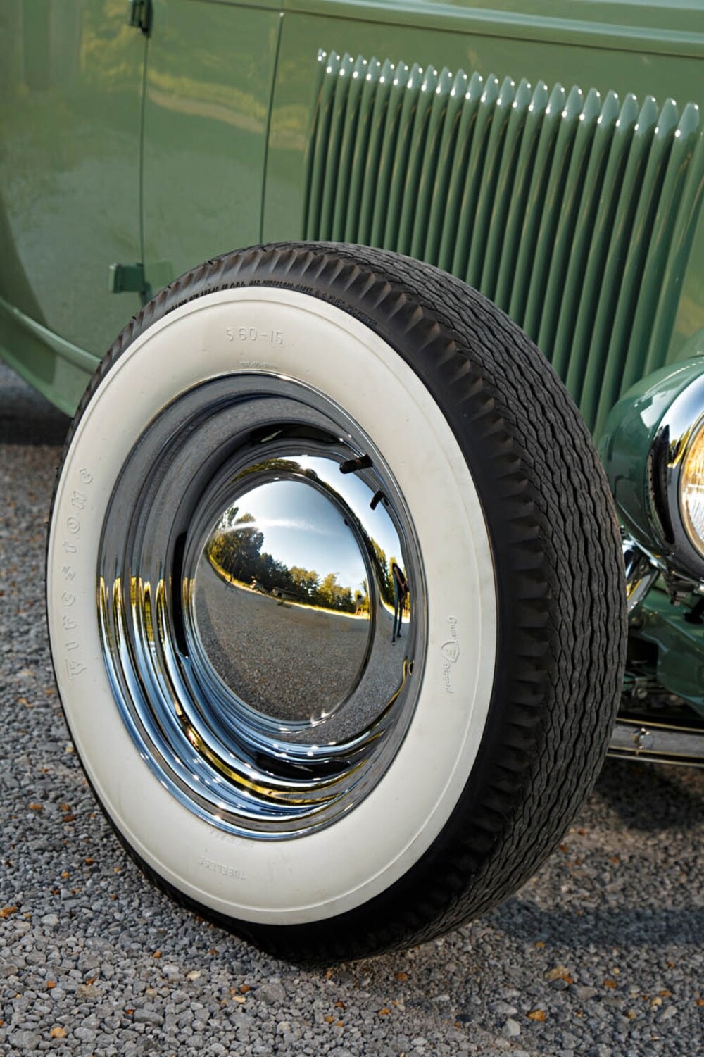 -Pour la suspension avant d’une Ford de 1932, il n’y a rien de mal avec un essieu rigide, surtout si l’on veut garder ce look de Hot-Rod à l’ancienne. C’est un essieu de chez Super Bell avec des amortisseurs télescopiques chromés. La direction se fait via un boîtier de direction Borgeson tourné avec une colonne de direction ididit surmontée d’un volant Johnson Hot-Rod-Shop Modern Vintage peint en ivoire. Freins à tambour pur-jus. Les freins avant sont des freins Kinmont Safety Stop, qui, d’un point de vue technique, se traduisent par des freins à disque de 10,5 pouces avec étriers à quatre pistons. Les jantes avant sont 15×5 Wheel Vintiques 15 Series Gennie Chrome avec baby Moons chaussés de 500/15 Coker Firestone avec des flancs blancs. Les phares à faisceau sont scellés par des LED modernes. L’arrière-du Wesley 1932 est suspendu avec des pièces Posies avec des amortisseurs télescopiques chromés. Le freinage arrière est un système de freinage Ford de 10 pouces recouvert d’un cache peint. Les jantes arrière sont des 16×6 Wheel Vintiques 16 Series Gennie Chrome avec des bébés Lunes montés avec des 850/16 Coker Firestone également à flancs blancs.