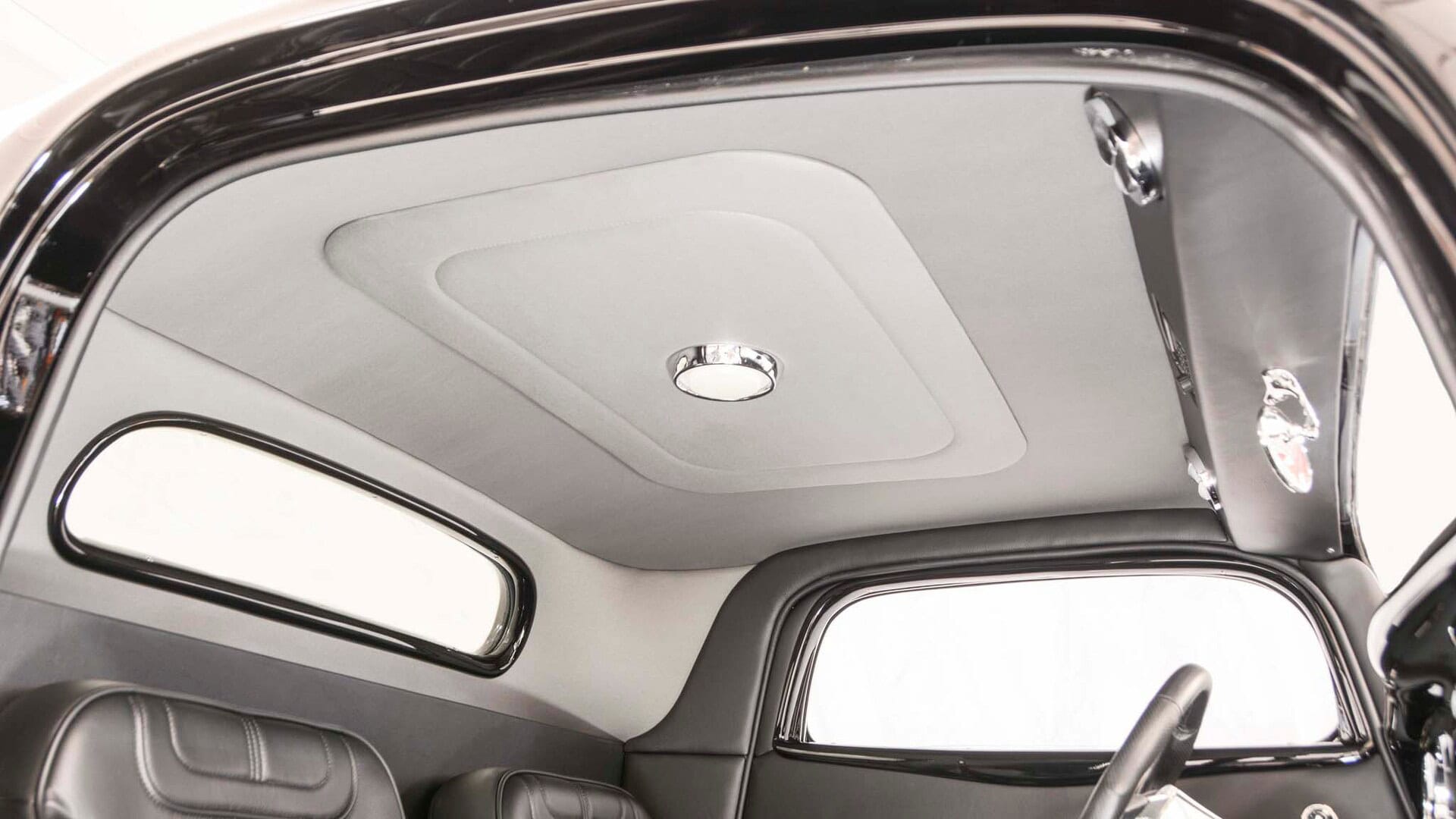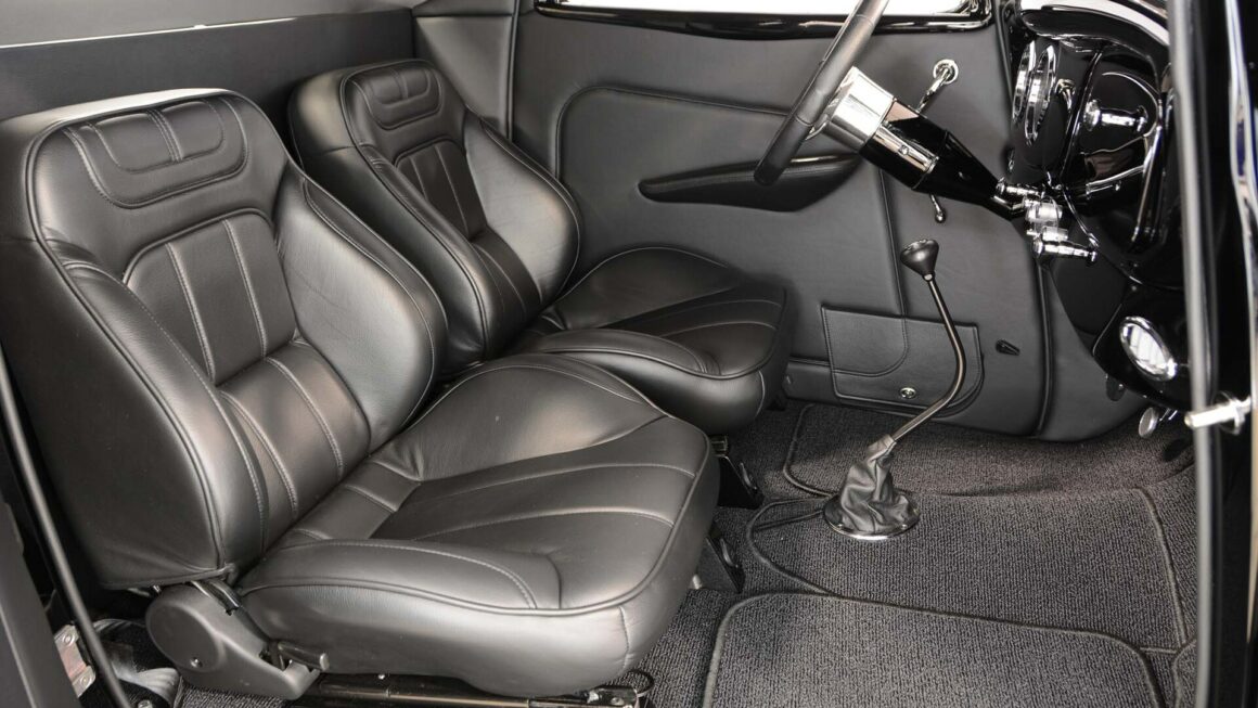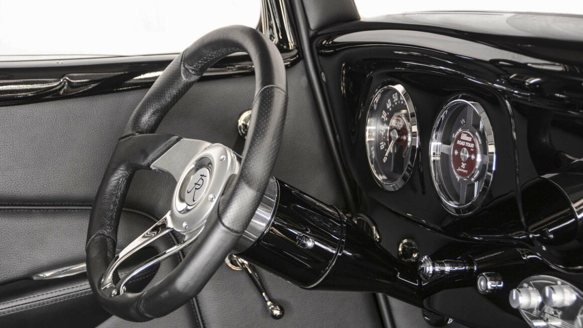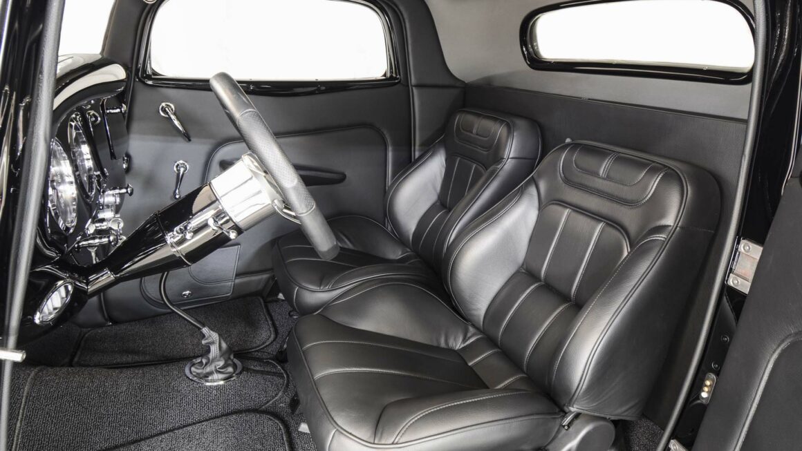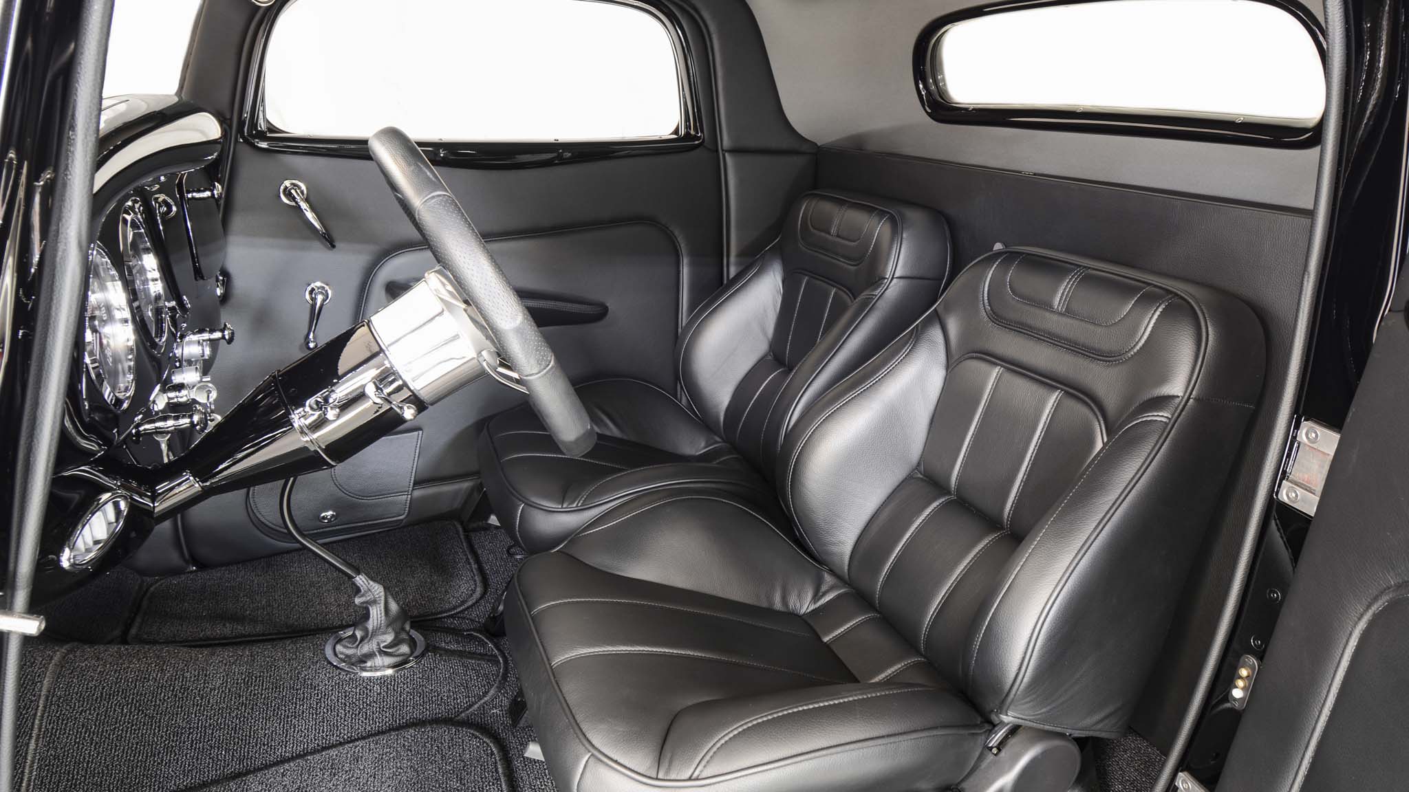 Ce design “miséreux” inadapté, n’est toutefois pas une réplique de la voiture originale, maintenant célèbre sous le nom de “Blue Skunk”… La saveur est similaire, mais de nombreux détails sont différents. La carrosserie du coupé Redneck est fabriquée avec le toit pré-surbaissé. La coque et l’insert de calandre Ford Alumicraft 1933 sur cette voiture, combinés au capot de 1933 (persiennes incurvées contrairement aux persiennes droites d’une 34), sont susceptibles de déclencher quelques débats sur l’année revendiquée de la réplique du roadster, mais c’est un ’34 qui n’a rien de 1934… United Pacific Industries a fourni les ailes avant et arrière en acier estampé de calibre 20, les lentilles de phares à LED et les baquets Dietz, ainsi que les feux arrière à LED.