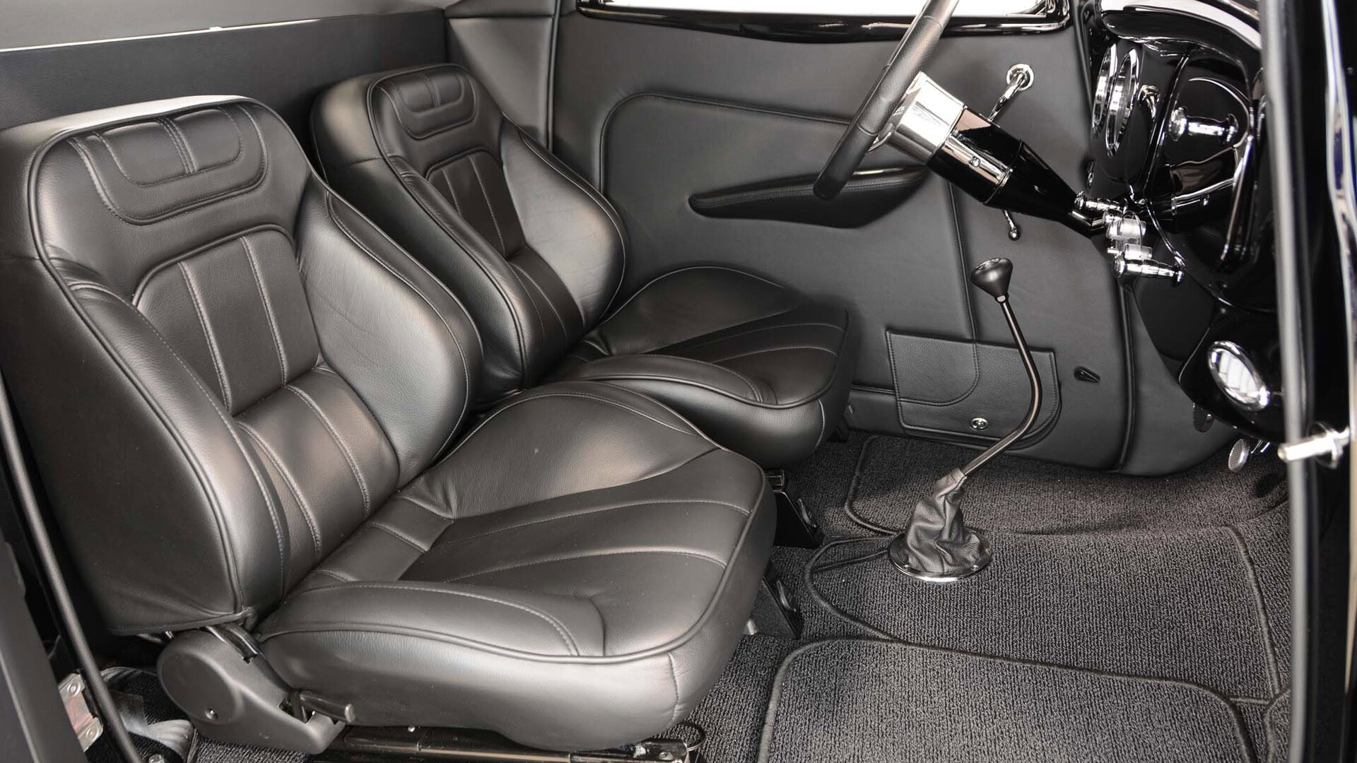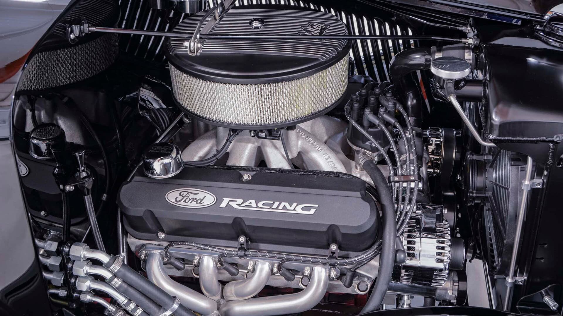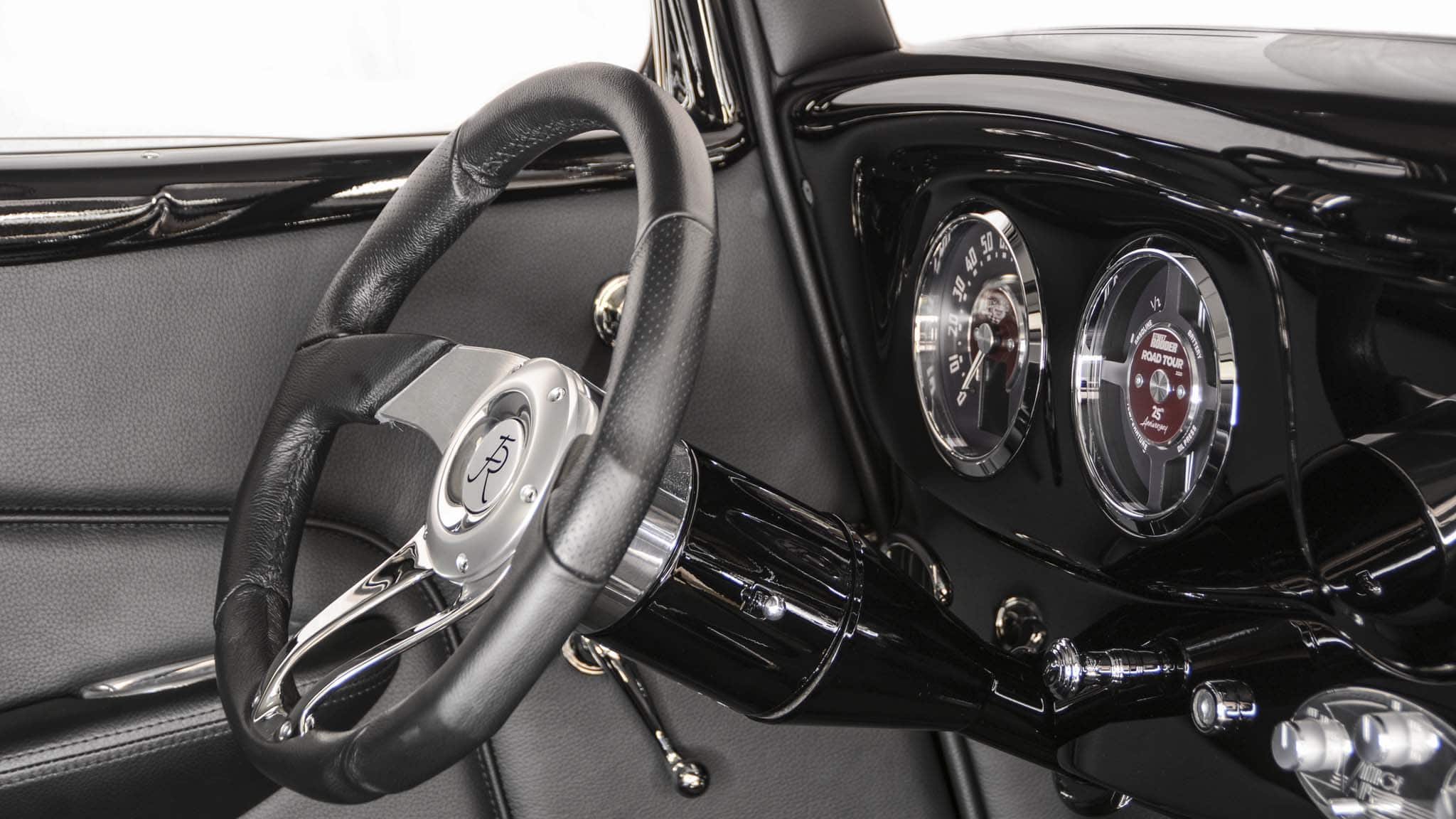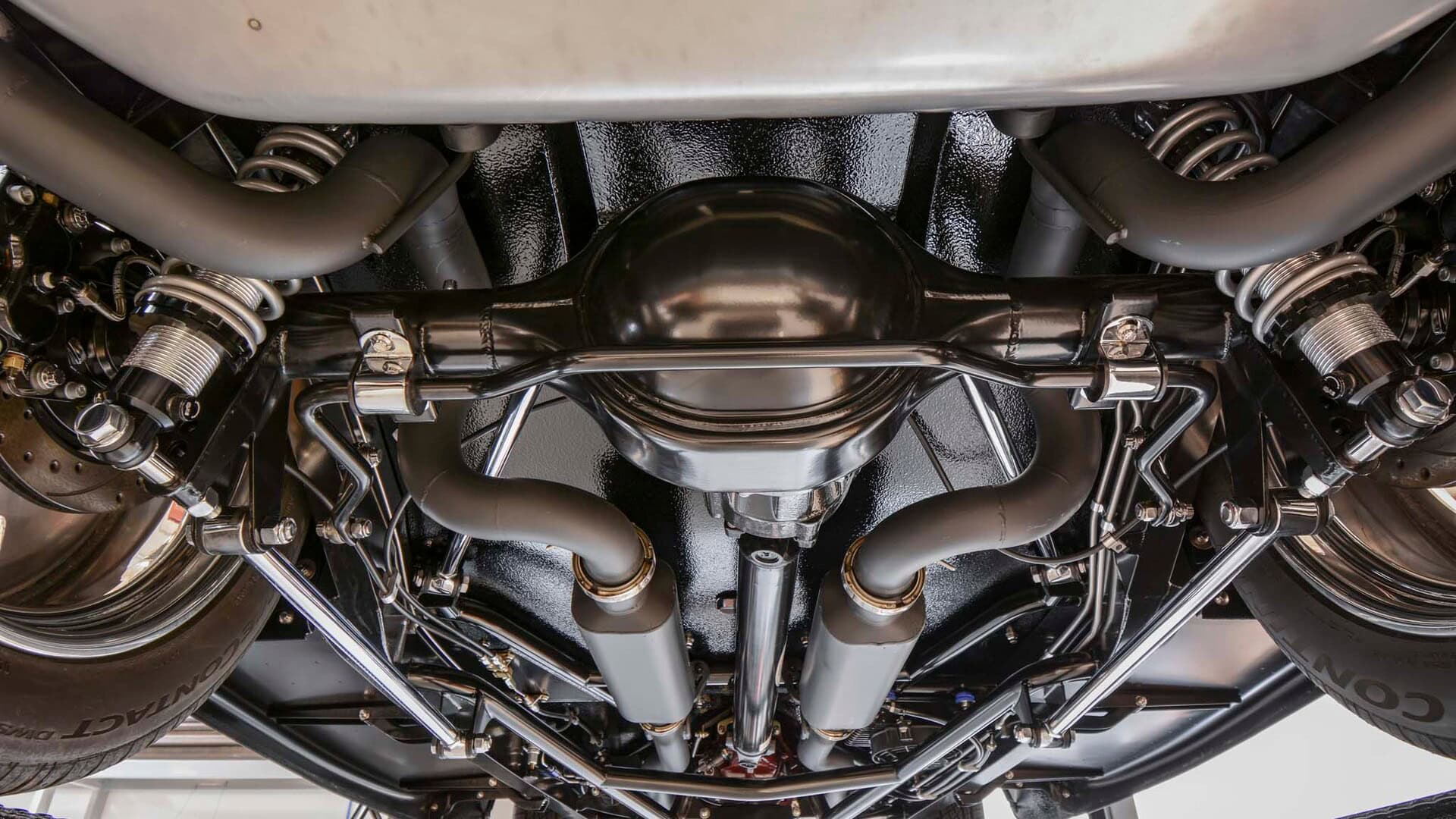 La société Precision a enlevé les cloques du bac d’éclaboussures arrière en acier United Pacific et a découpé des encoches pour les embouts d’échappement en acier inoxydable Flowmaster. En plus de la traverse, Pete & Jake’s a fourni les axes de style 1937 à 1941 avec des bras de direction boulonnés, un essieu Super Bell abaissé de 4 pouces et les amortisseurs avant. Flaming River a fourni des composants de direction, notamment la boîte de style Vega et le bras Pitman, conçus pour les applications de street rod’s. À l’arrière, un John’s Industries 9 pouces en 3,50 :1 est guidé par une suspension triangulée à quatre barres, également de P&J, plus une barre antiroulis et une paire de combinés filetés QA1. Les freins à disque avant et arrière sont de chez Wilwood.