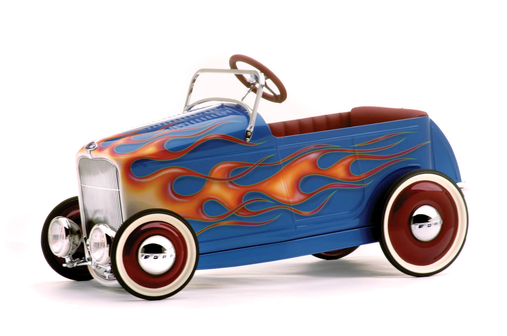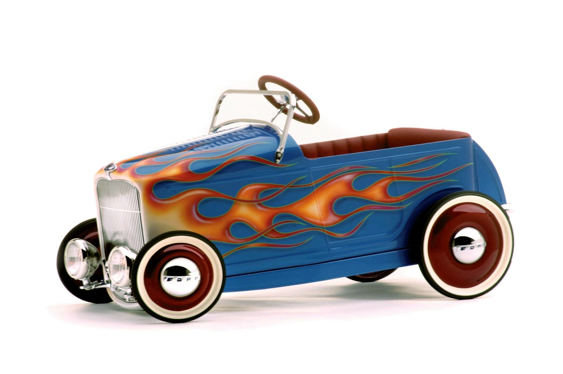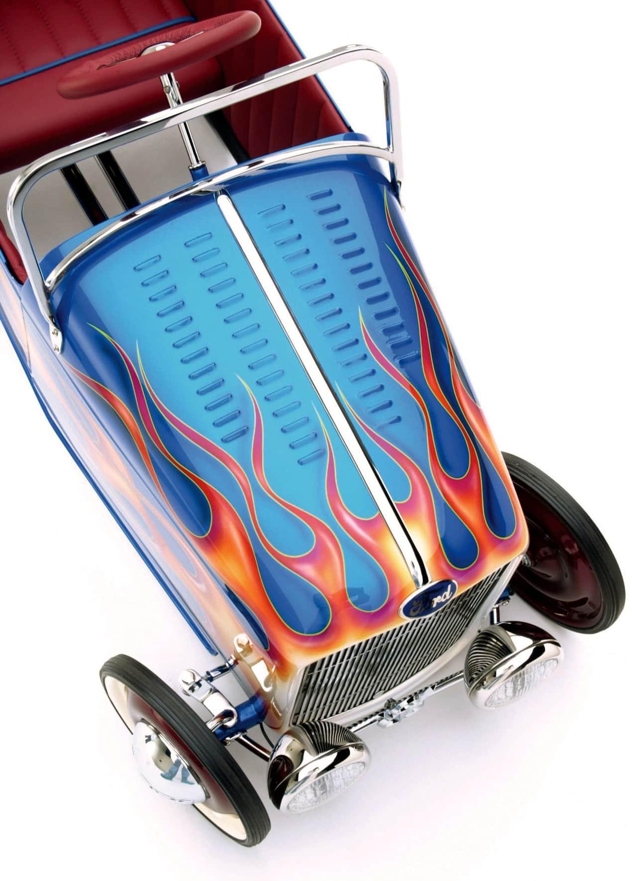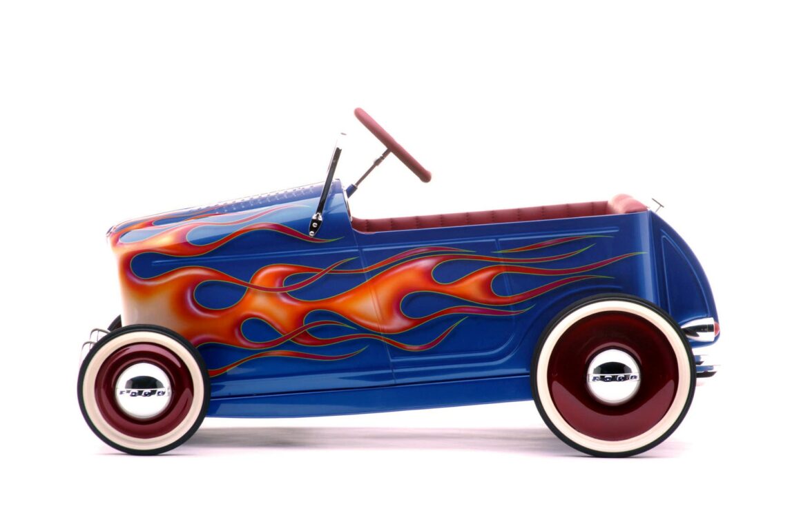 Les voitures à pédales que vous voyez illustrées ici sont pour la plupart mes vieux jouets restaurés qui m’ont poussé à écrire tout ce qui précède. L’un d’entre-eux, bleu clair avec flammes est l’œuvre unique de Roy Brizio Street Rods, l’un des constructeurs de Hot-Rods parmi les plus connus et respectés aux États-Unis et dans le monde. Le design est basé sur une Ford’32 Hi-Boy, avec une carrosserie entièrement métallique, des enjoliveurs chromés, deux (fausses) sorties d’échappement, des clignotants Arlen Ness, des phares et des feux arrière fonctionnels. Voilà, voilou ma “Filousophie”, mais bof ! J’en termine ici, la vie est courte, ne perdez plus votre précieux temps !