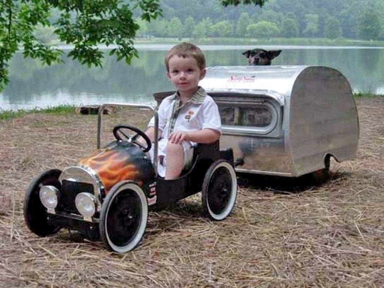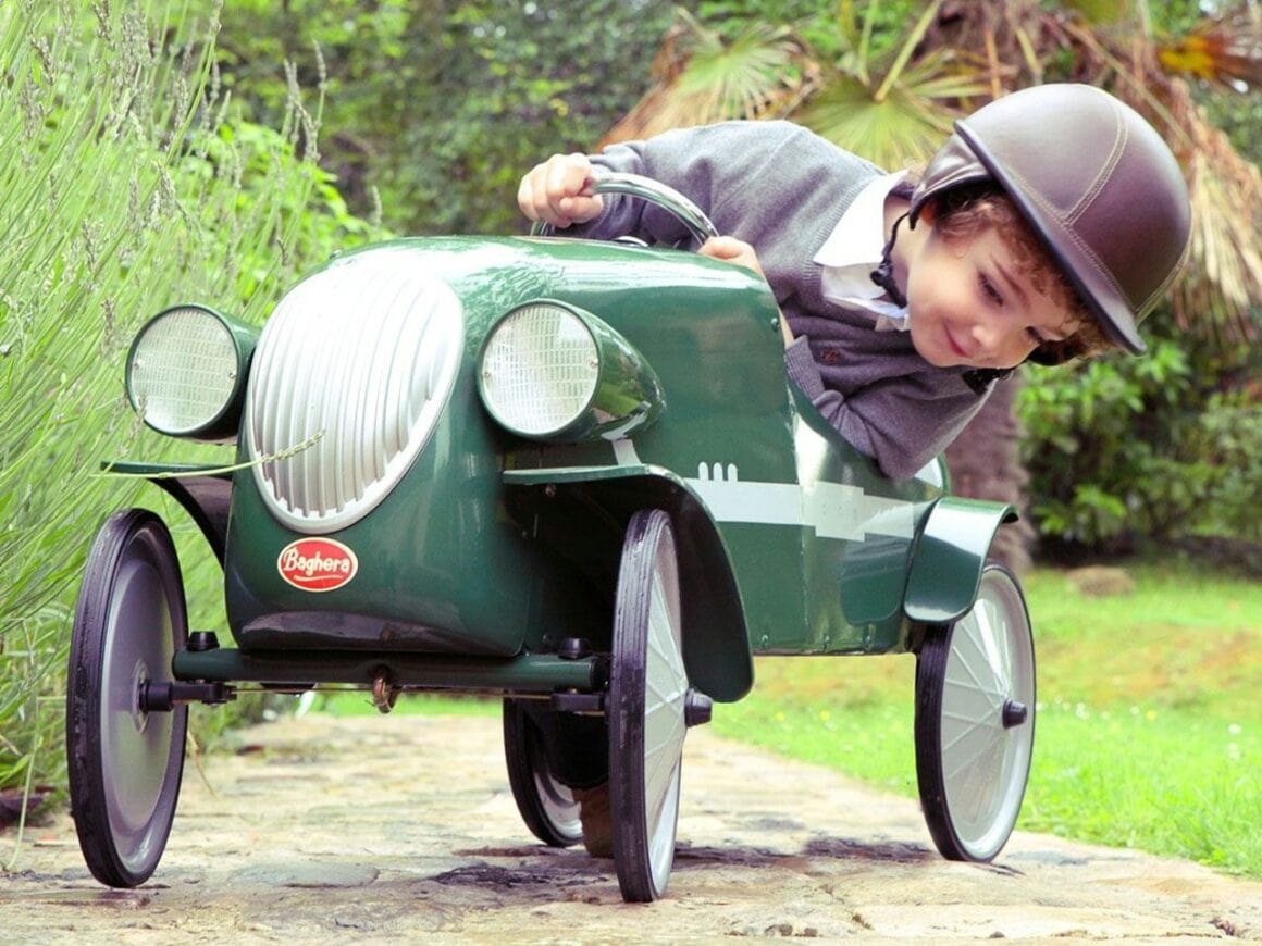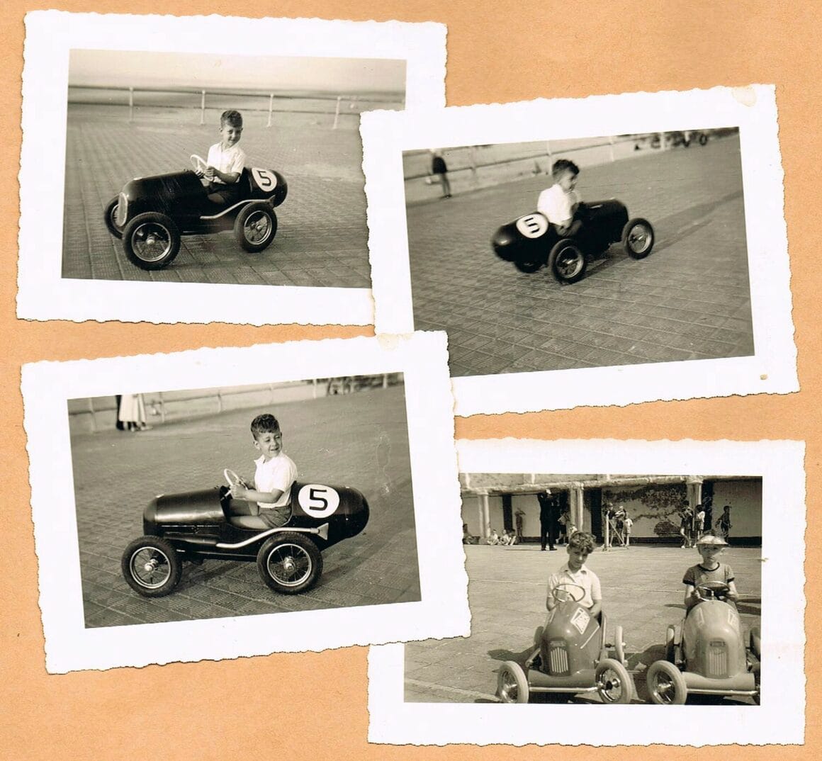 Quel lien y-a-t-il ?… Patience et lisez ! J’avais une voiture à pédale lorsque j’étais enfant, elle n’était pas en noir & blanc comme çi-dessus, mais rouge vif, en tôle et vaguement basée sur une voiture de course des années ’30. Alors que je n’existais pas encore (quoique c’est bien moi sur les 4 photos N/B), c’était le jouet de mon pépé du temps où il était gamin. Du moins c’est ce qu’il m’avait dit. Mais il m’avait menti pour que j’en prenne soin façon relique ! J’ai réalisé que je pouvais atteindre la vitesse d’une voiture de course en pédalant comme Fangio en descente de notre rue ou ne passaient presque jamais d’automobiles. J’allais encore plus vite en allant jusqu’au sommet d’une petite colline voisine, en remplissant mes poches de cailloux et me laissant descendre après un départ digne d’une équipe de bobsleigh vue aux actualités du cinéma de quartier. J’ai toujours les cicatrices comme preuve que c’était une activité extrêmement divertissante, jusqu’à ce que tout tourne mal…