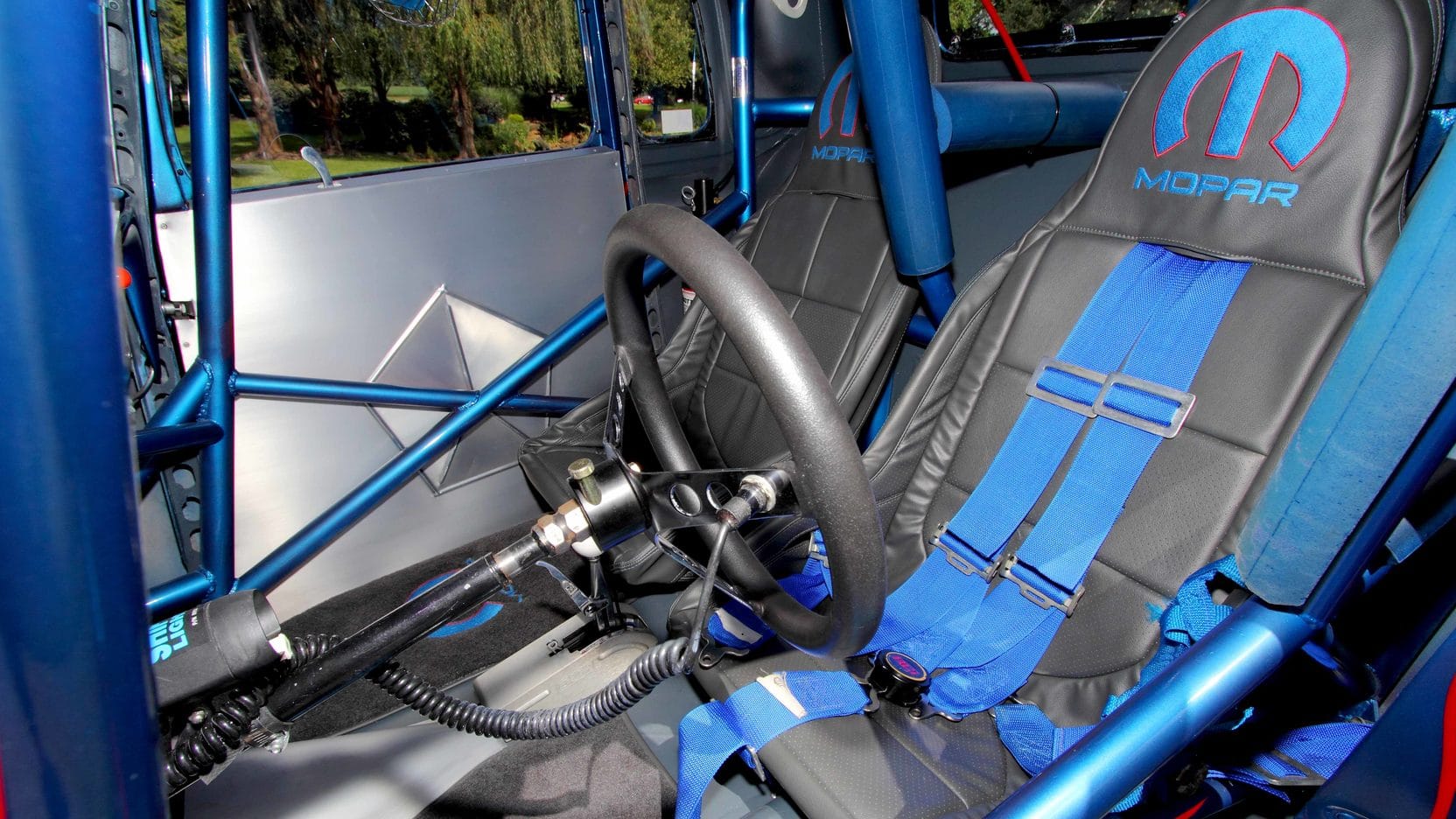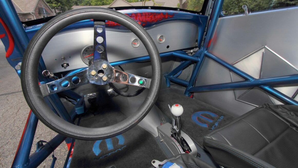 Des composants d’apparence centenaires tels que la suspension arrière de chez Chassis-works sont complétés de 4 bras et d’ amortisseurs hélicoïdaux AVO avec réglage complet possible. Les freins à disque Wilwood Racing sont aux quatre coins, visibles derrière les jantes avant à rayons polis. Les arrières larges et également (très) polis, accueillent de larges pneus Hoosier Quick Time Pro avec des bandes de roulement “glissantes”. L’intérieur est de type professionnel avec une cage de sécurité complète, des sièges rembourrés noirs avec des surpiqûres bleues sur le thème Mopar et des ceintures de course RCI.